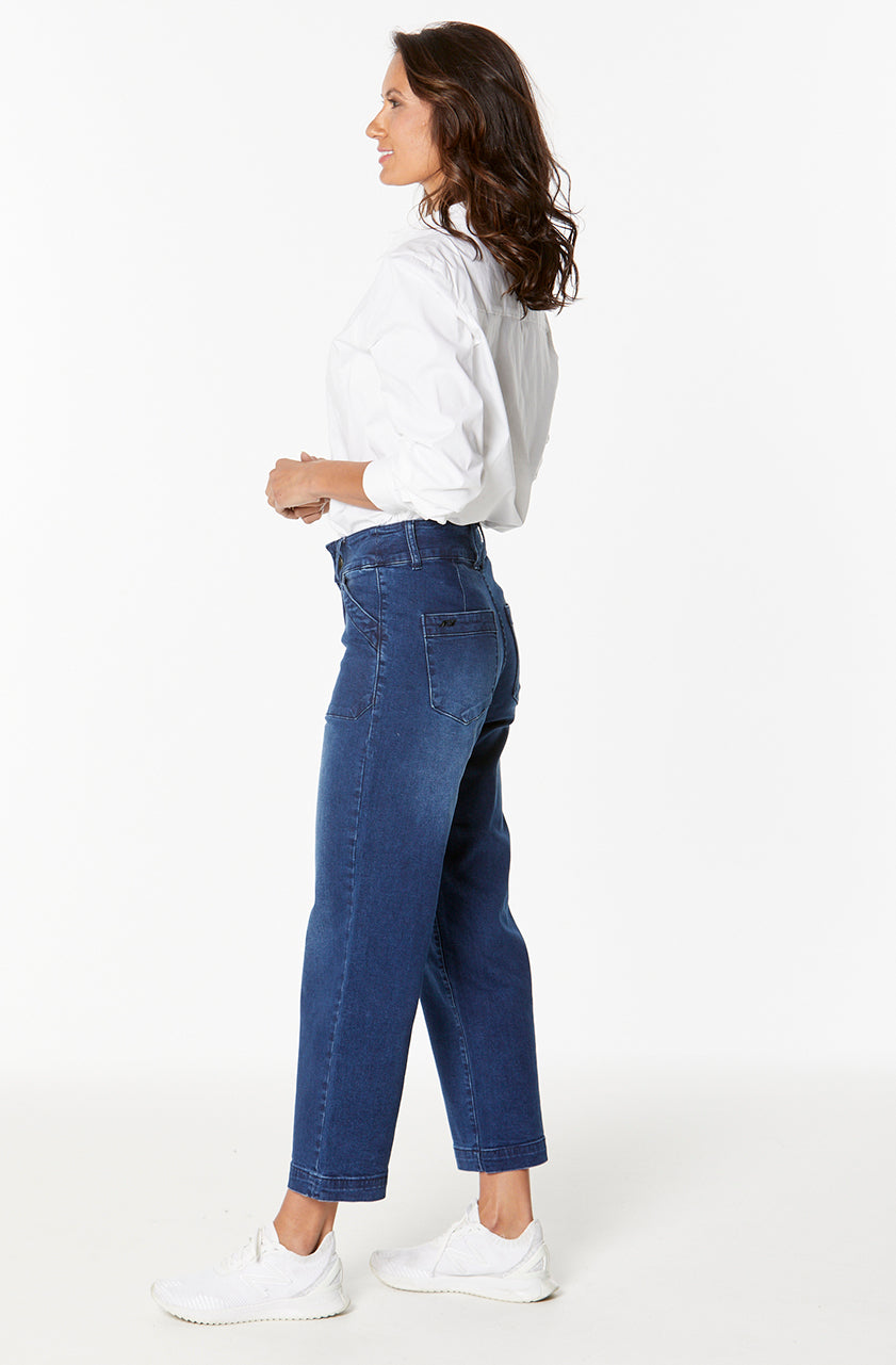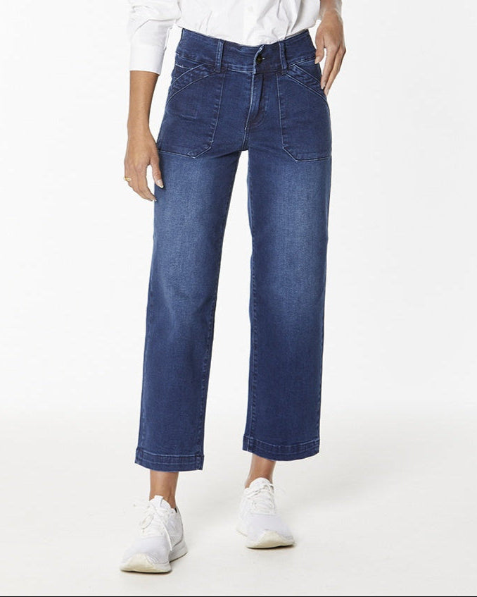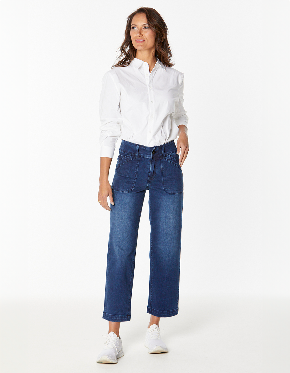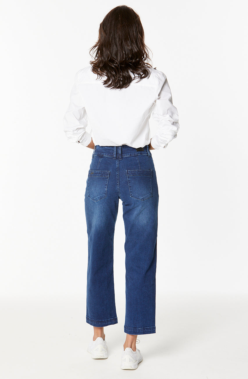 On trend wide leg ankle length jean in a lovely soft stretch denim.