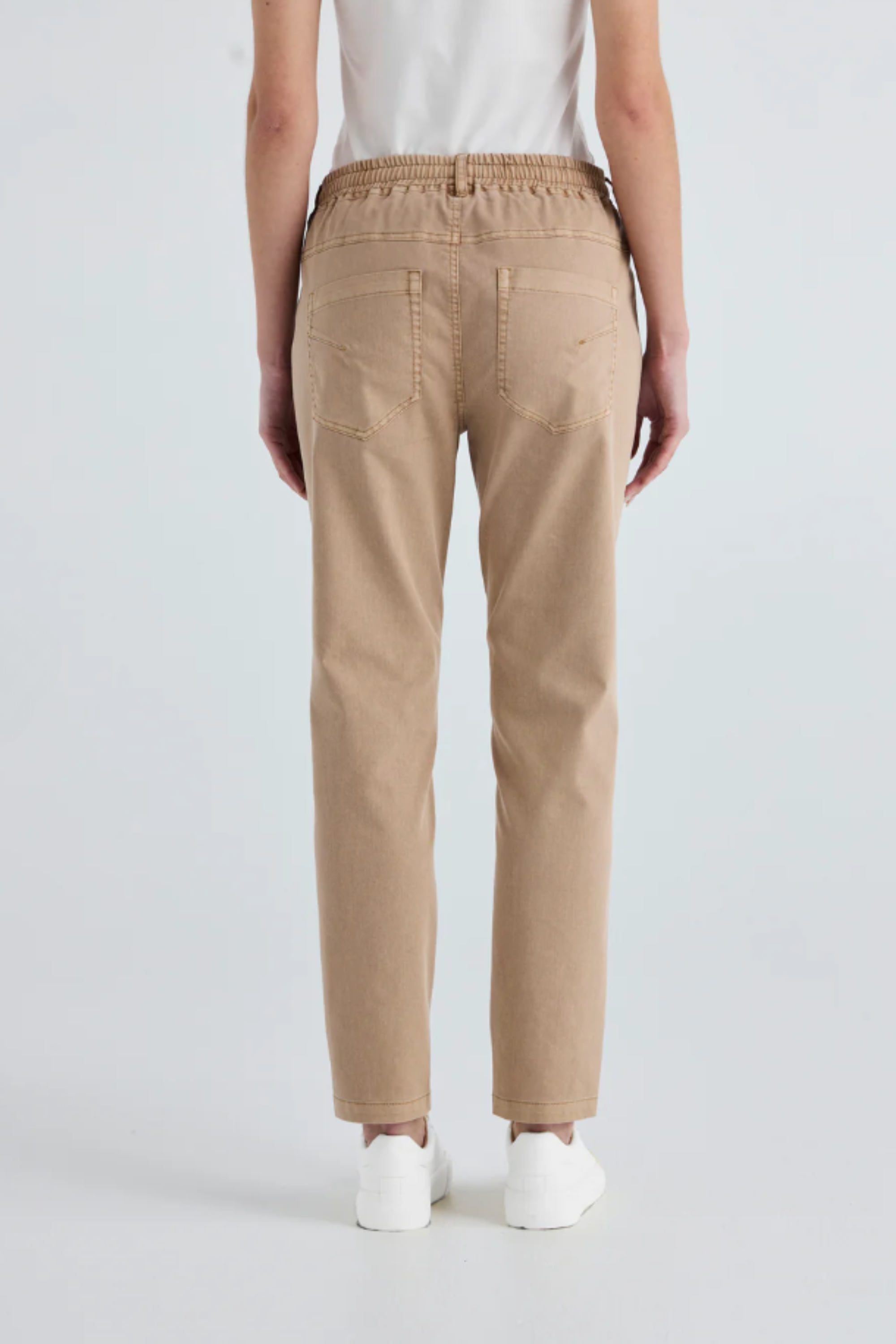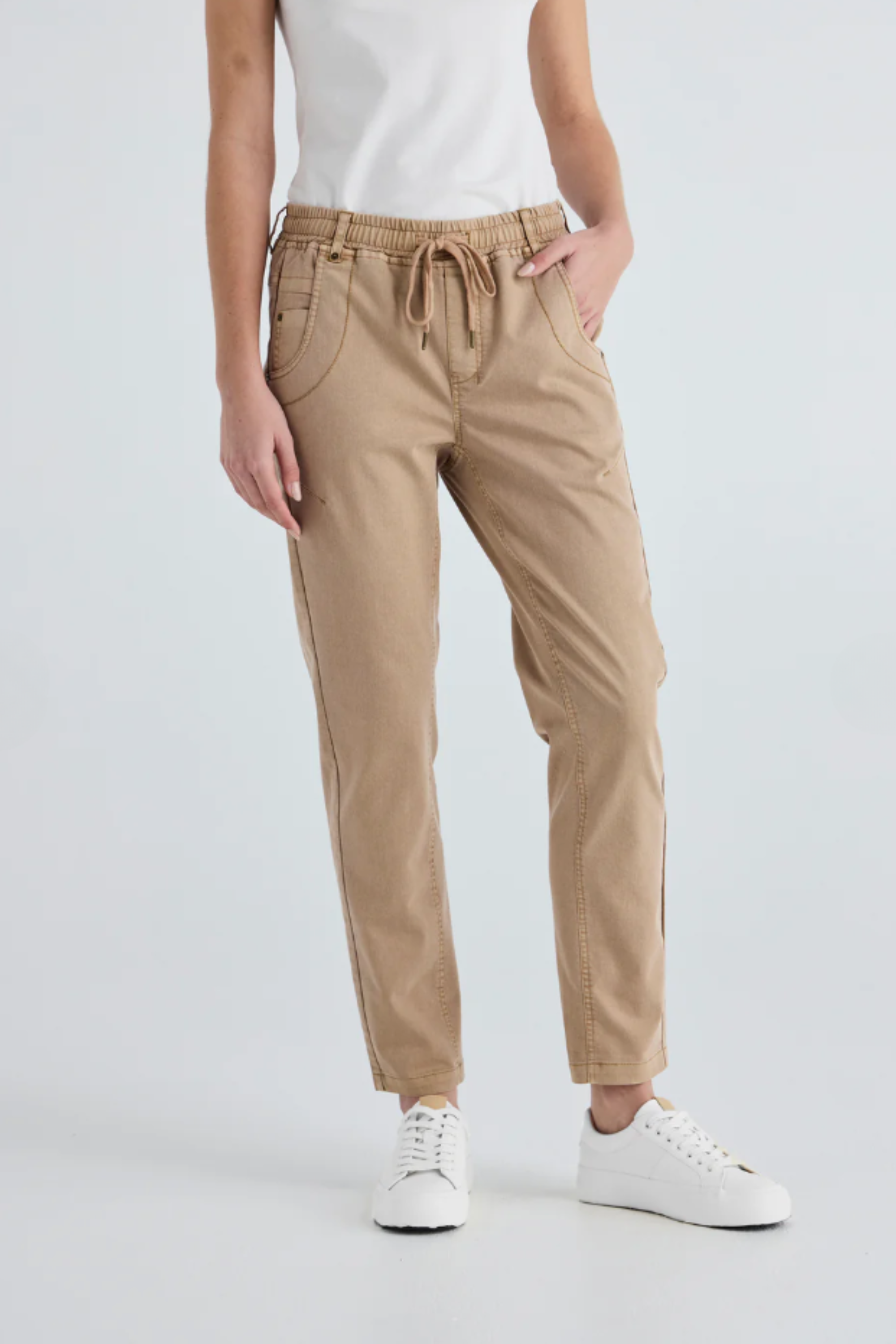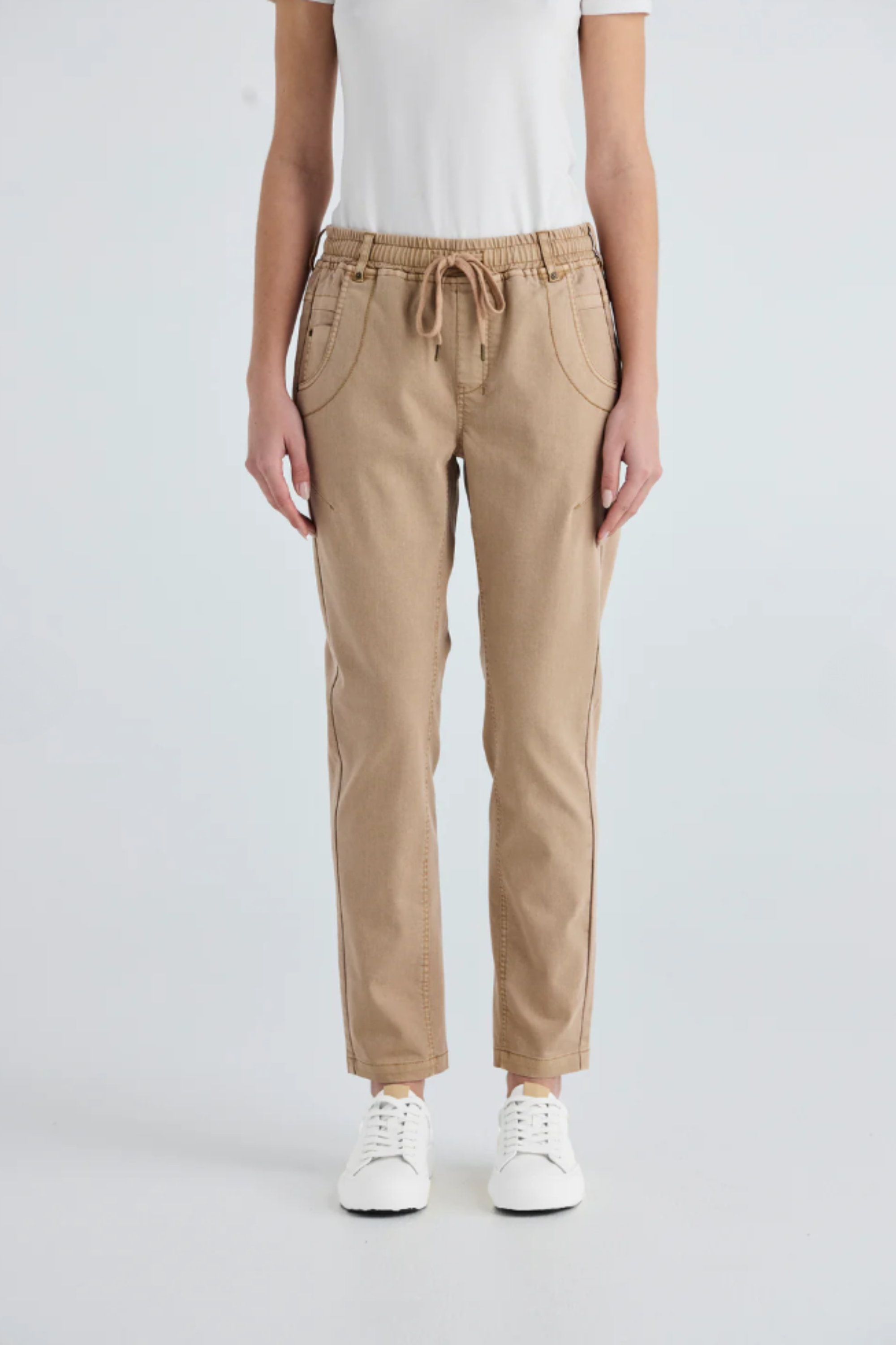 Casual jeans with an elasticated waist and adjustable drawstring tie. Soft handle and distressed finish is created by special garment dye wash.