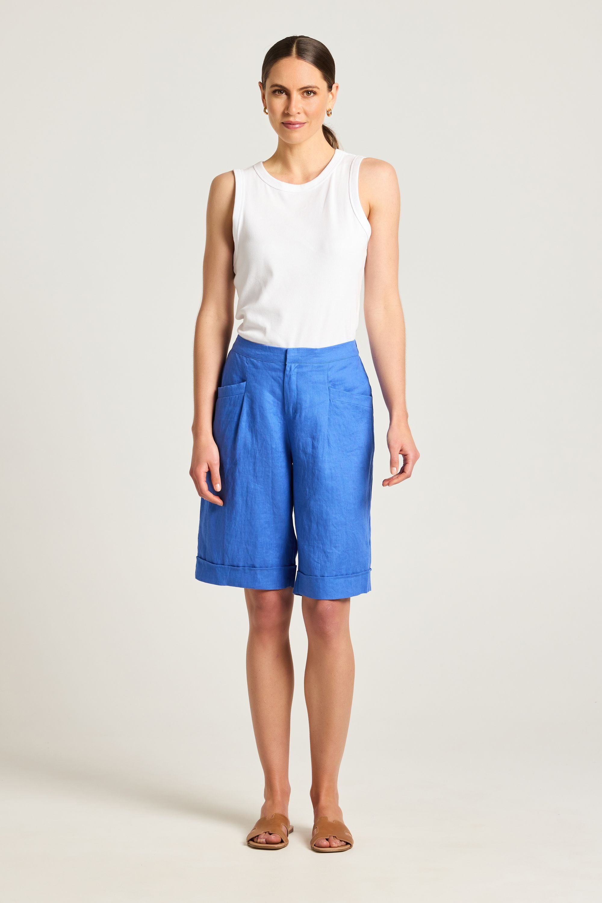 Elevate your summer style with these chic Bermuda shorts, crafted from 100% linen. Featuring single front pleats, angled side pockets, and a wide-band hem, they offer a contemporary look. Back patch pockets and a half-elasticated waistband add comfort and functionality.