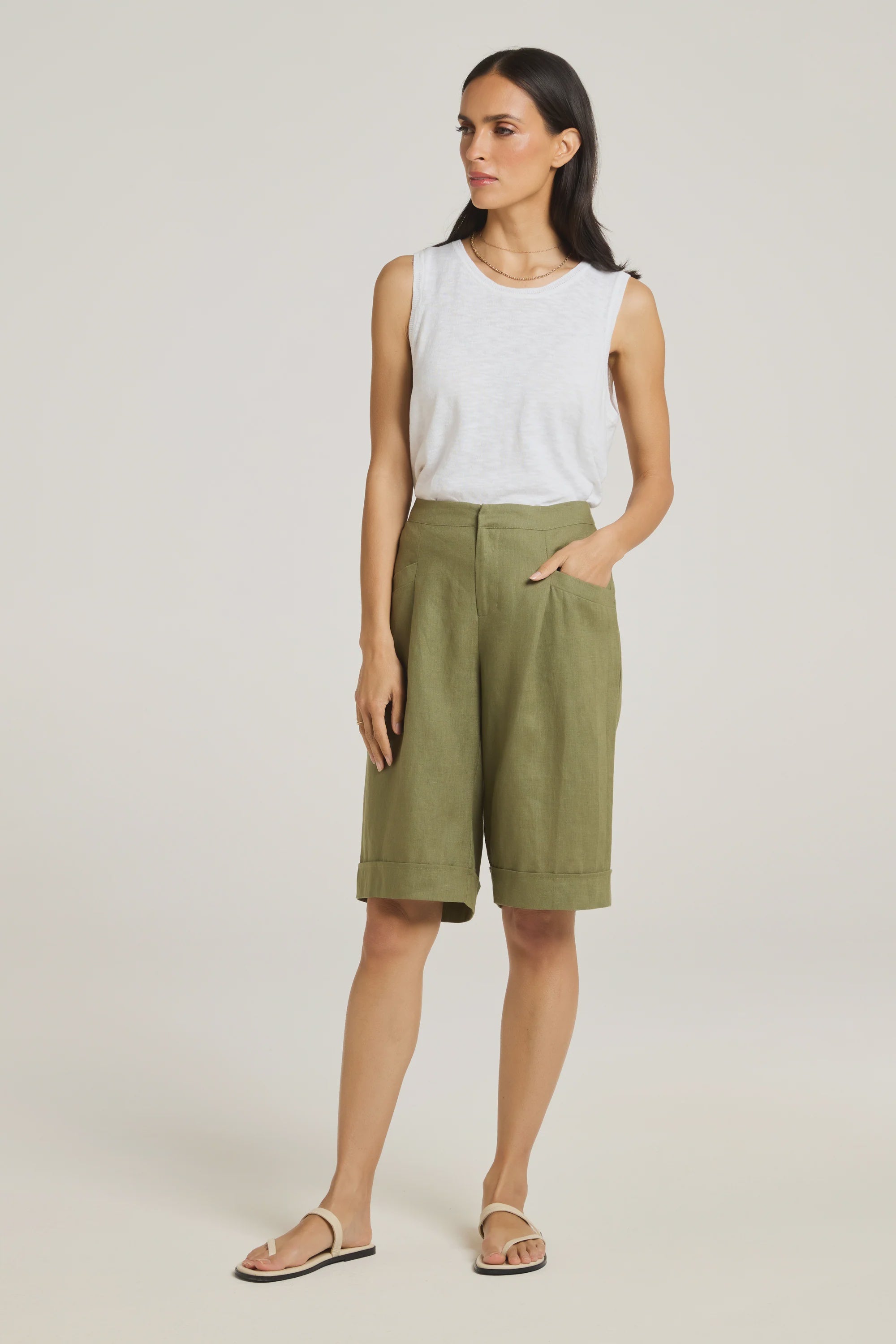 Elevate your summer style with these chic Bermuda shorts, crafted from 100% linen. Featuring single front pleats, angled side pockets, and a wide-band hem, they offer a contemporary look. Back patch pockets and a half-elasticated waistband add comfort and functionality.