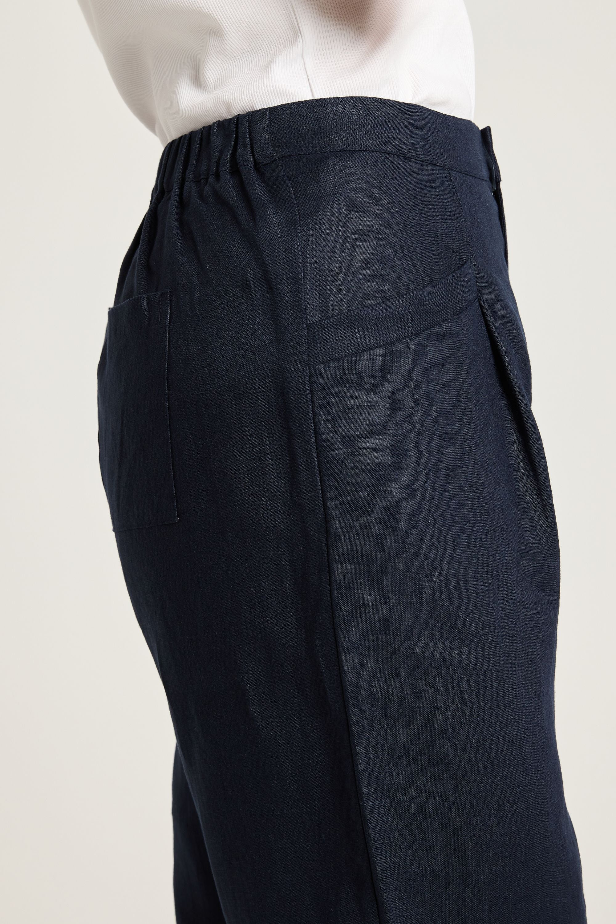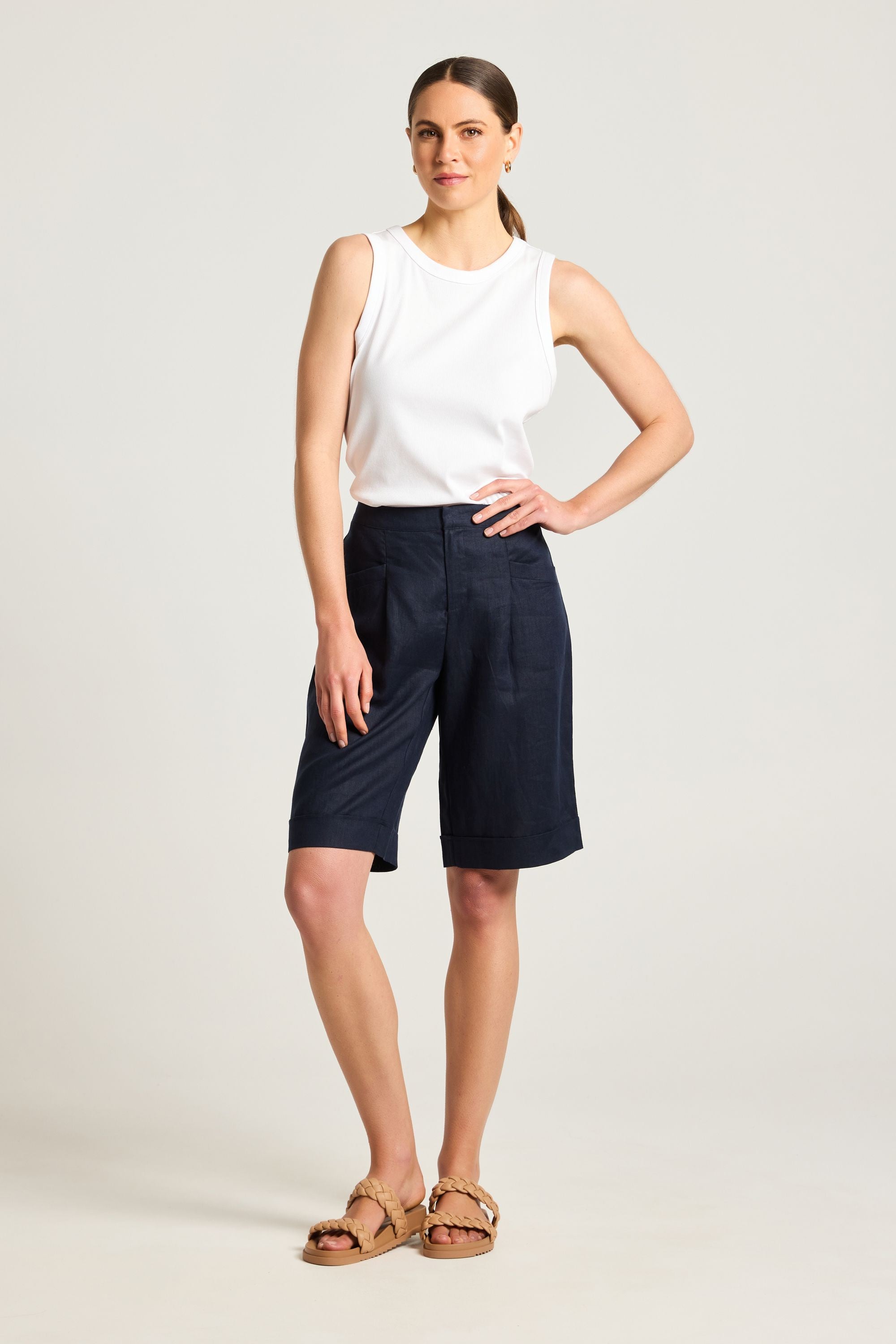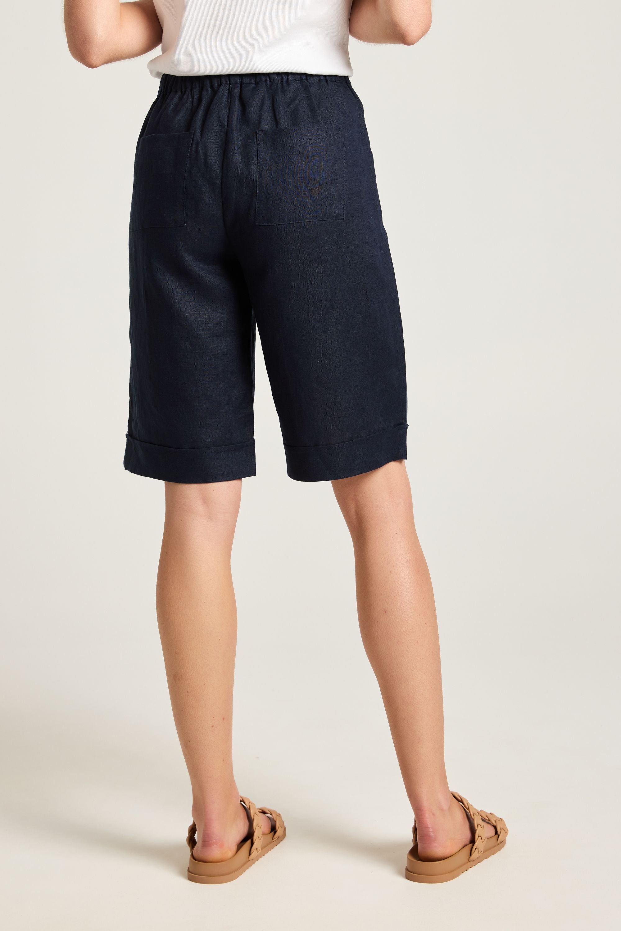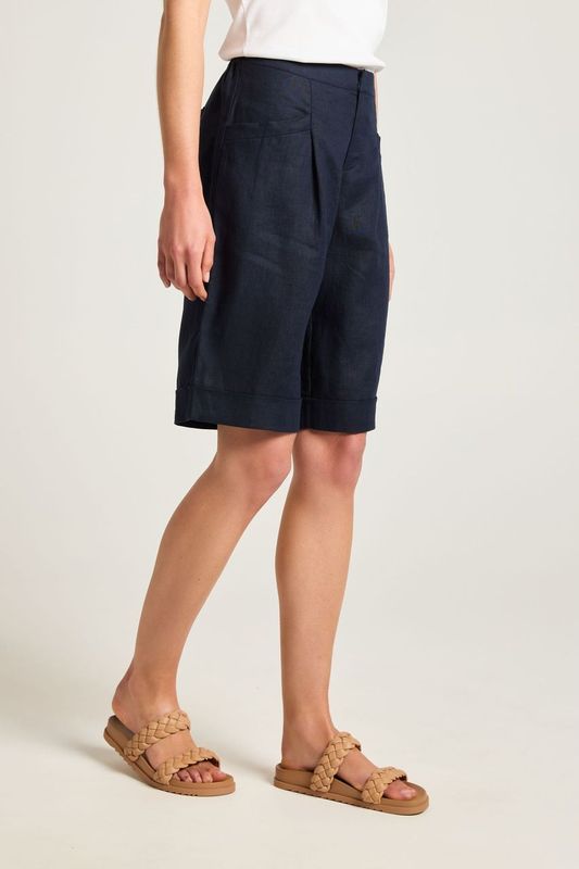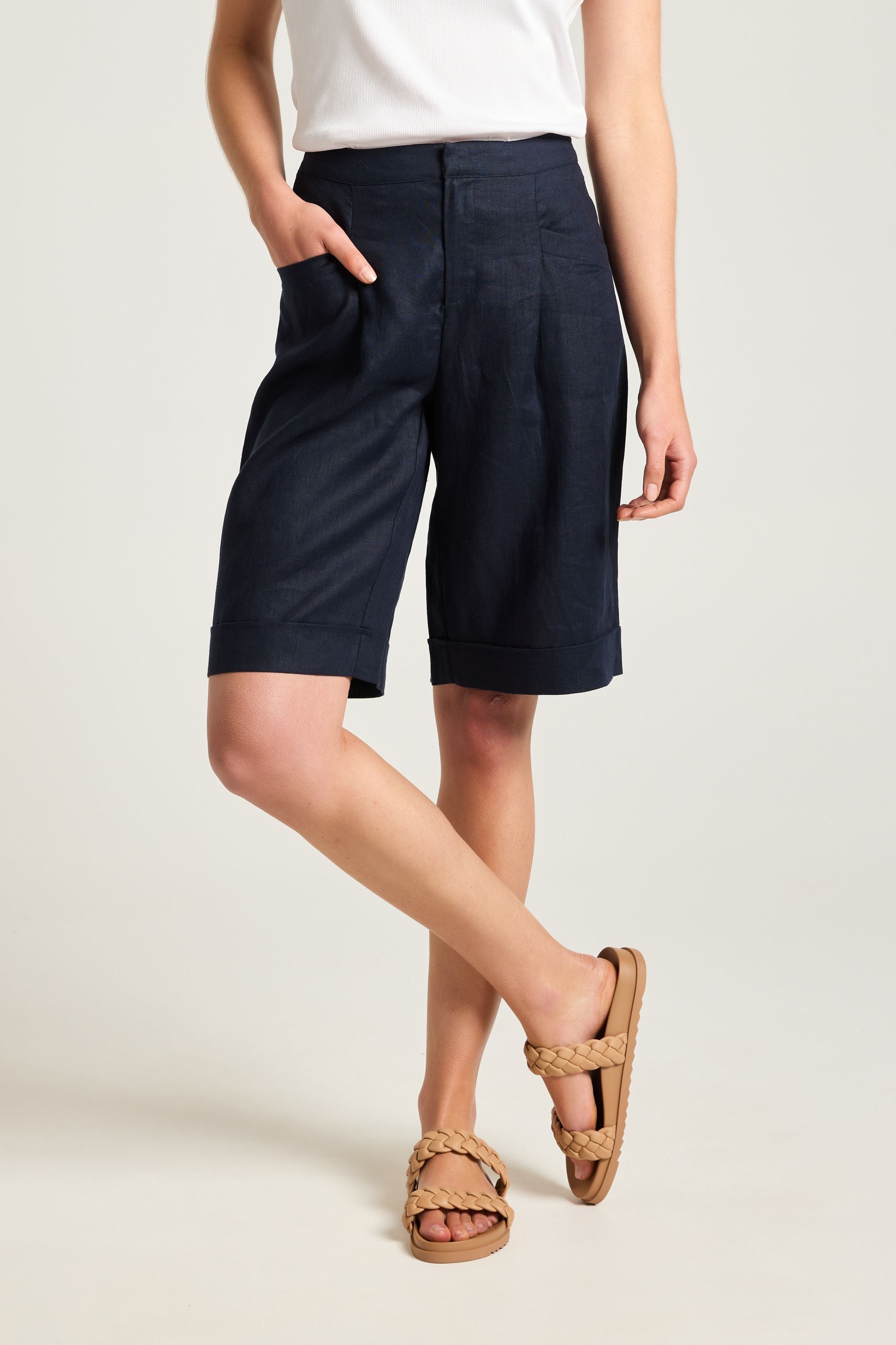 Elevate your summer style with these chic Bermuda shorts, crafted from 100% linen. Featuring single front pleats, angled side pockets, and a wide-band hem, they offer a contemporary look. Back patch pockets and a half-elasticated waistband add comfort and functionality.