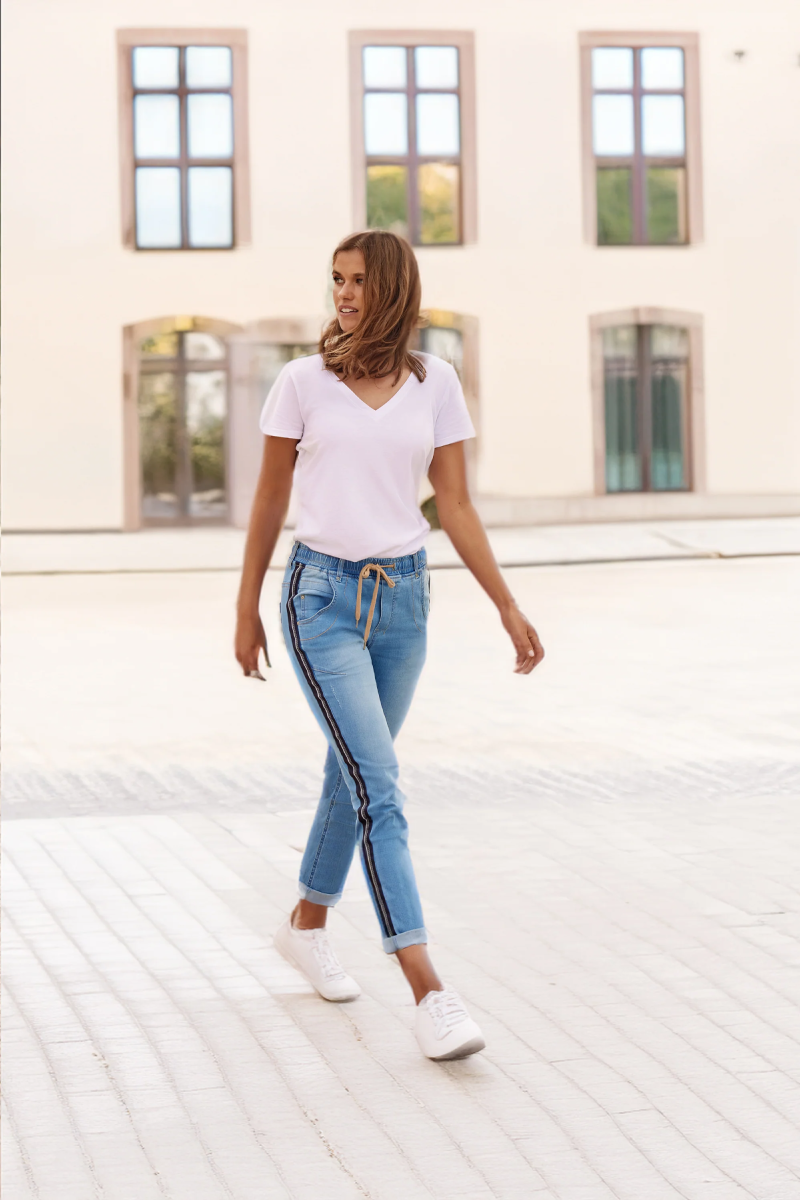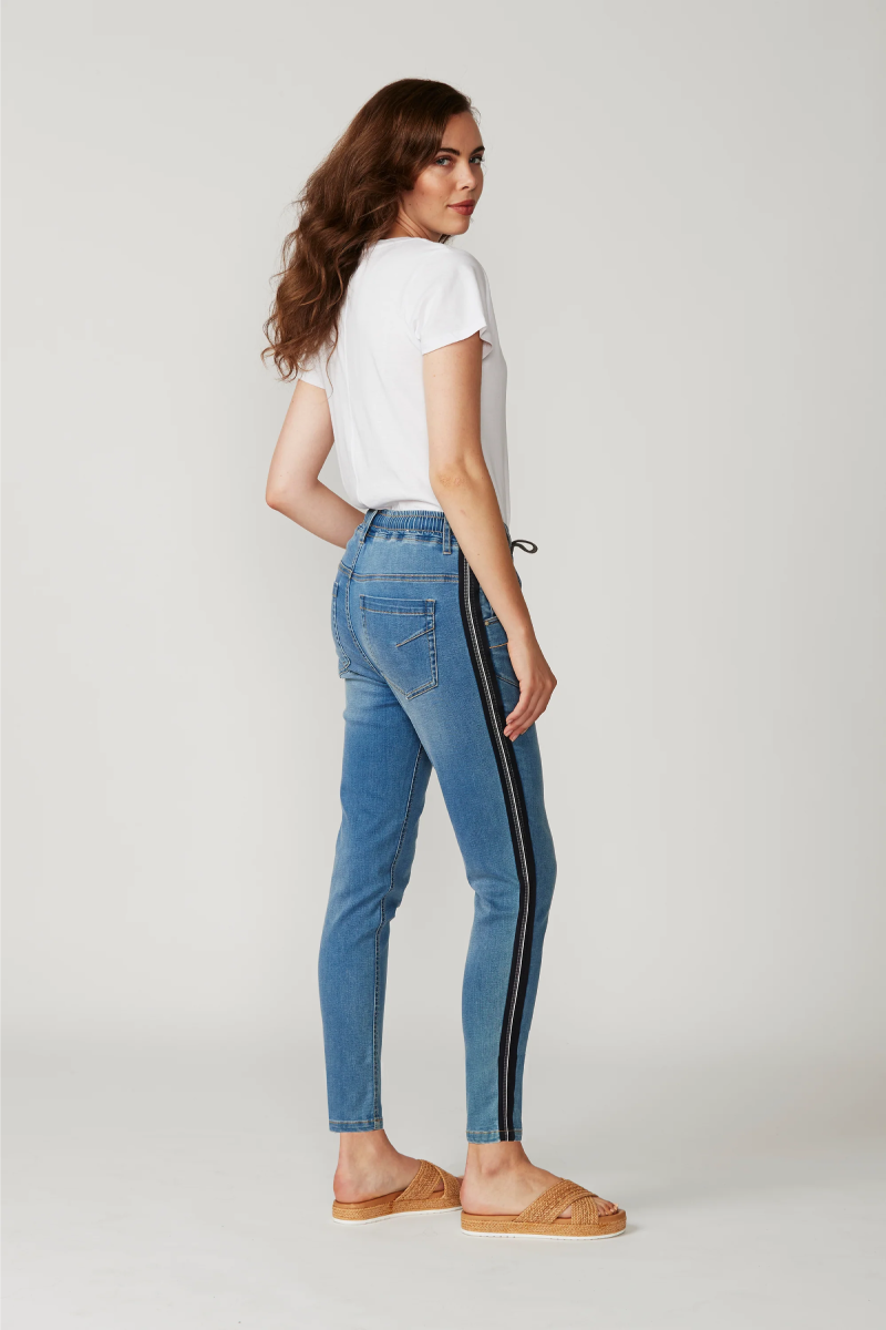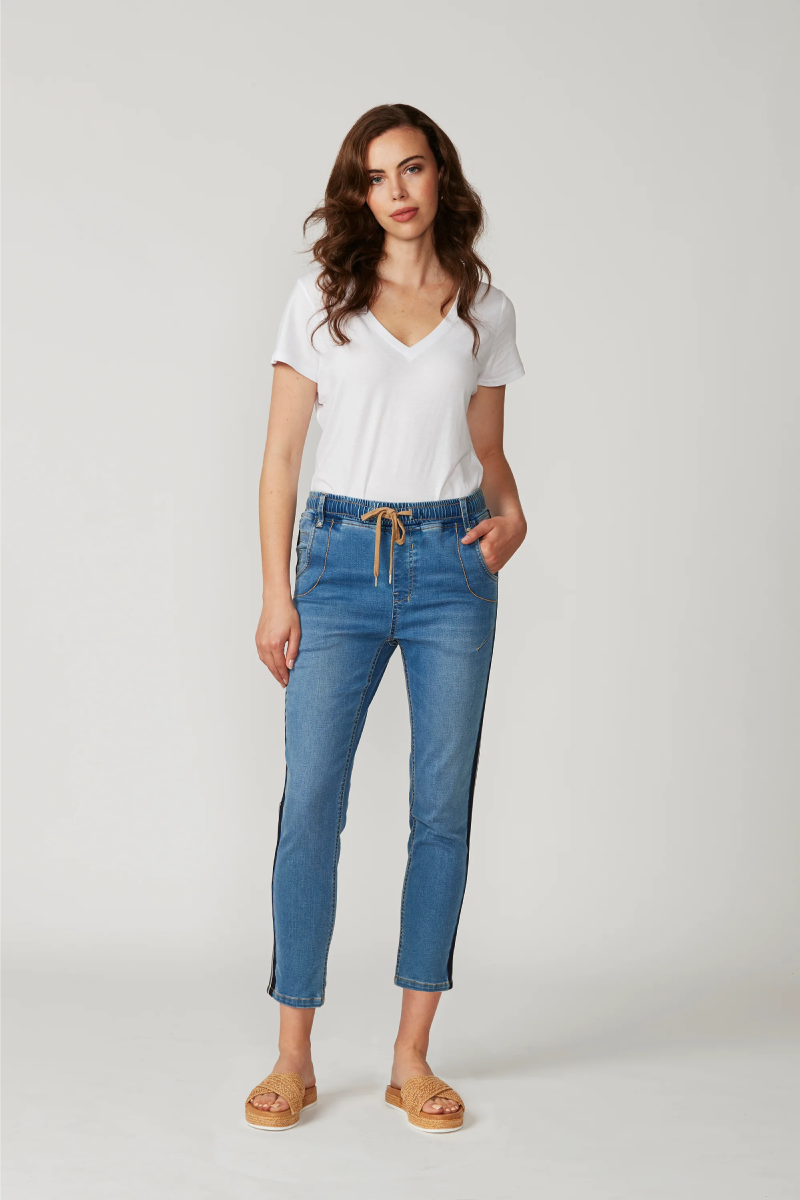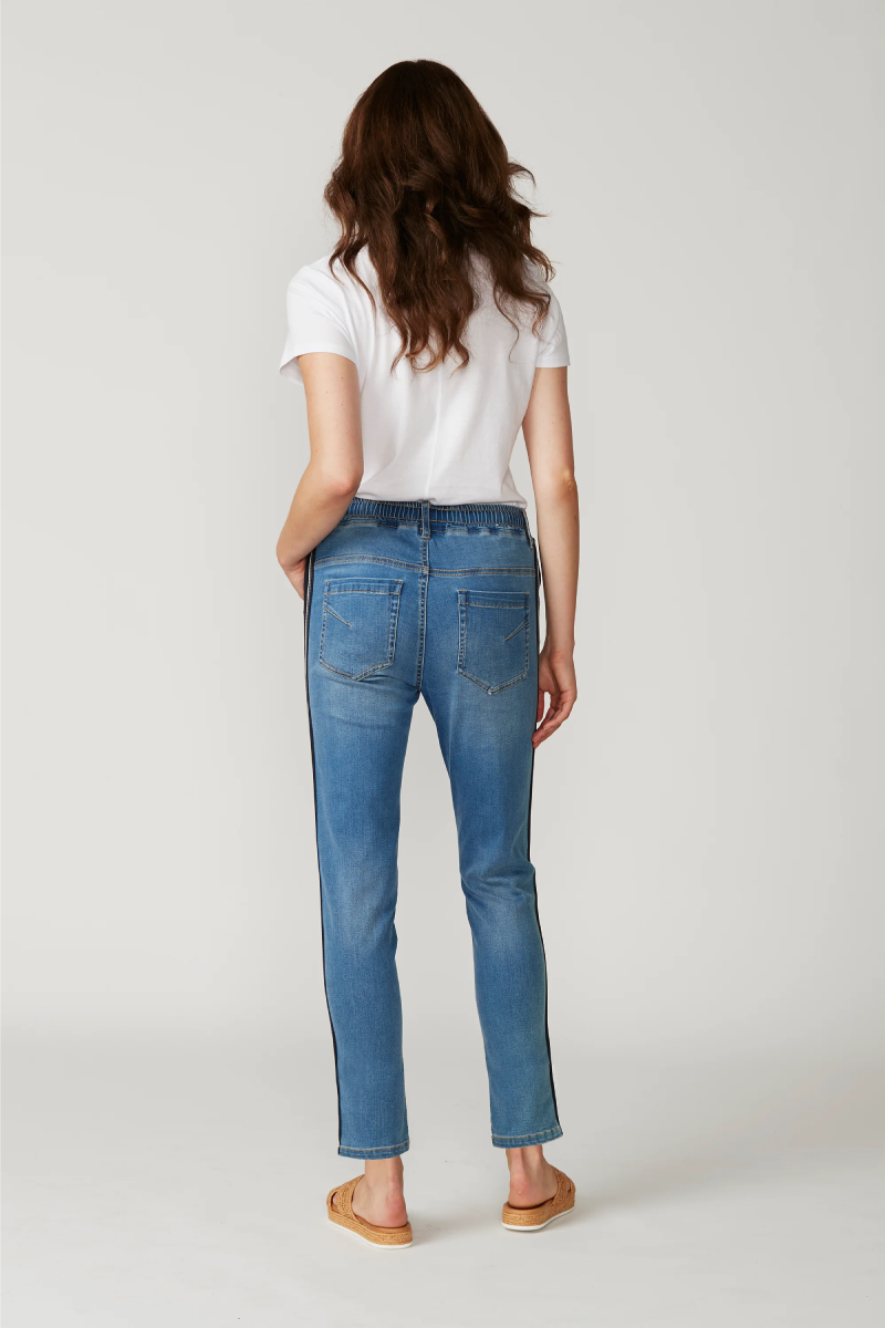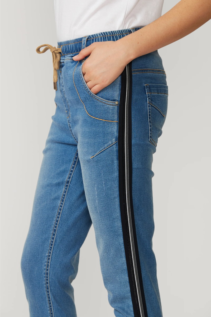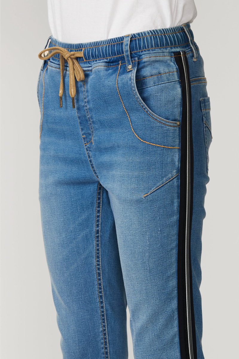 Lania the Label Boyfriend Jean is a casual jean with elasticated waist and adjustable drawstring tie. Novelty tape at the outside leg. Soft handle & distressed finish achieved by special garment wash.