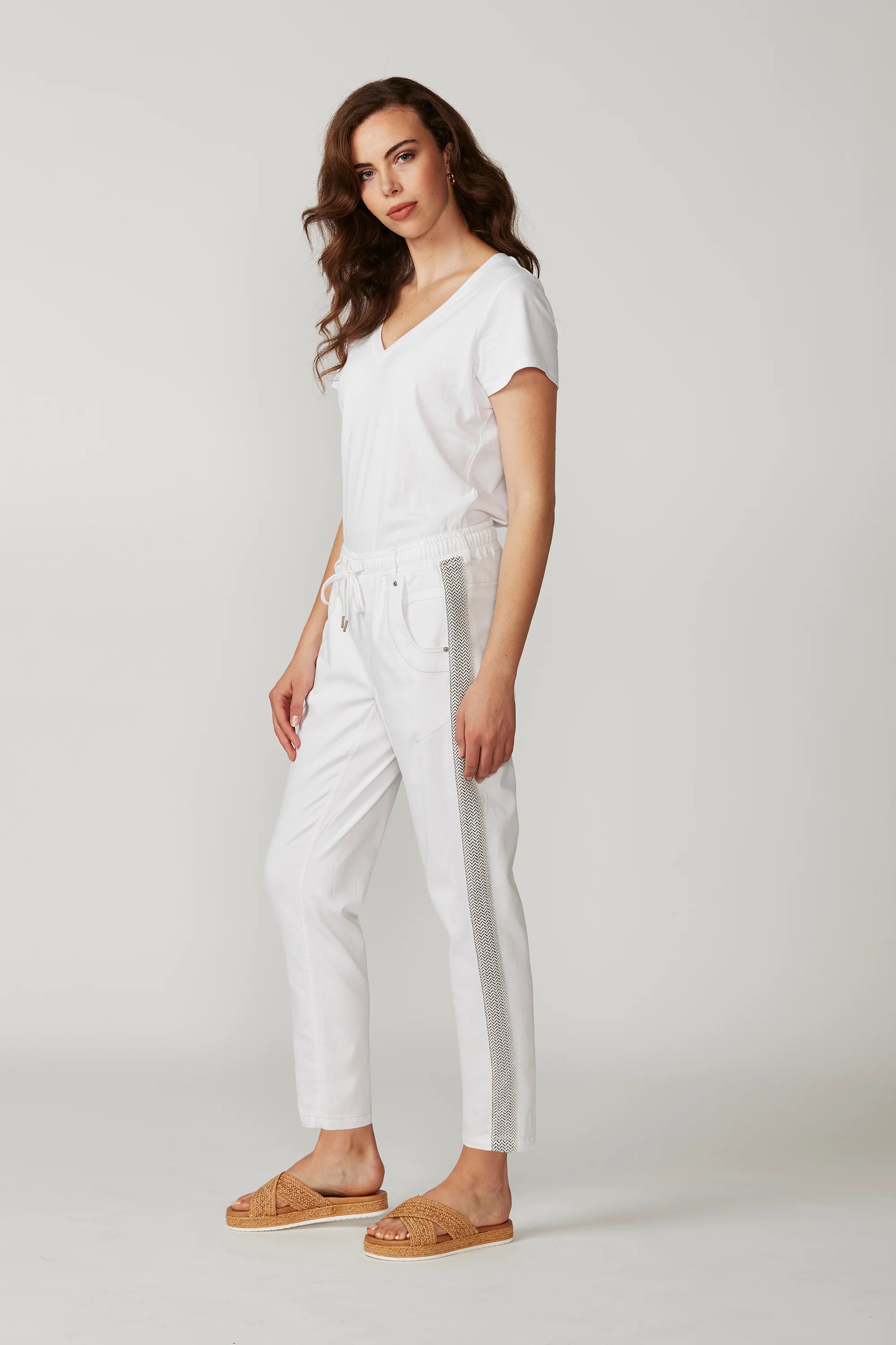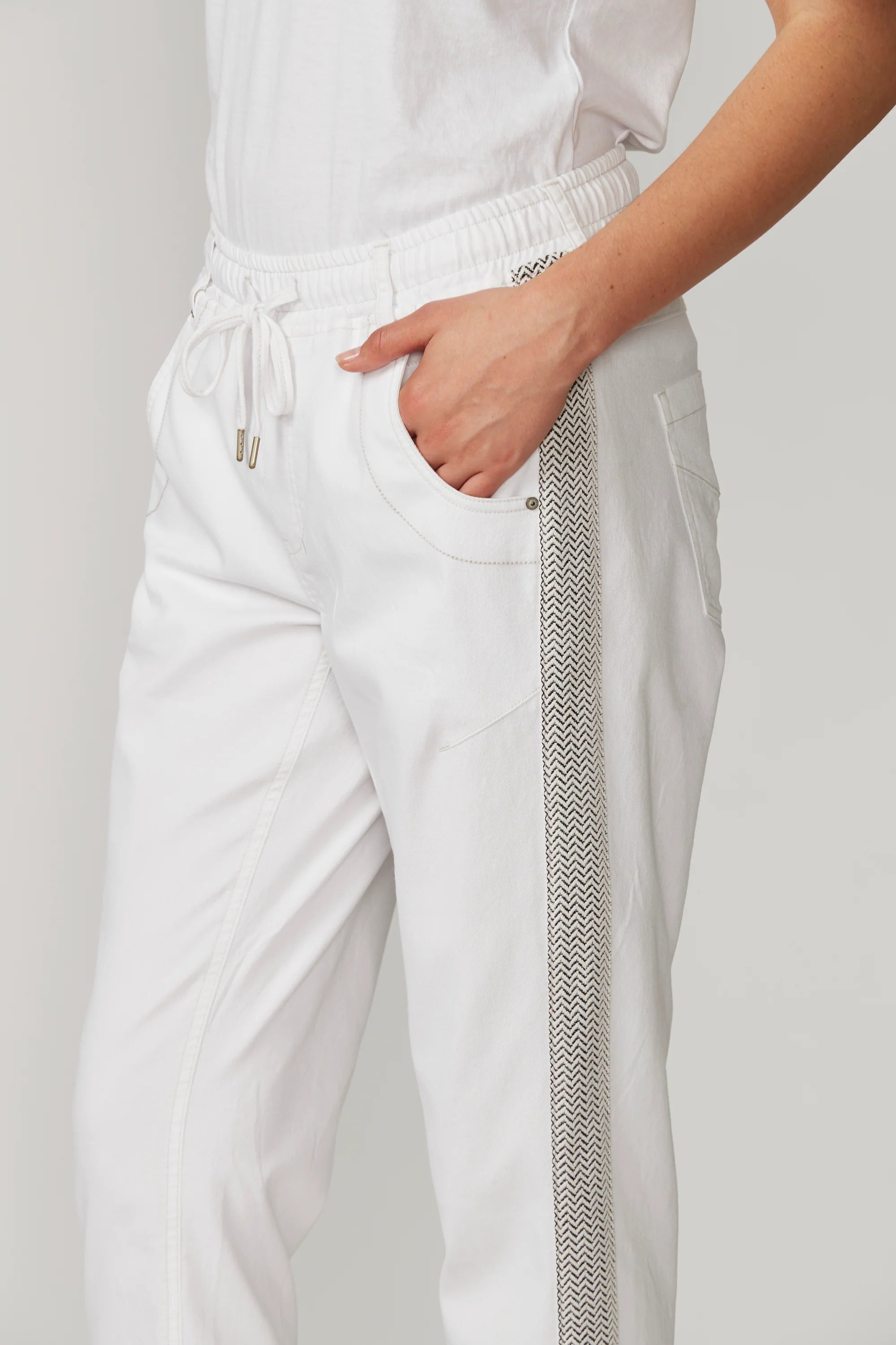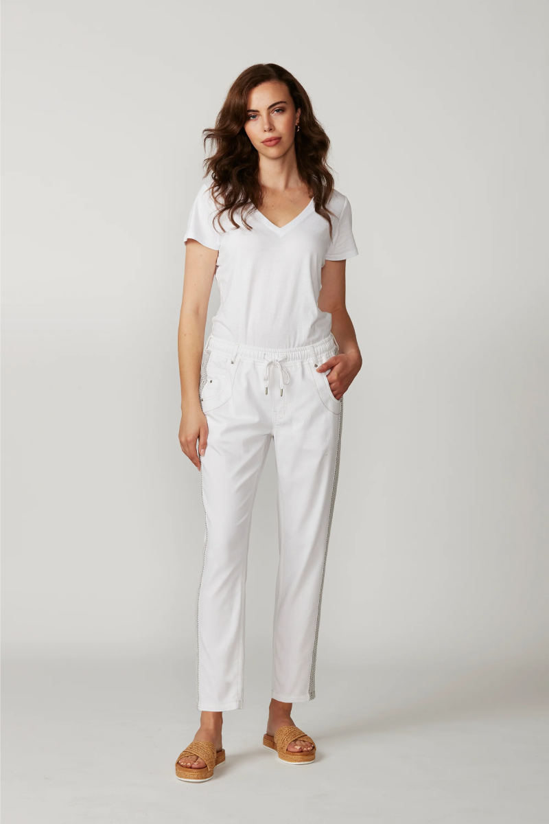 Lania the Label Zane Boyfriend Jean is a casual jean with elasticated waist and adjustable drawstring tie. Novelty tape at outside leg. Soft handle and distressed finish are created by special garment wash.