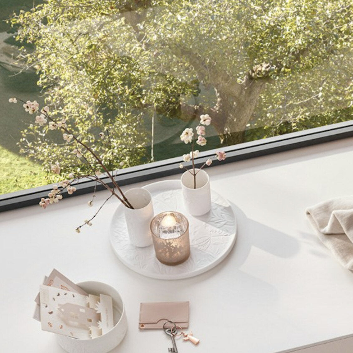 - Embossed white porcelain with botanical detailing