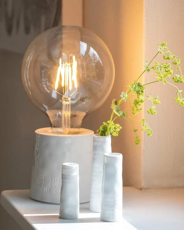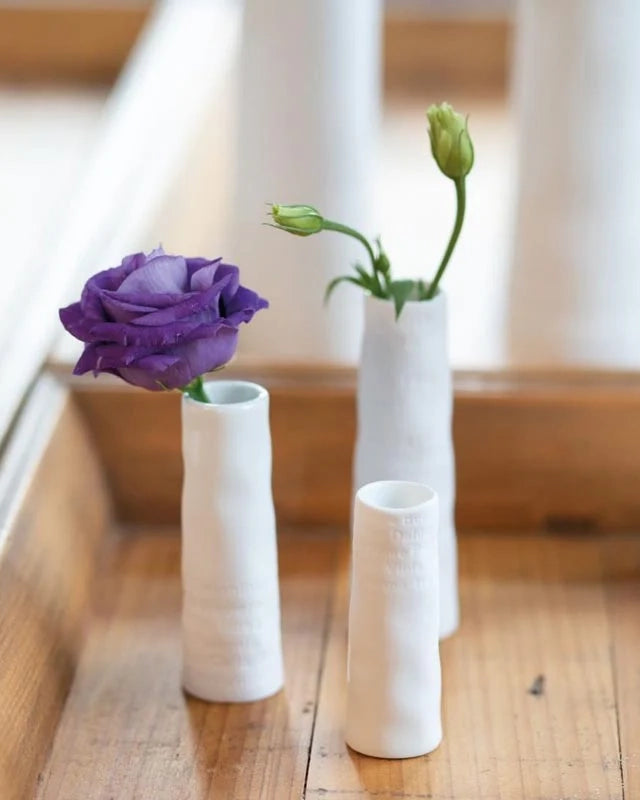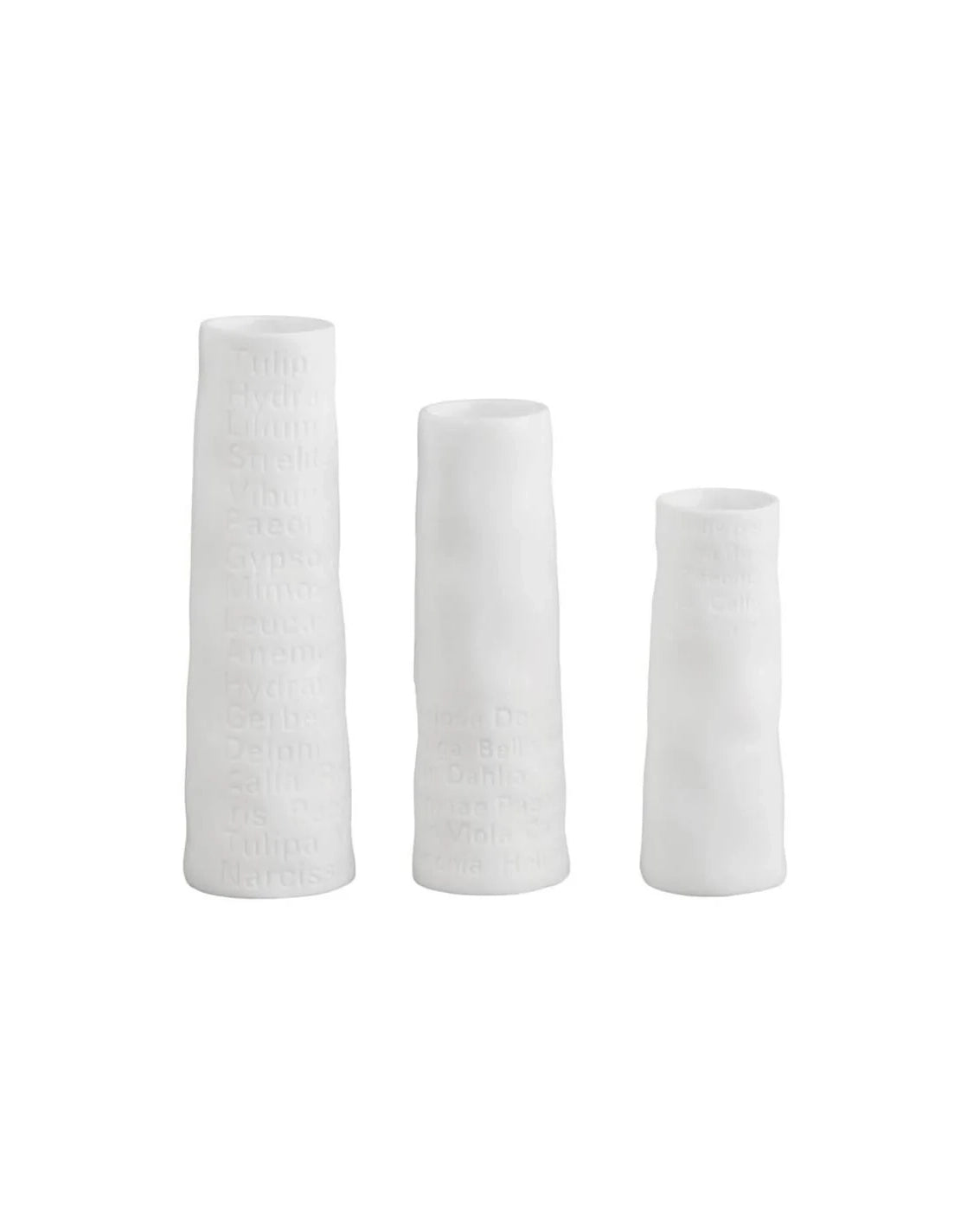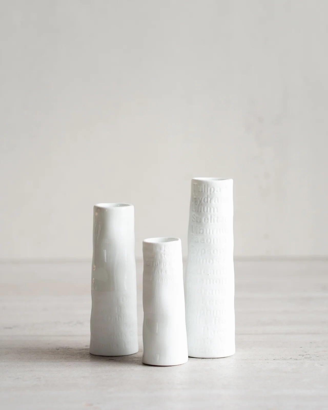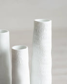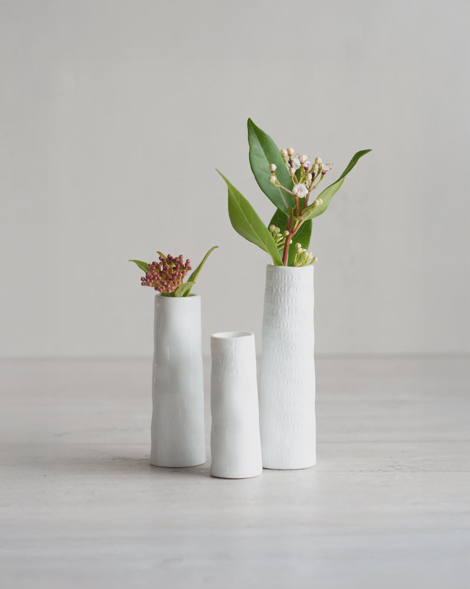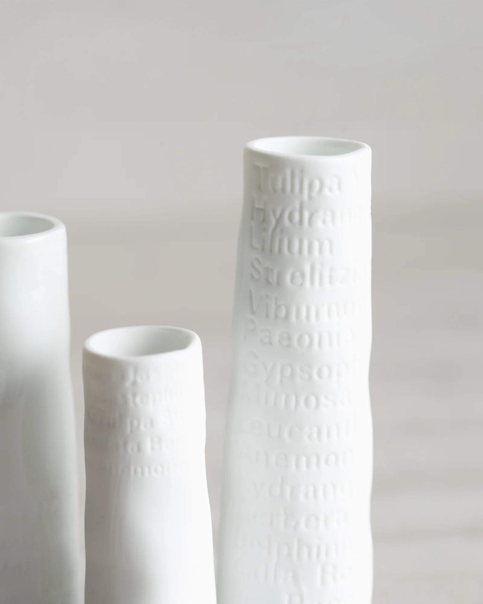 Set of three mini vases made from embossed porcelain, partly glazed inside, unglazed outside. Embossed with 'poetry' script pattern.
