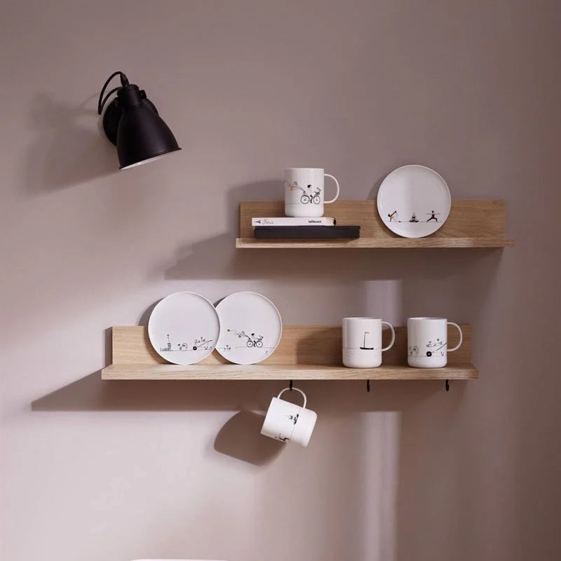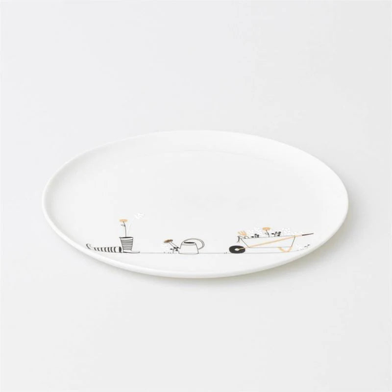 White plate with black and gold illustrations of a wheelbarrow, watering can, and boots on a white background