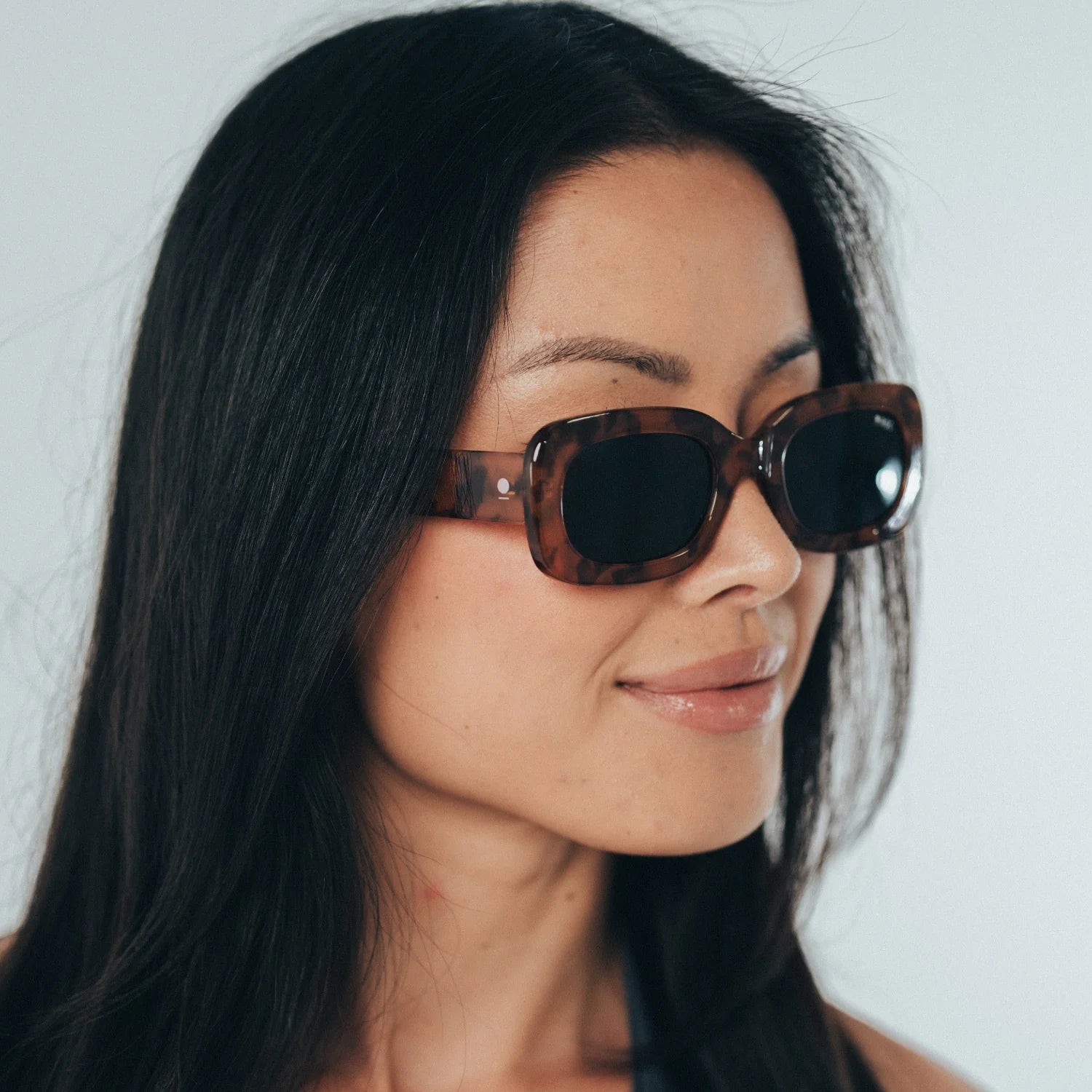 Lovey Dovey's rectangular frame and poppy smoke lenses scream 70s poolside vibes. But that’s not all, these funky shades also come with 100% UV protection. Perfect for keeping you cool when things get hot. Oh, and did we mention that these sunglasses are eco-friendly? Their sustainable frame is made from recyclable materials, so you can strut your stuff while being environmentally friendly.