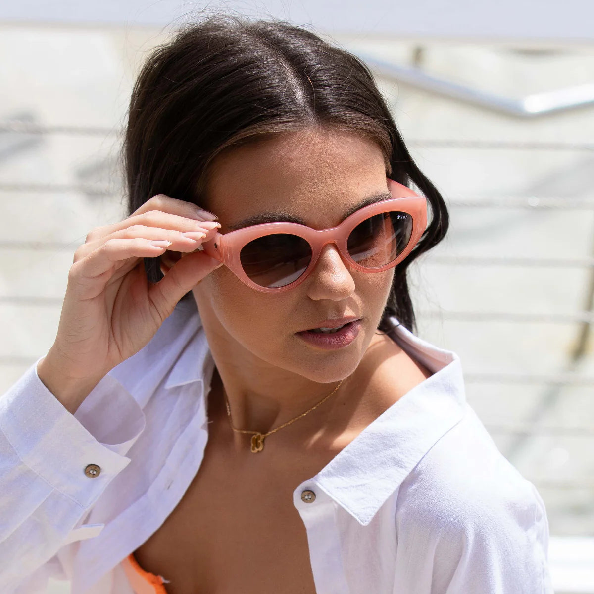 FRAME: Coral. LENS: Gradient Brown. 100% UV Protection. Category 2