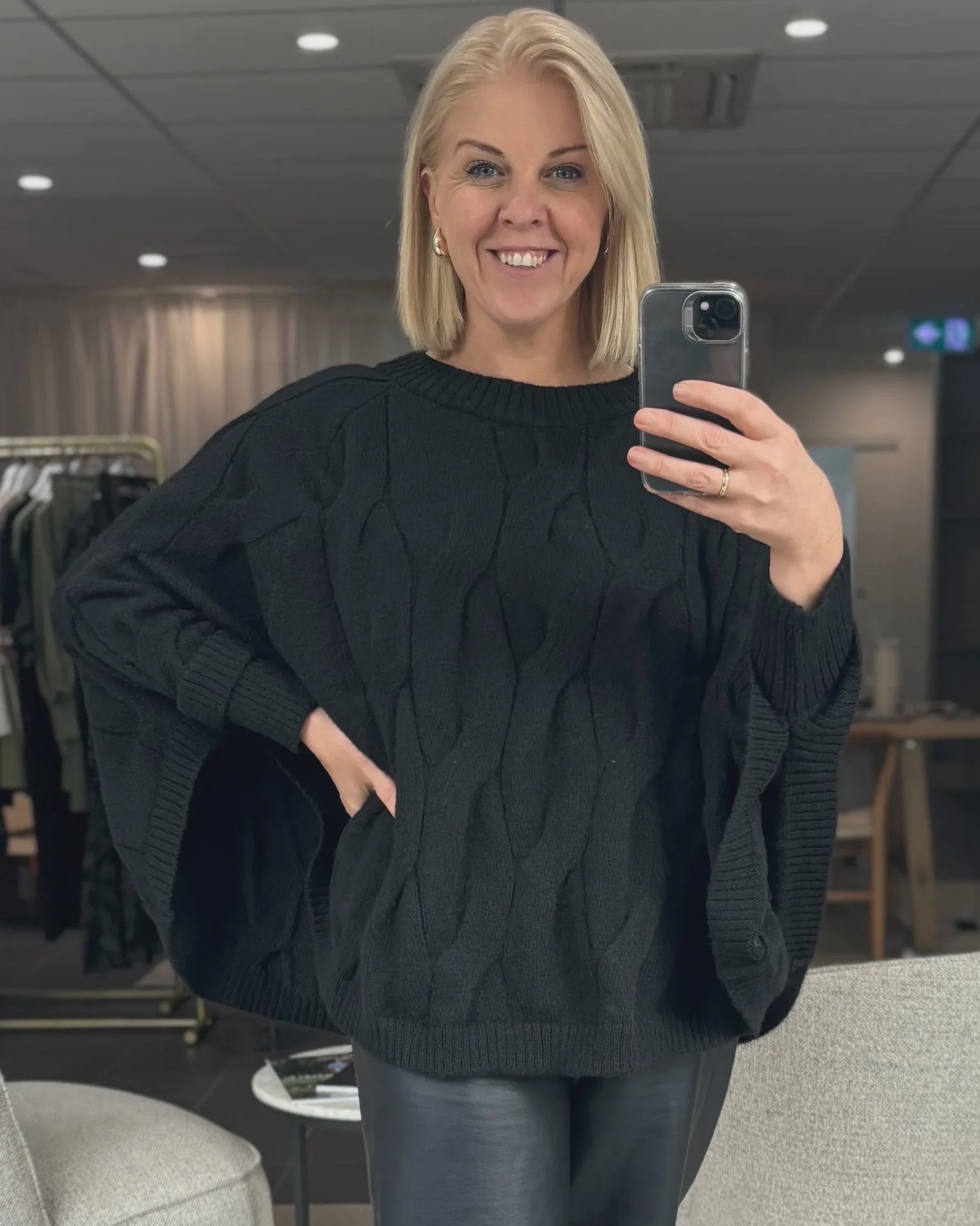 Stella + Gemma Cable Poncho made with super soft recycled polyester & elastane. Throw & go poncho with nice cuffs to sleeves.