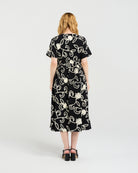 This below knee-length dress features a round neckline and short sleeves. Crafted from black base fabric embroidered with flowers. It includes a tie that allows for versatile styling, making it a practical choice for any occasion.