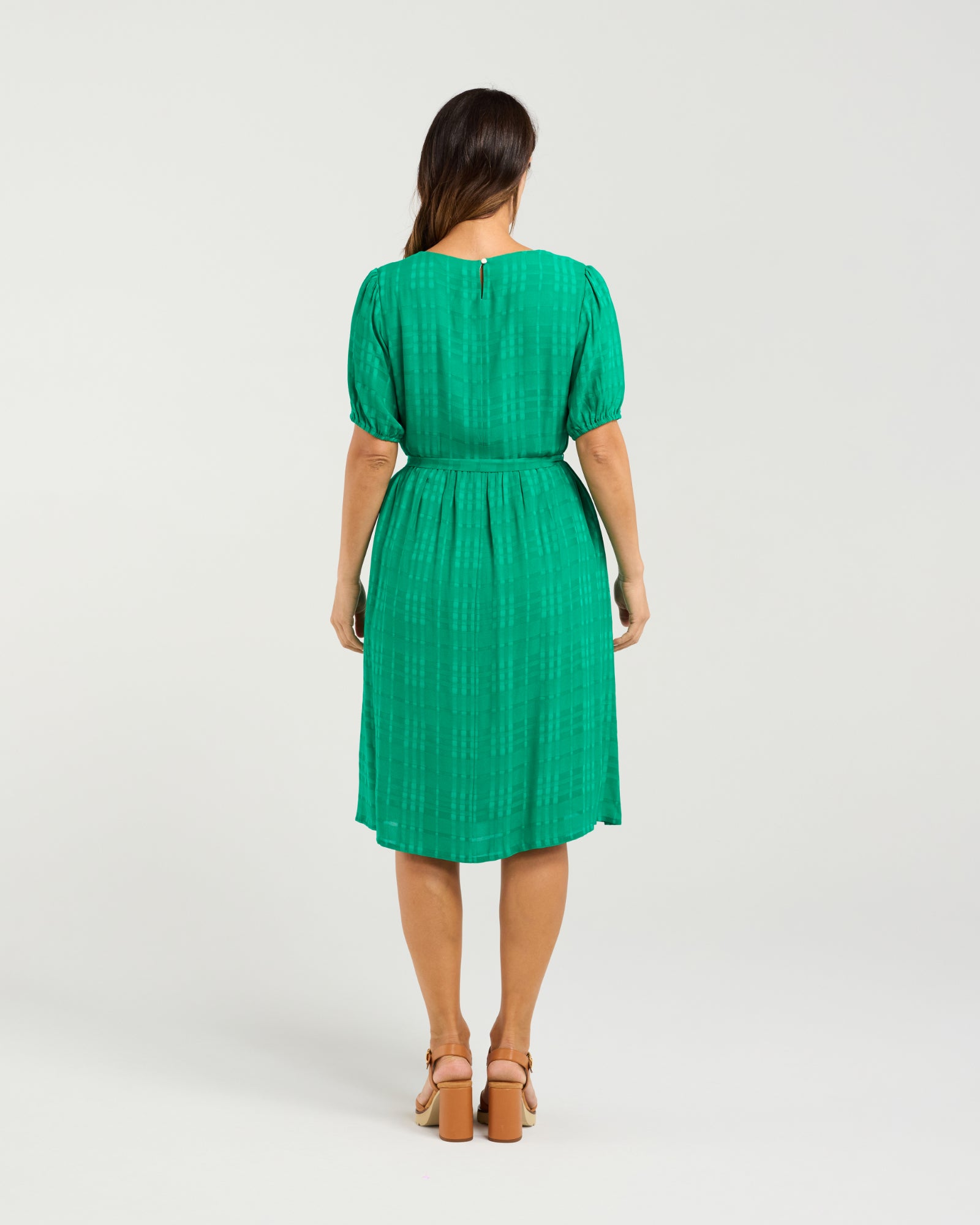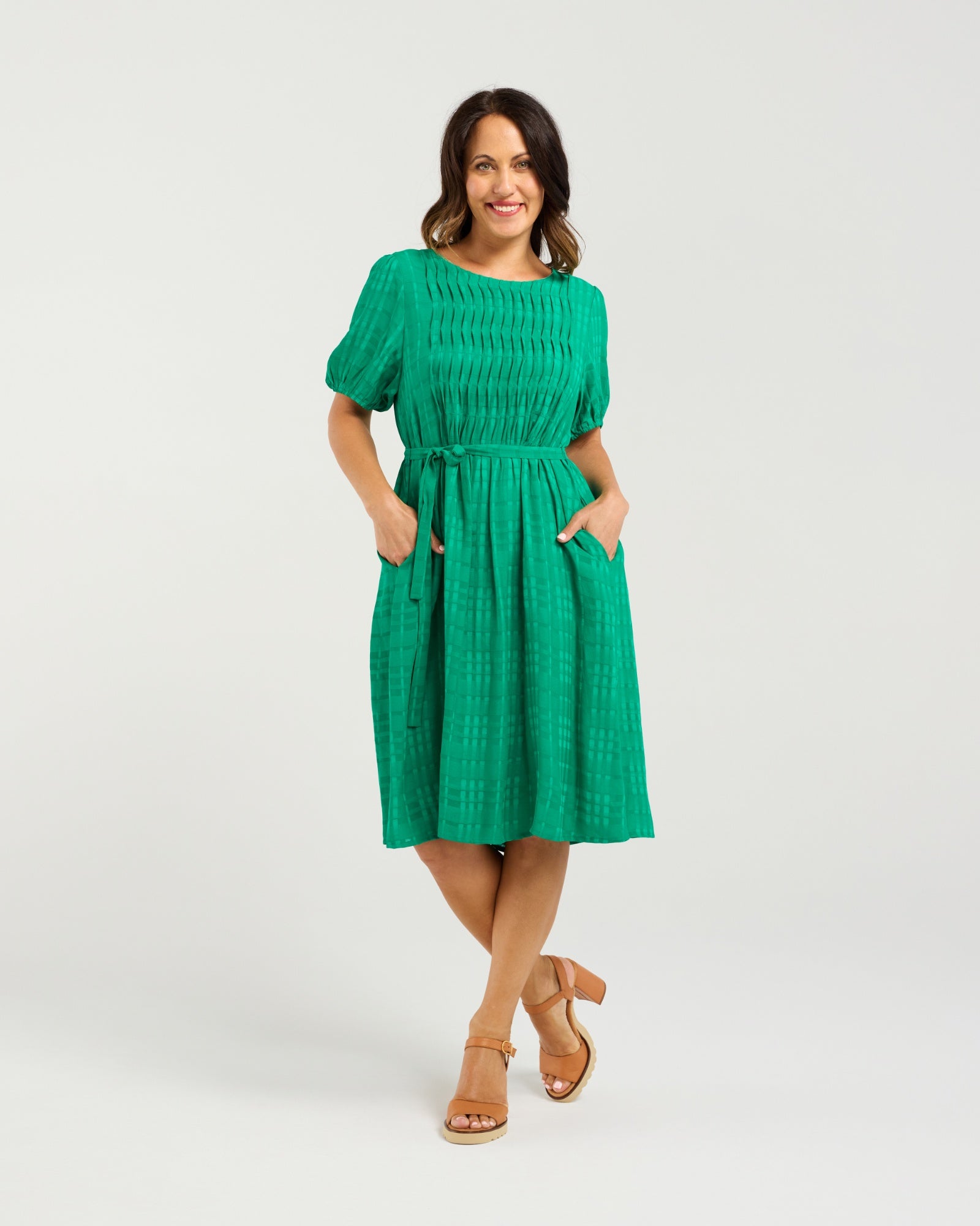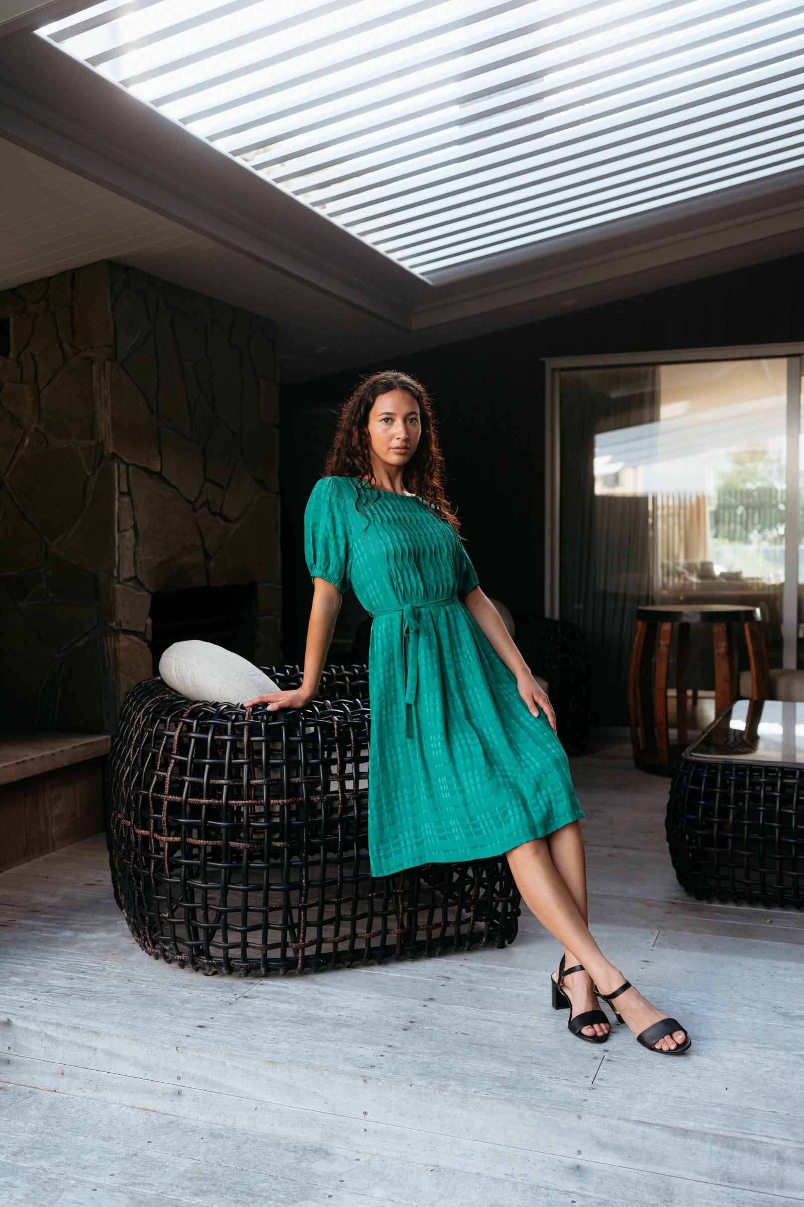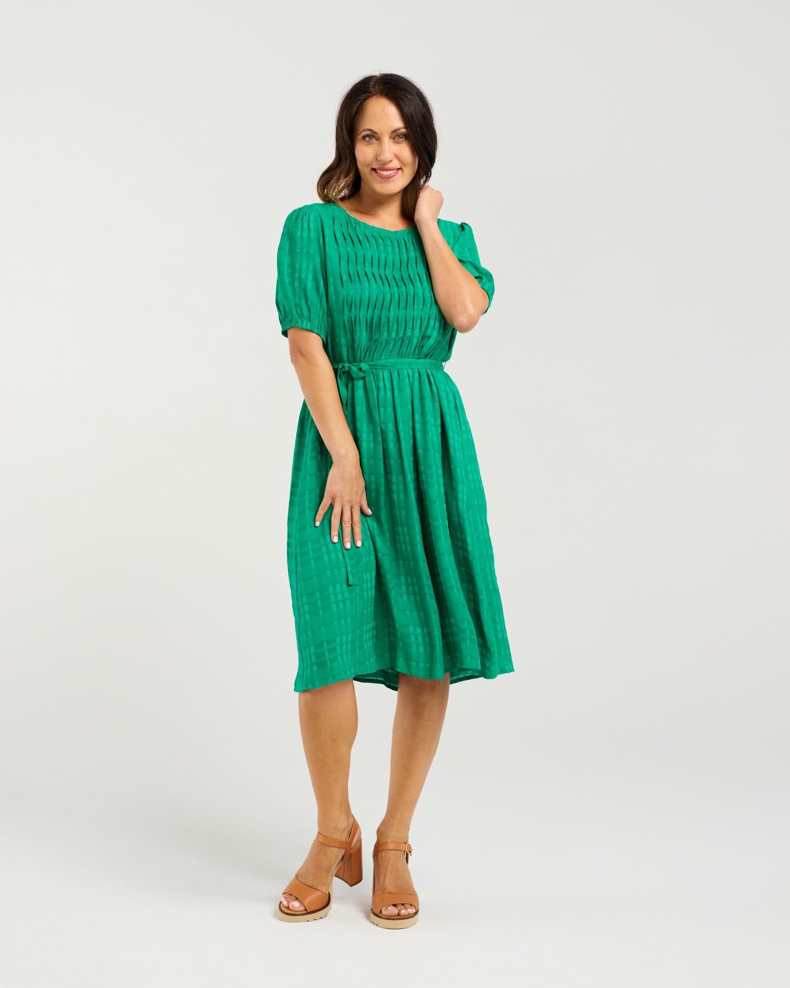 This knee-length dress offers a relaxed yet polished look with a smocked front bodice and elasticated short sleeves for a comfortable fit, and a self-tie detail around the waist, ensuring effortless style and versatility for any occasion.