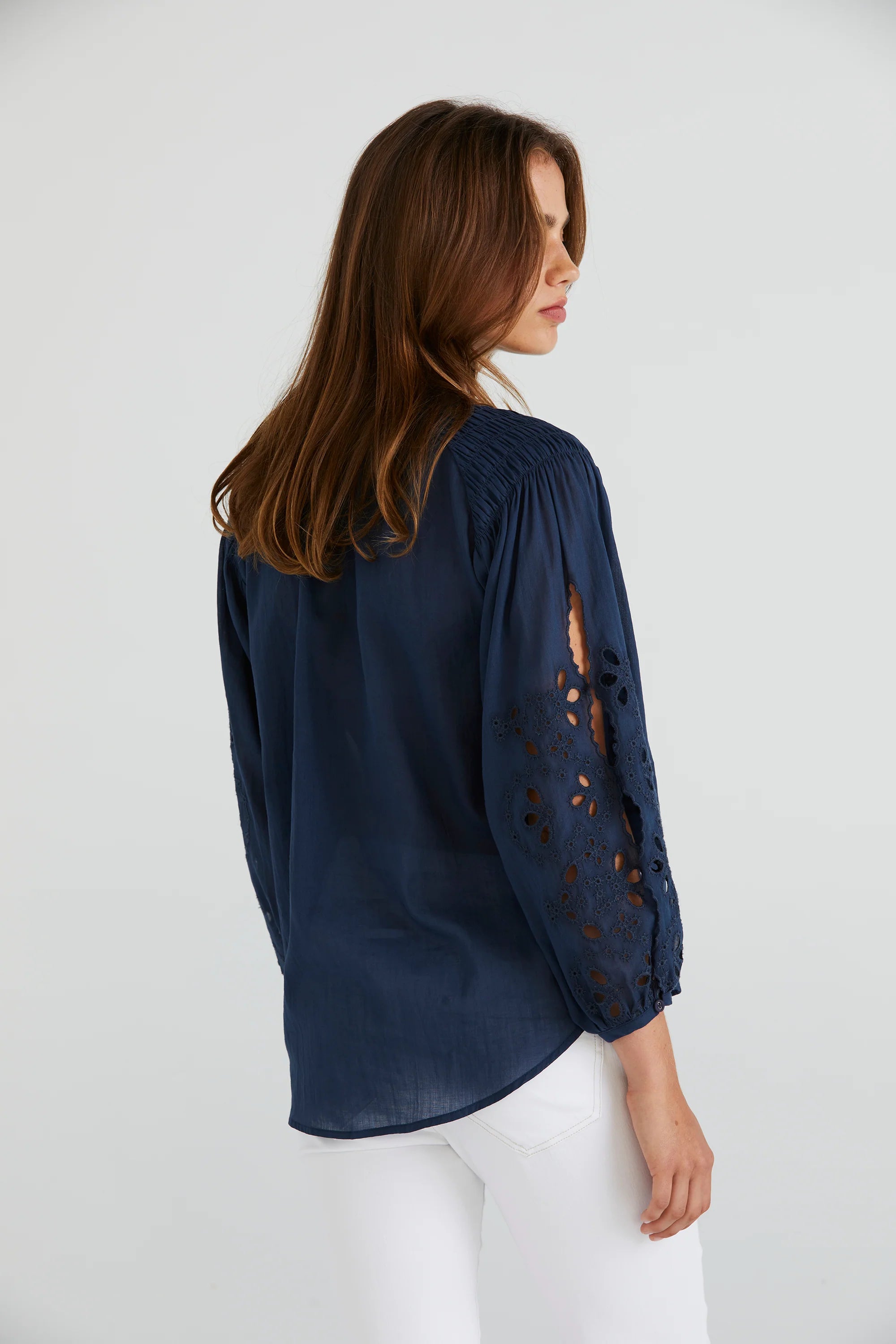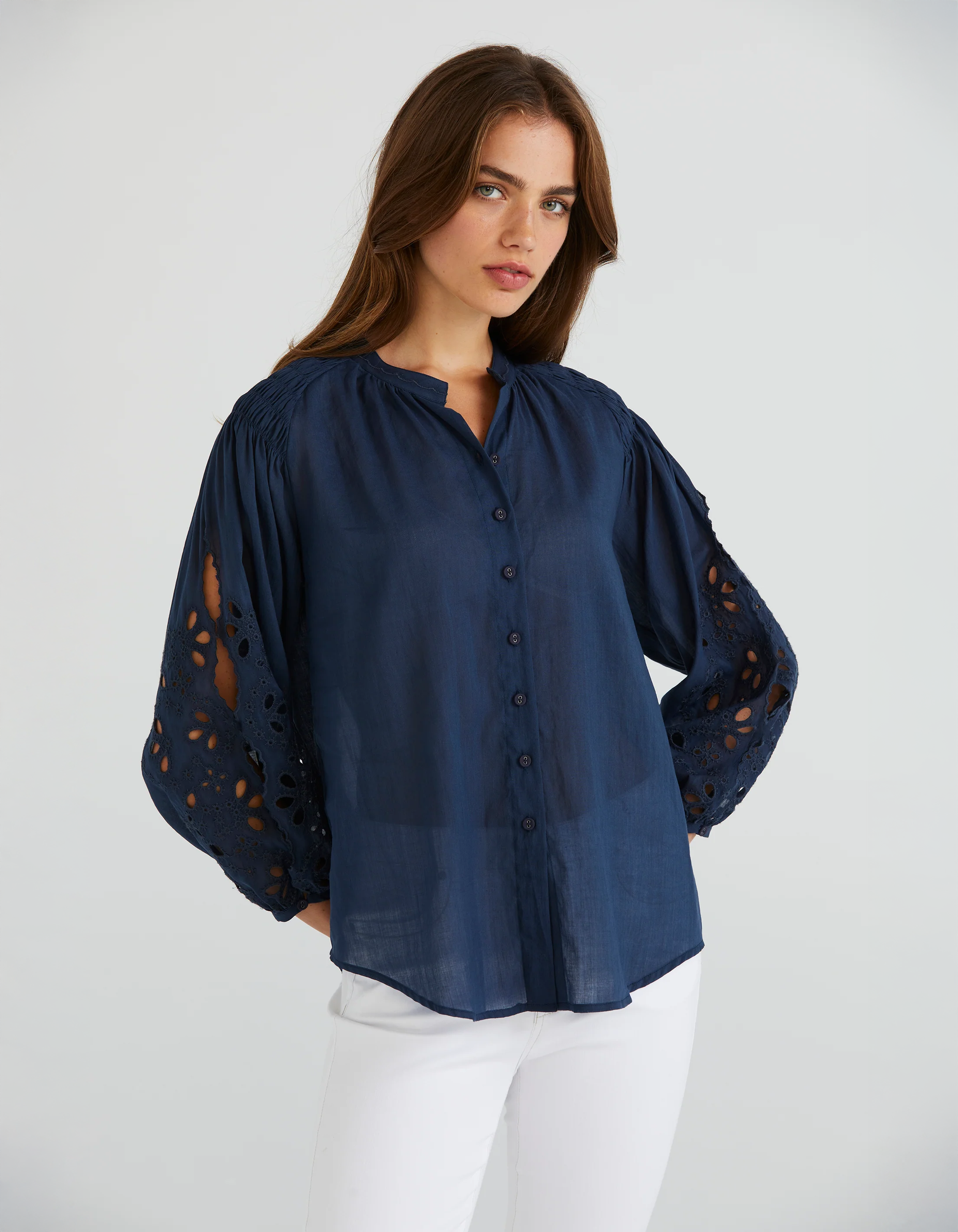 Step into timeless elegance with the Claudia Shirt, a stunning button-through shirt designed to captivate. Made from a premium ramie cotton blend, its shirred overarm detail adds a touch of texture, while the cut-out embroidery design sleeves offer intricate detailing. This shirt is perfect for making a style statement with ease.