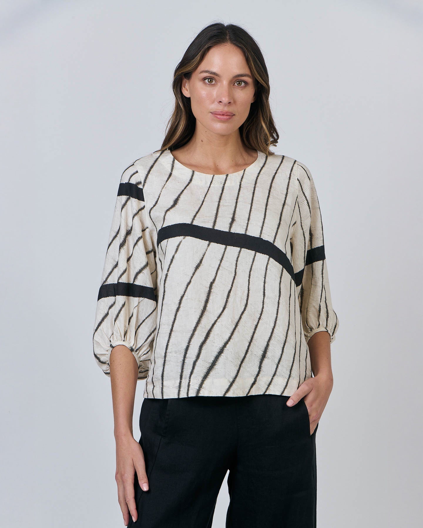 The elbow length bishop sleeves make this top a stand-out piece. The wide trim around the round neck and hem of this top adds an element of charm. A single shell button closure and inverted box pleat on the back rounds it out. Made from 100% linen.