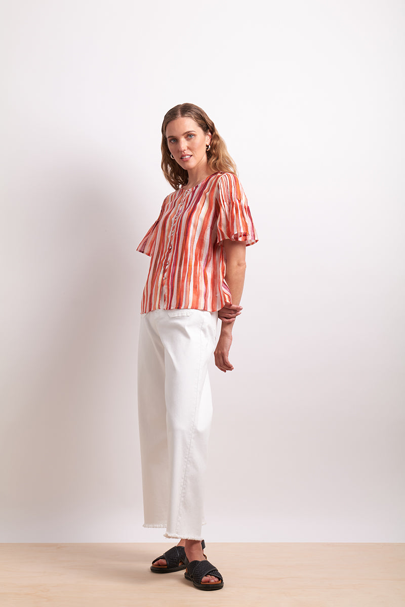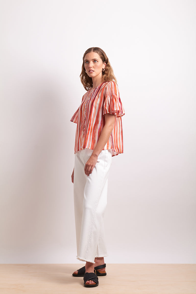 The Draw The Line Blouse is a striped short-sleeve shirt with a crew neckline and button-down front. With a loose fit and subtle flared sleeve with pintuck pleats on the shoulder, it’s a playful piece that still feels polished.