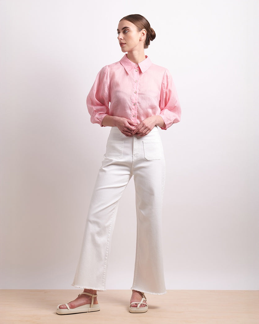 Sheer and softly structured, The Pin Tuck Shirt is designed as a relaxed silhouette with a mother of pearl button-down front. Featuring pintuck panel detailing on the loose three-quarter sleeves and a classic collar, it’s an elegant style made from 100% ramie that is airy and light, ideal for layering.