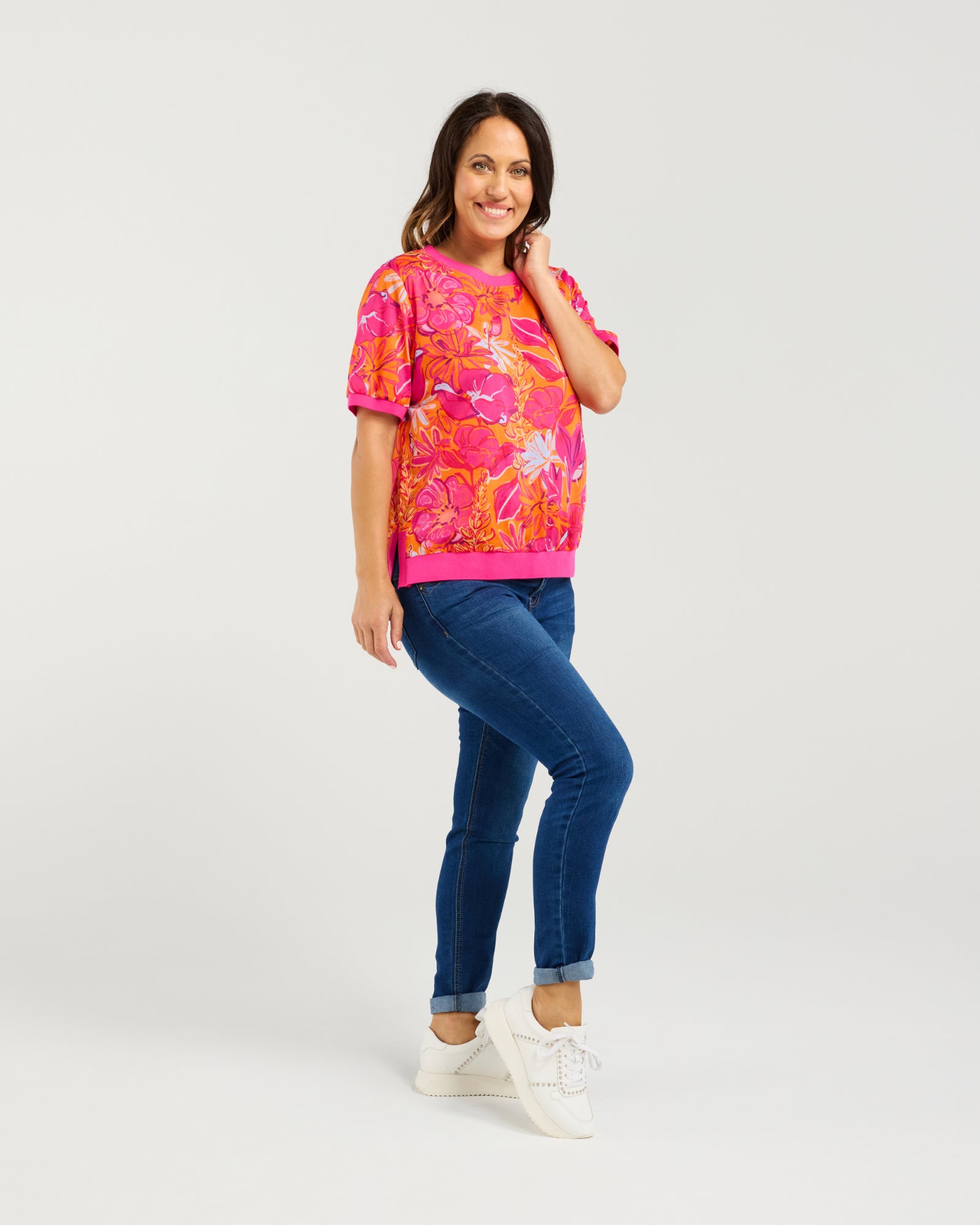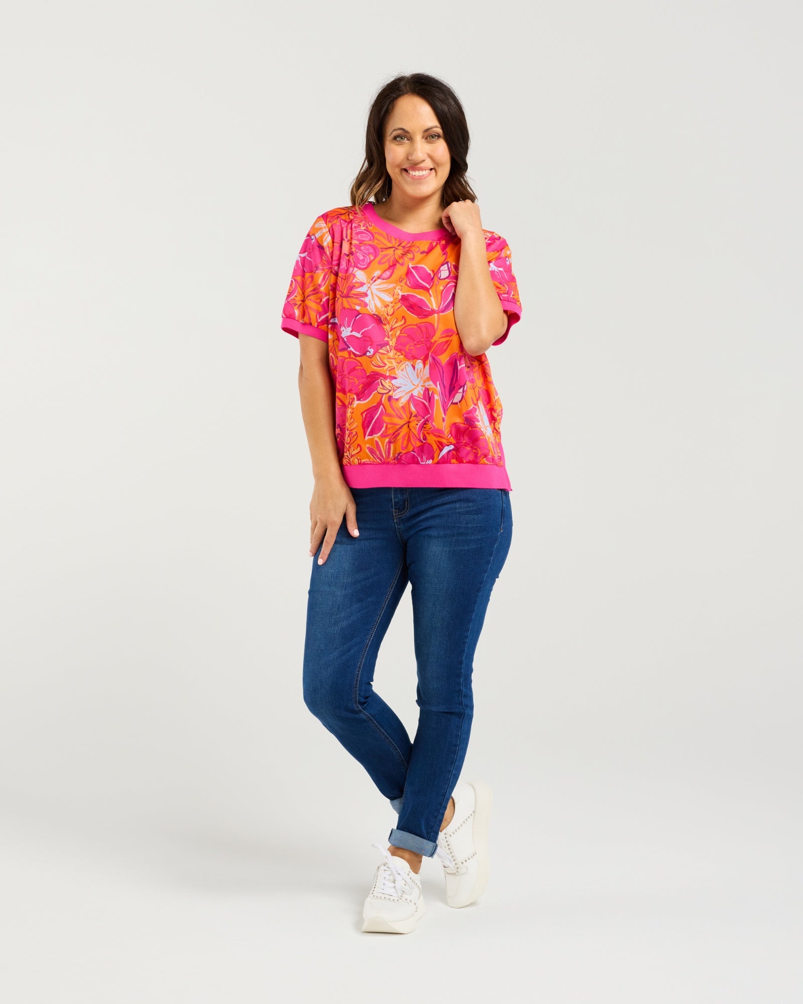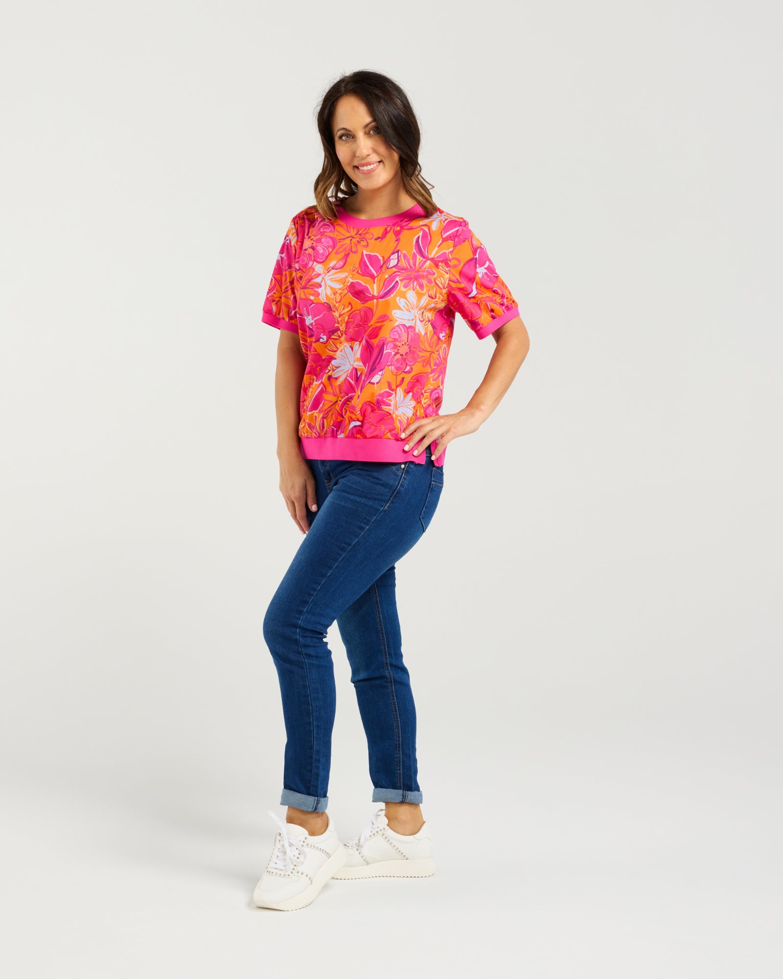 This relaxed-fit top keeps its signature elastic trim at the neckline, cuffs, and hemline, delivering both comfort and a softly structured shape. The design stands out with a bold orange base accented by brushstroke-style floral motifs, offering an expressive, artistic flair. Eye-catching yet easy to wear, this piece adds vibrant energy to any look.
