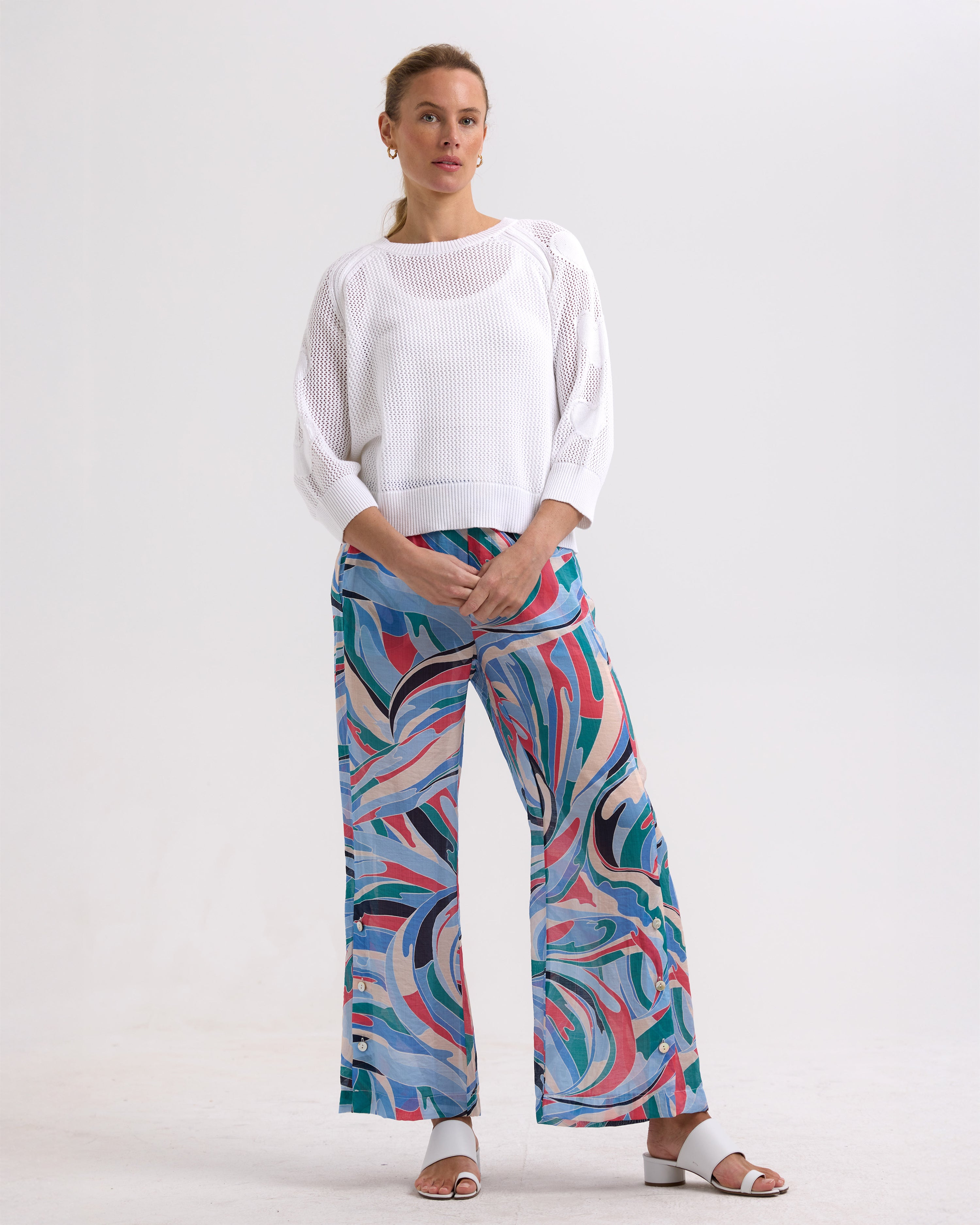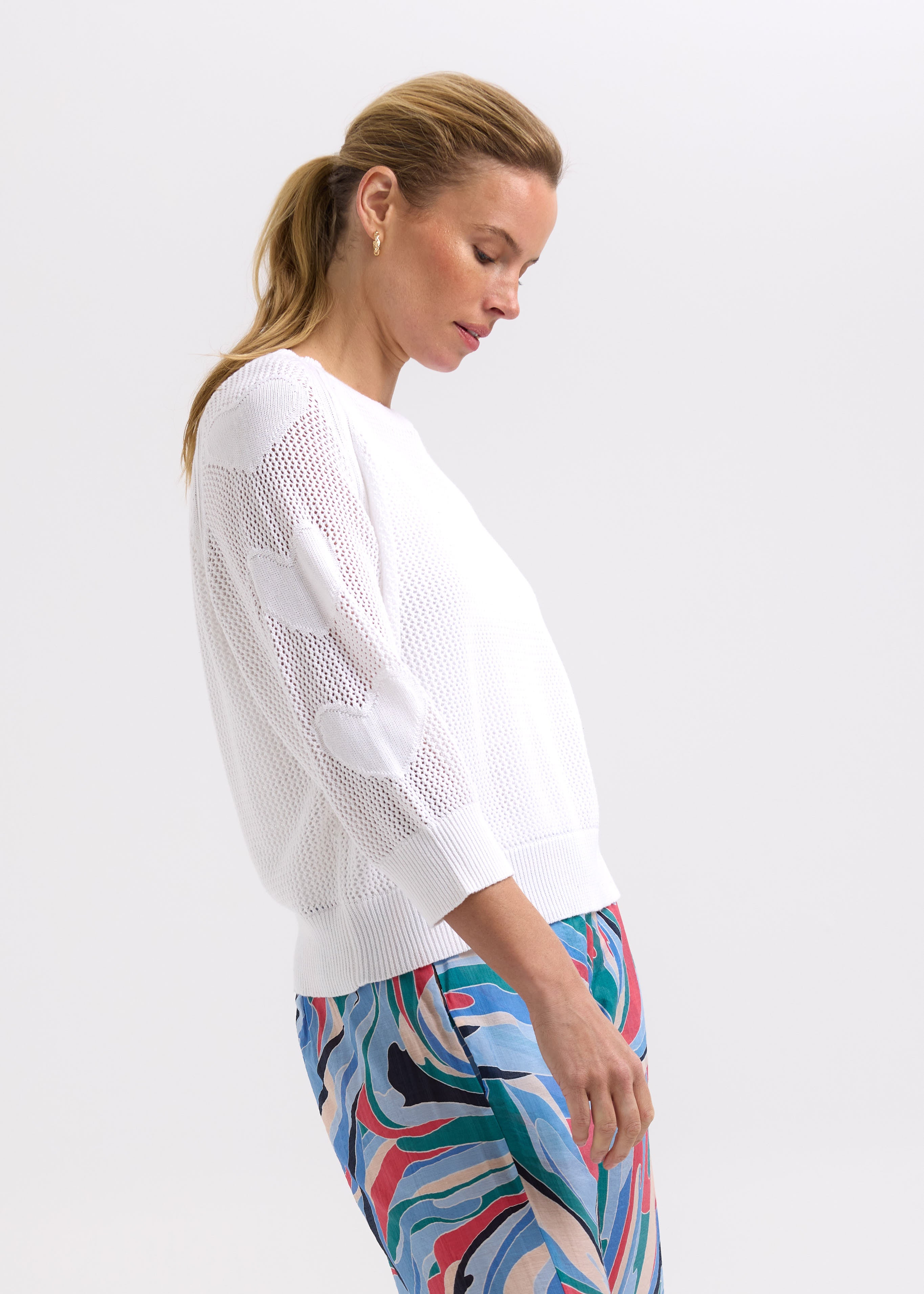 Subtle yet charming knitted heart motifs on the sleeves give this airy sweater a playful touch. The breathable texture makes it perfect for layering over tanks or wearing on its own during warmer seasons.