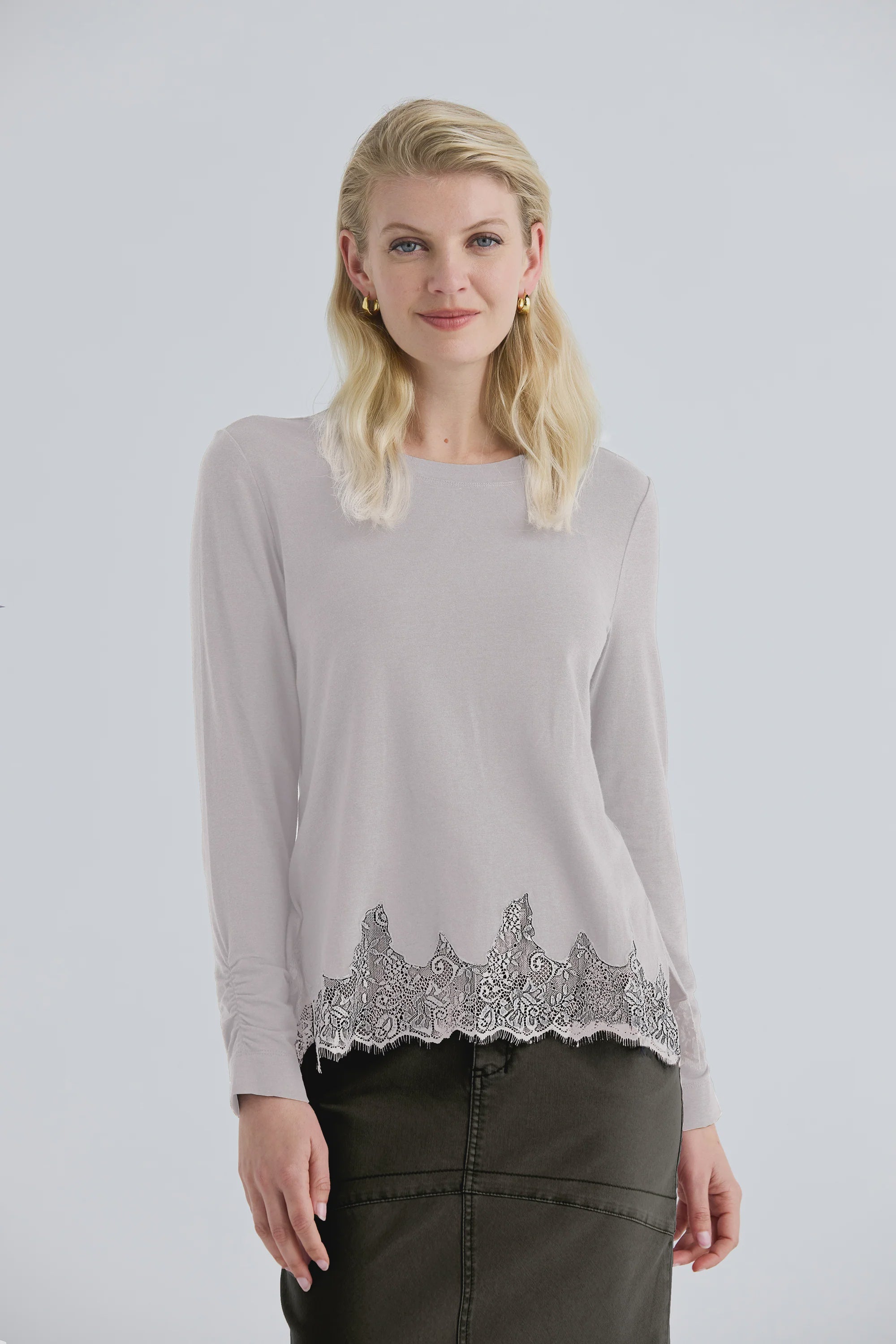 The Belle Top is a wool blend long sleeve knit that combines warmth with elegance, making it perfect for winter layering. It features a dyed-to-match cutaway eyelash lace detail at the hemline, adding a subtle touch of sophistication to your everyday look.