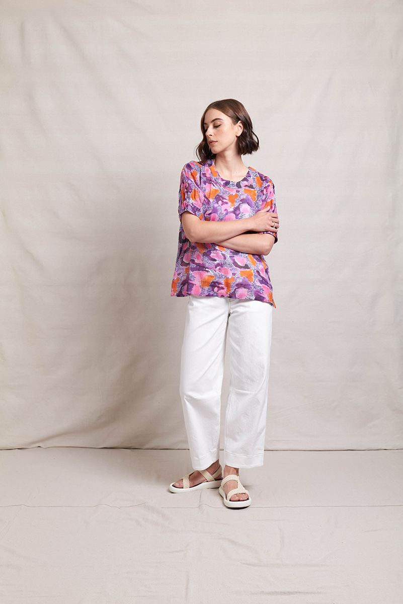 The Art Space Top by Neris is a light summer style made from 100% ramie, it is lightweight and hangs elegatly with a wider hem. The neck is a wide neck that does up with a bow at the back. The sleeves feature pintuck pleats.