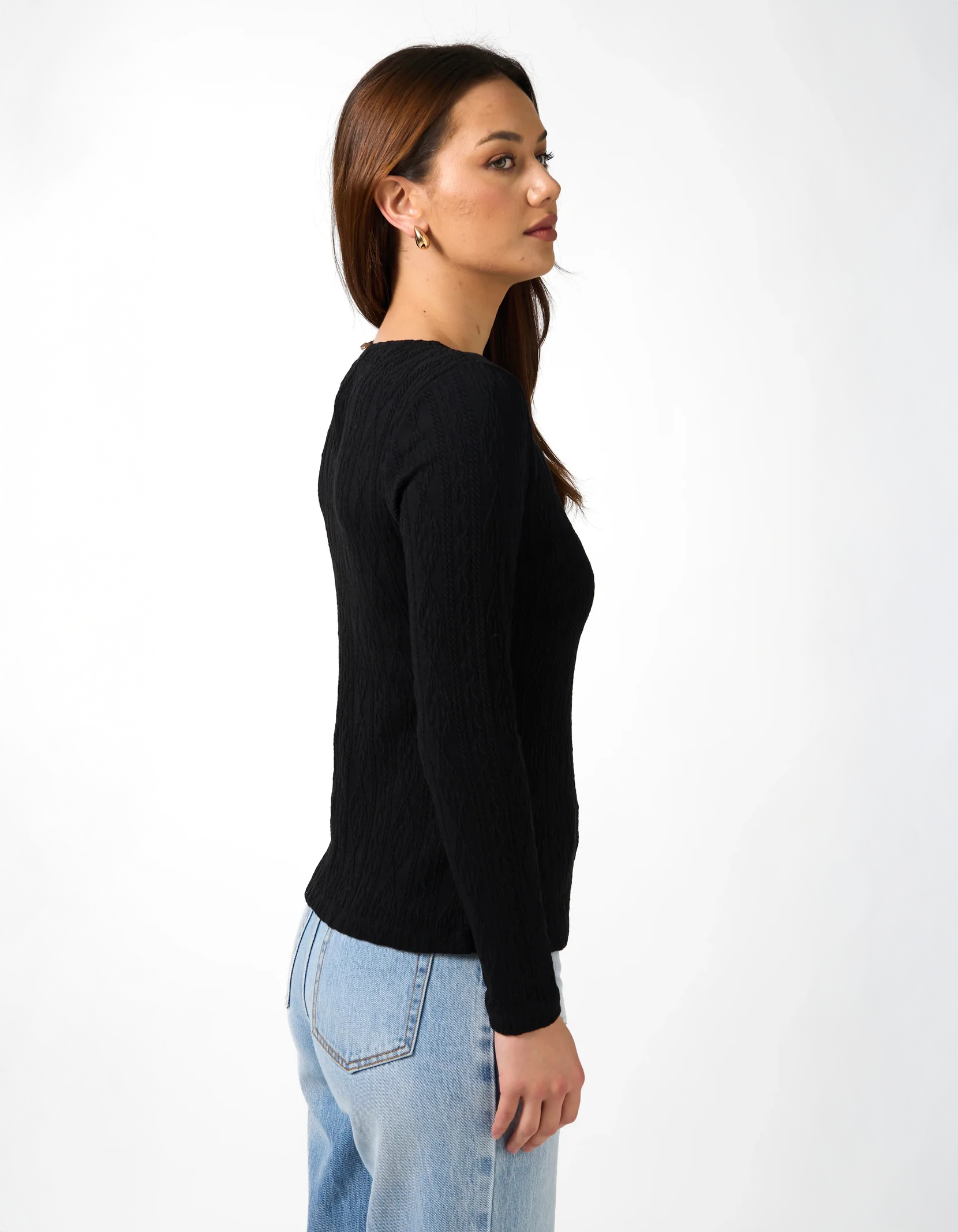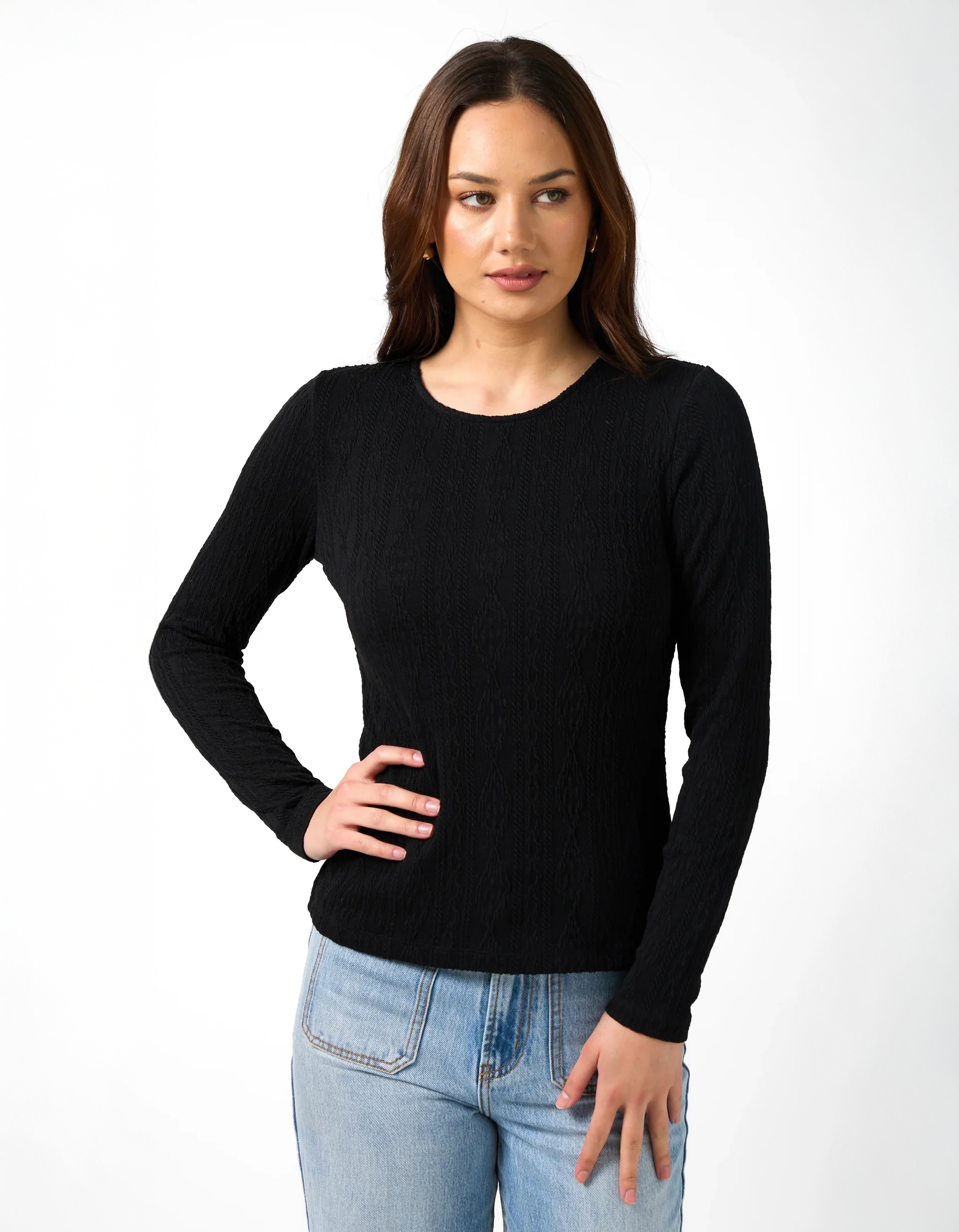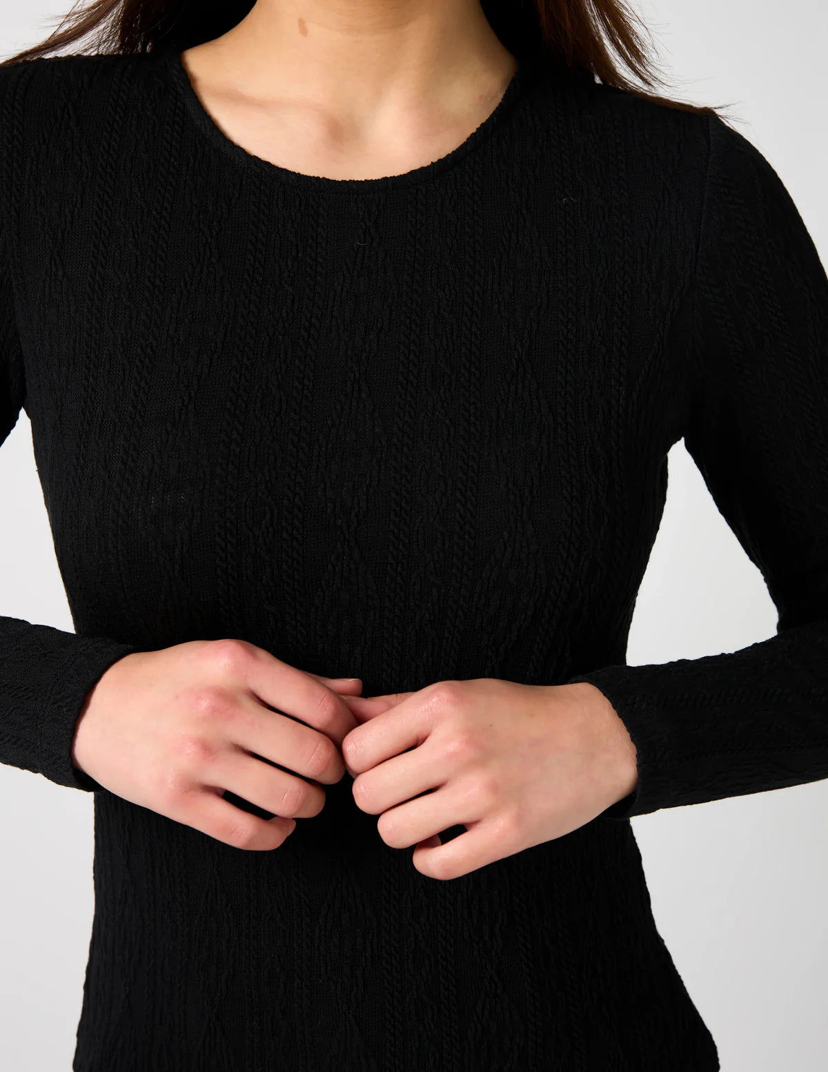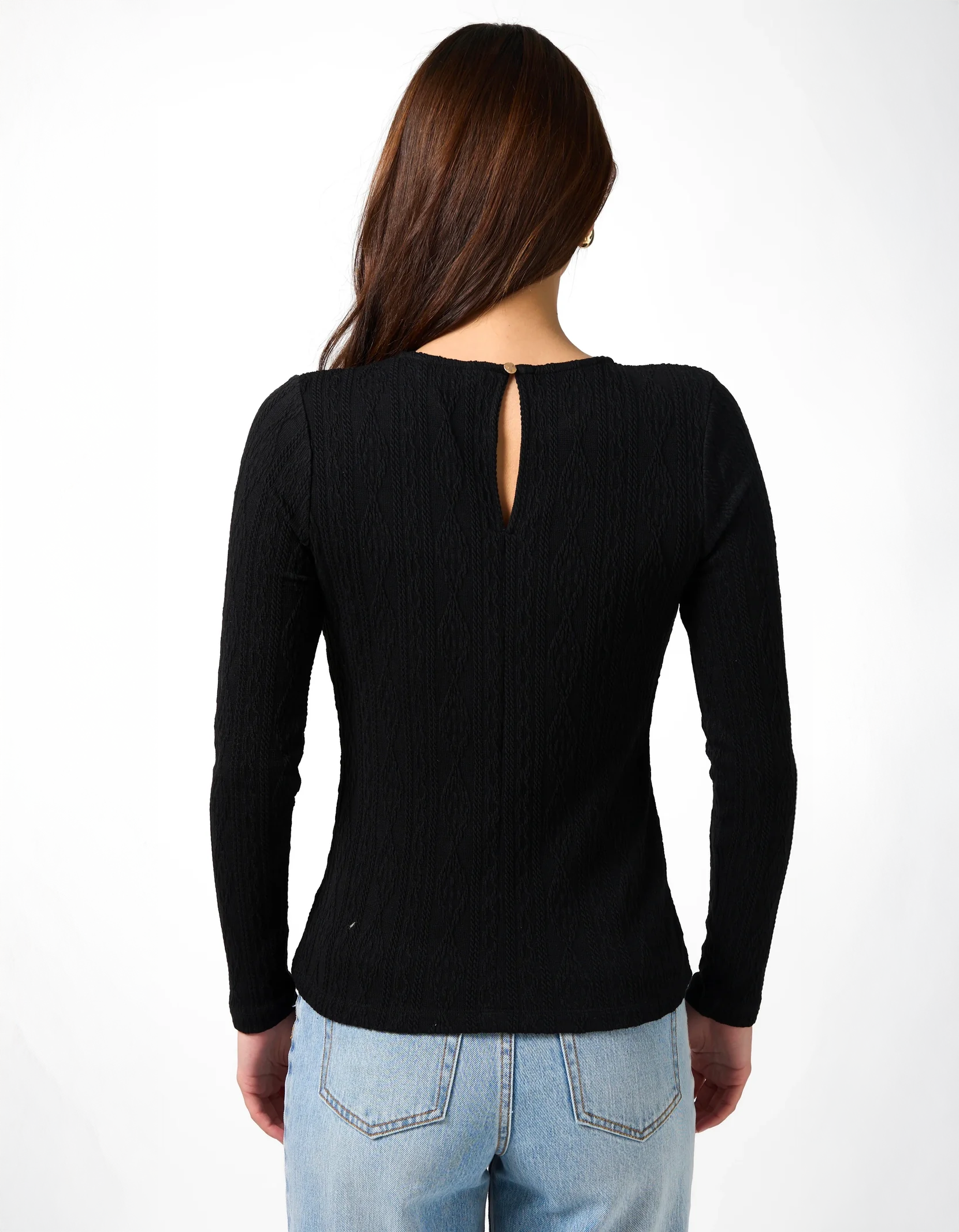 Crafted from a soft and stretchy rib-knit fabric, this long-sleeve top combines comfort with a flattering fit. Featuring a classic crew neckline, it’s a versatile essential with a touch of elegance. The keyhole detail at the back, finished with a delicate button, adds a subtle yet stylish accent. Ideal for layering or wearing solo, this top transitions effortlessly from casual to chic.