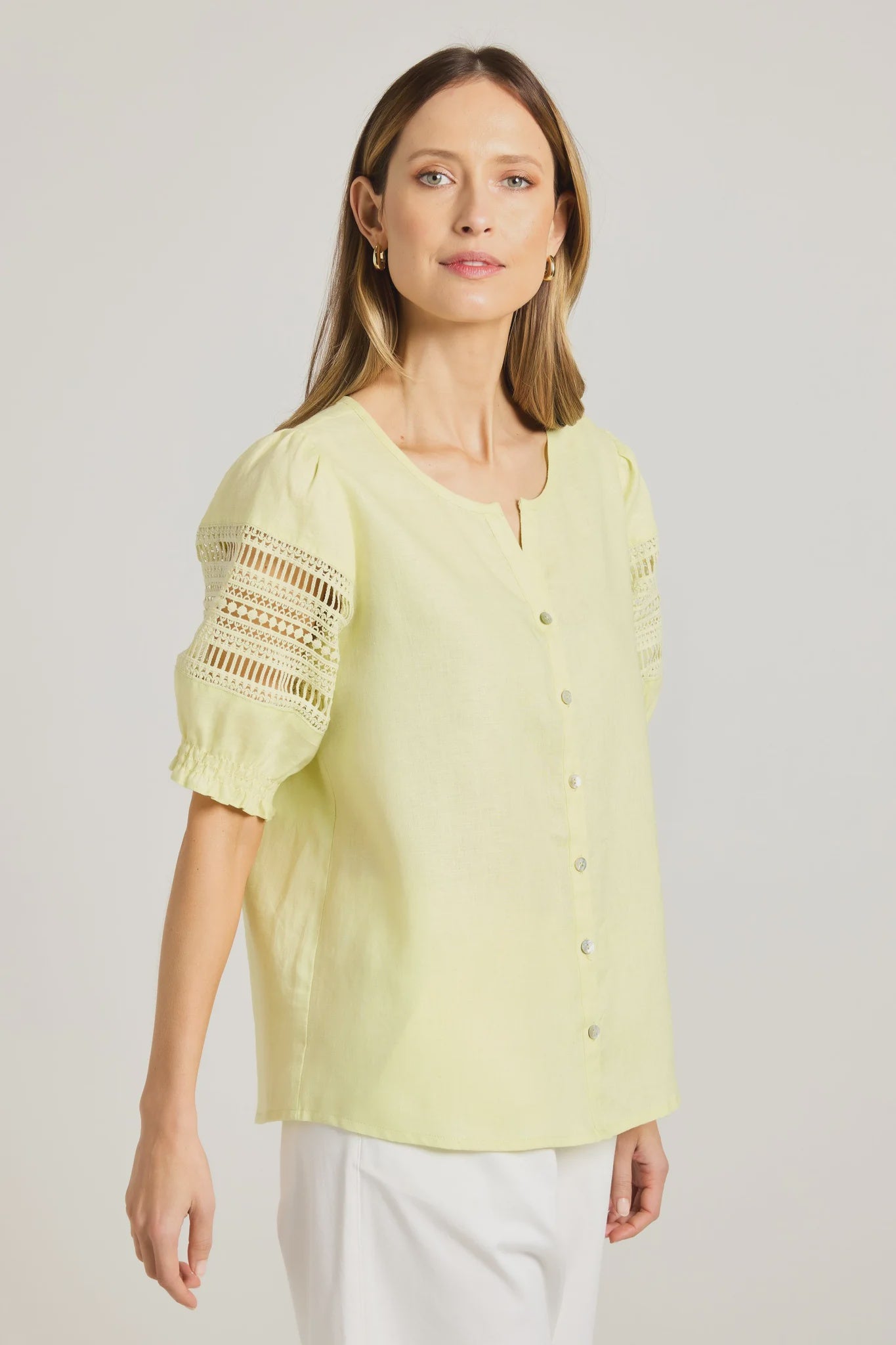 Welcome a blend of comfort and elegance with our latest piece. Featuring a cut-away banded round neckline and short sleeves with elasticated hems, this top ensures a perfect fit. The decorative cotton lace trims on the sleeves add a delicate flair, while the front placket with buttons offers both style and practicality. Its relaxed fit makes it a versatile addition to any wardrobe.