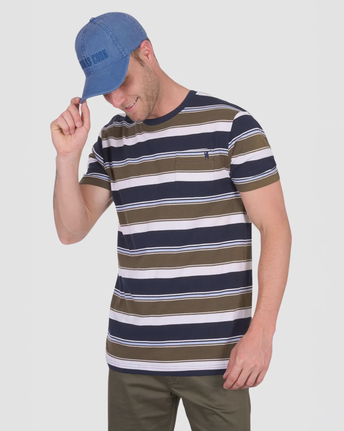 Made from premium 100% cotton jersey (180gsm), this tee combines comfort with a modern stripe design in Navy and Dark Tan tones. It features a single chest pocket with the iconic Thomas Cook horseman embroidery, offering a classic yet casual look perfect for everyday wear.
