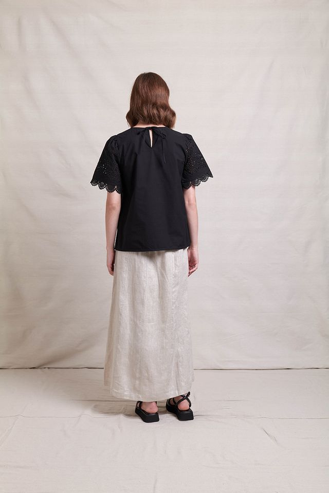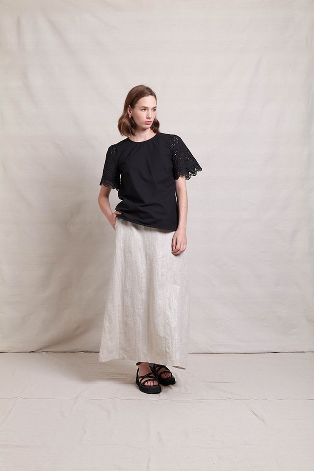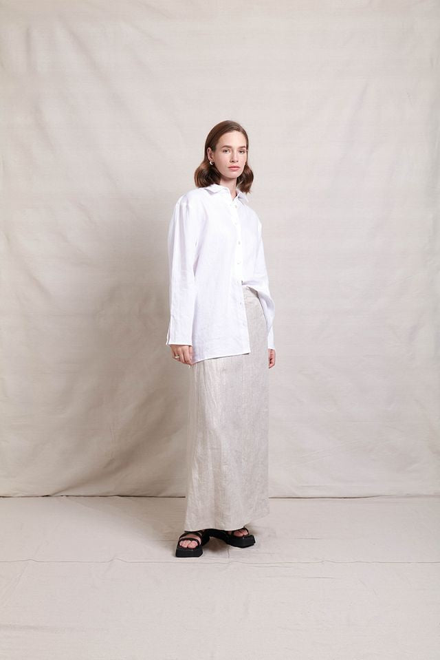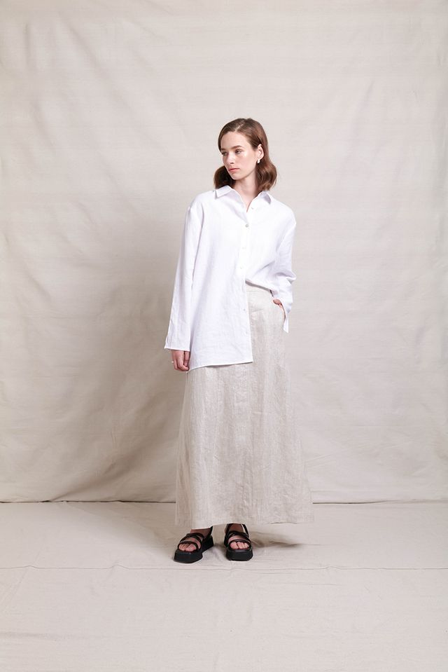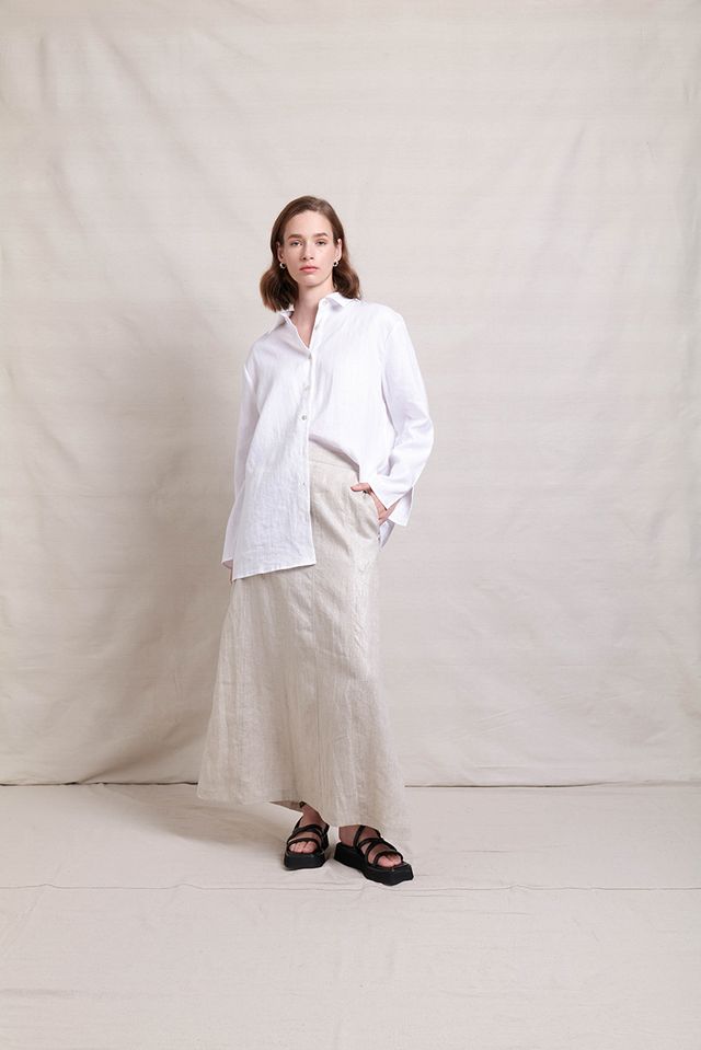 The In Ore Skirt by Neris is a full-length style with panels throughout the skirt. The waist has a flat font, elasticated back and has pockets. Made from 100% linen with a subtle shimmer through the fabric, it pairs beautifully back with the matching In Ore Jacket or Vest.