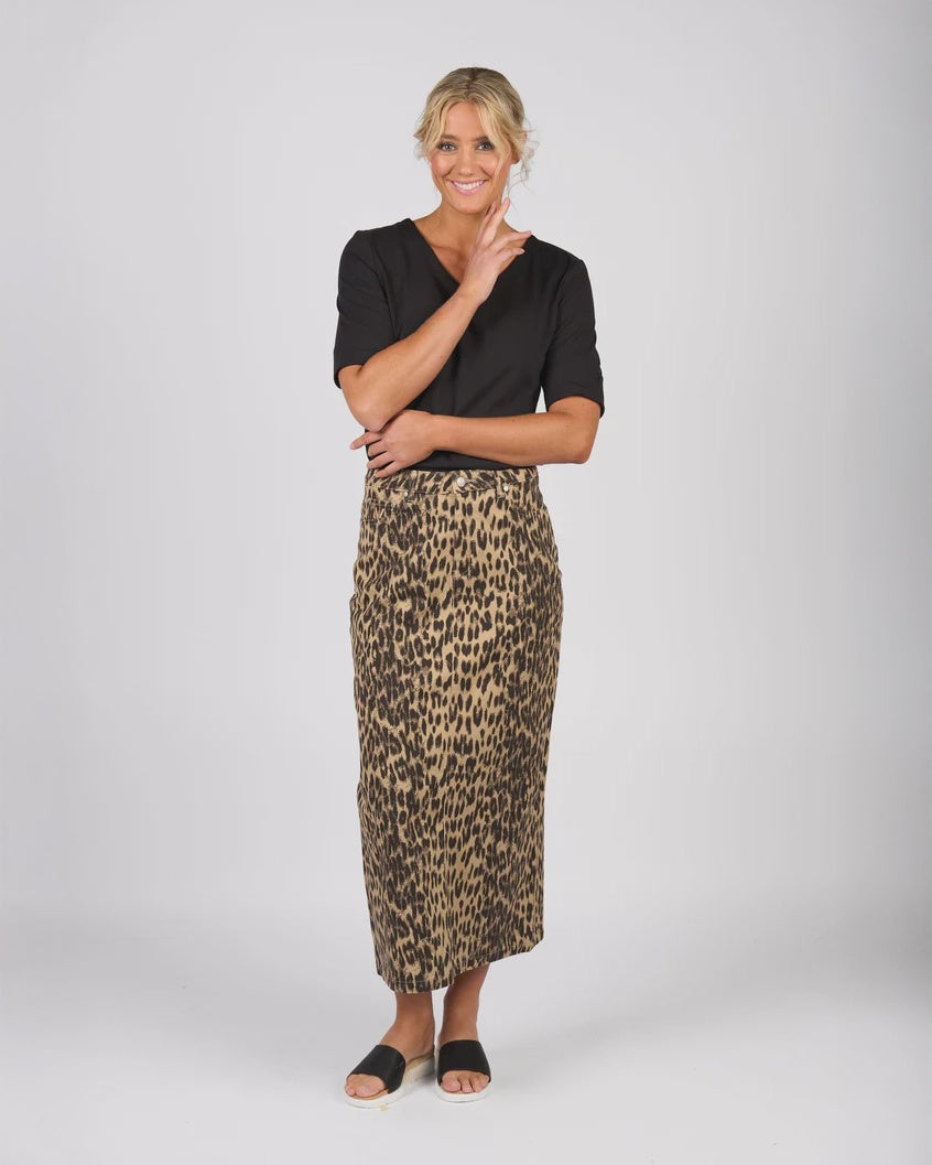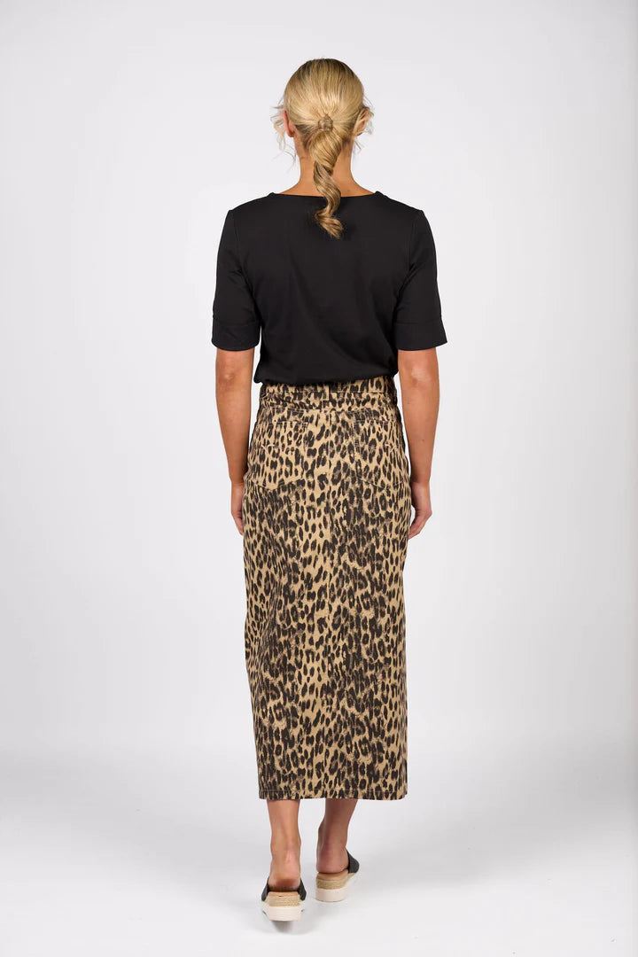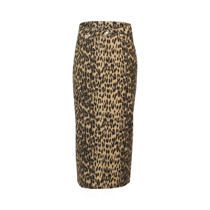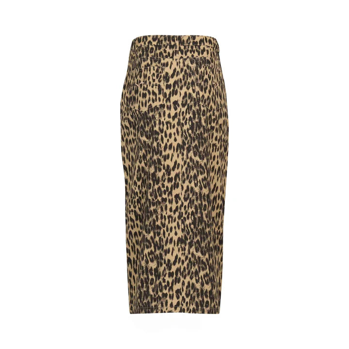 This midi-length skirt is made from lightweight stretch denim in an all-over leopard print, with a centre front split for comfort and easy movement. It features a zip fly, two front pockets, a coin pocket, and two back patch pockets for a practical yet polished look.