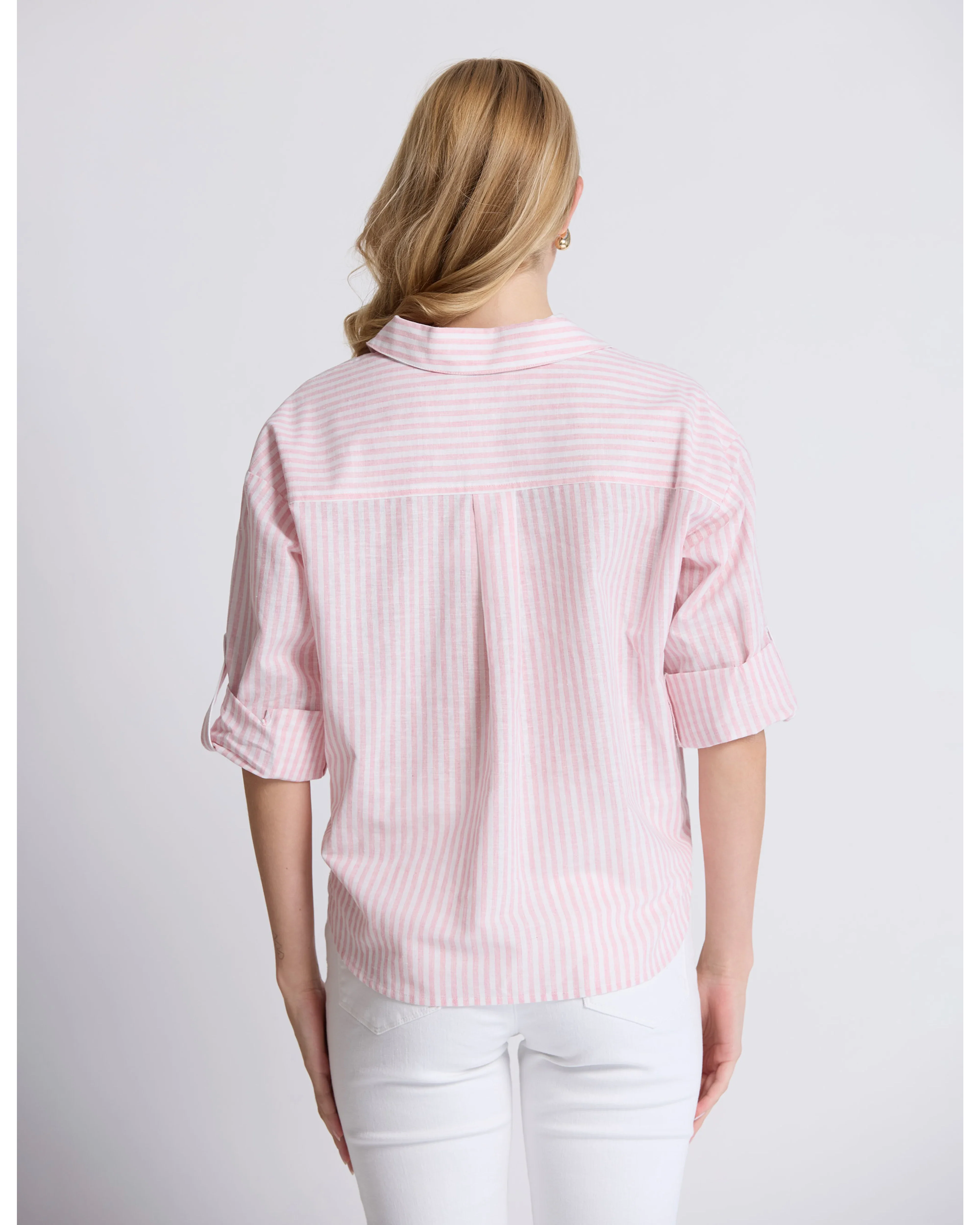 Stella and Gemma On Repeat Blouse Rose Stripe. The shirt of the season is here with its gorgeous open collared button front blouse with twist hem detail and cuffed tabbed sleeves.