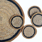 Handcrafted round seagrass natural coaster with jute border of cumin/black.