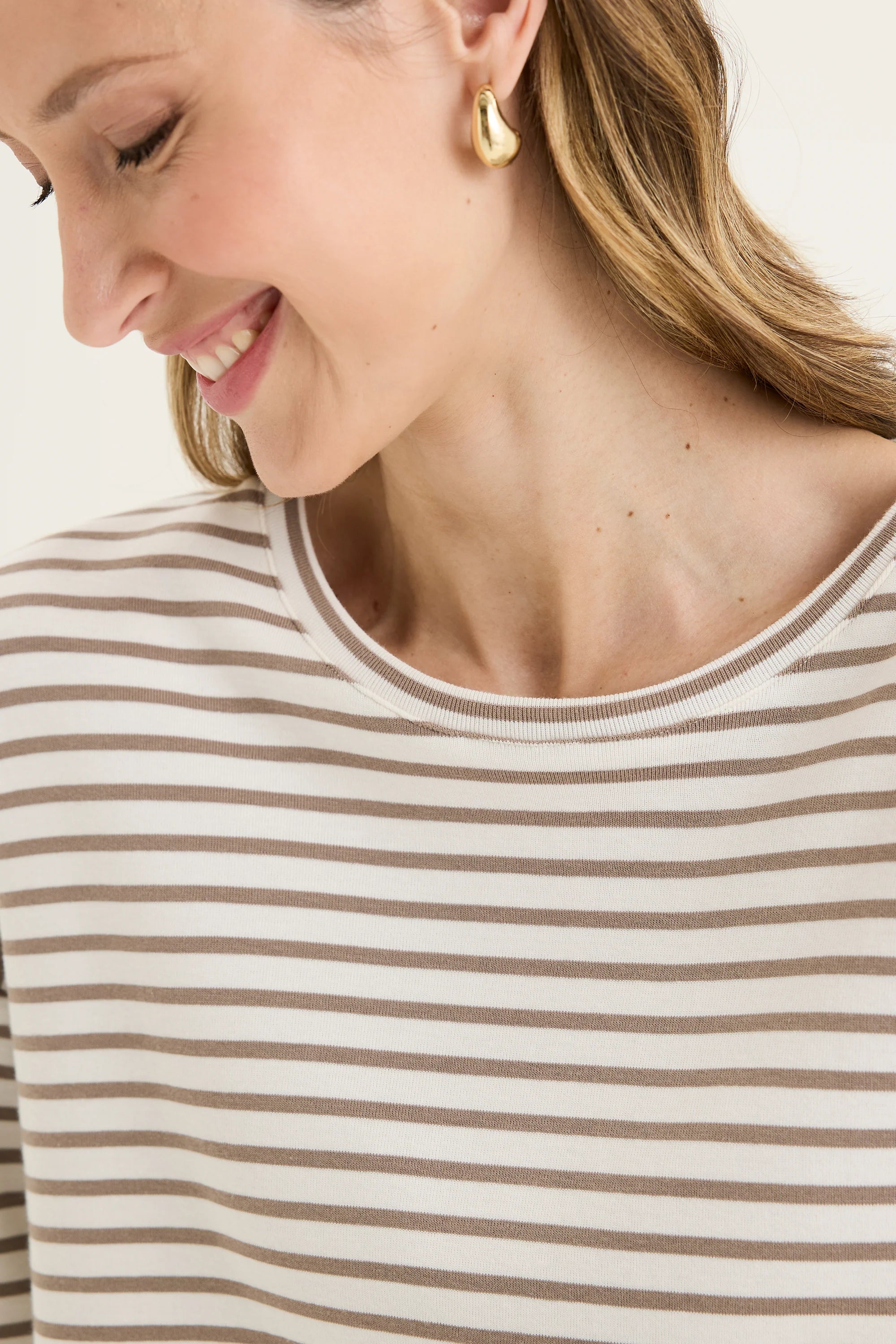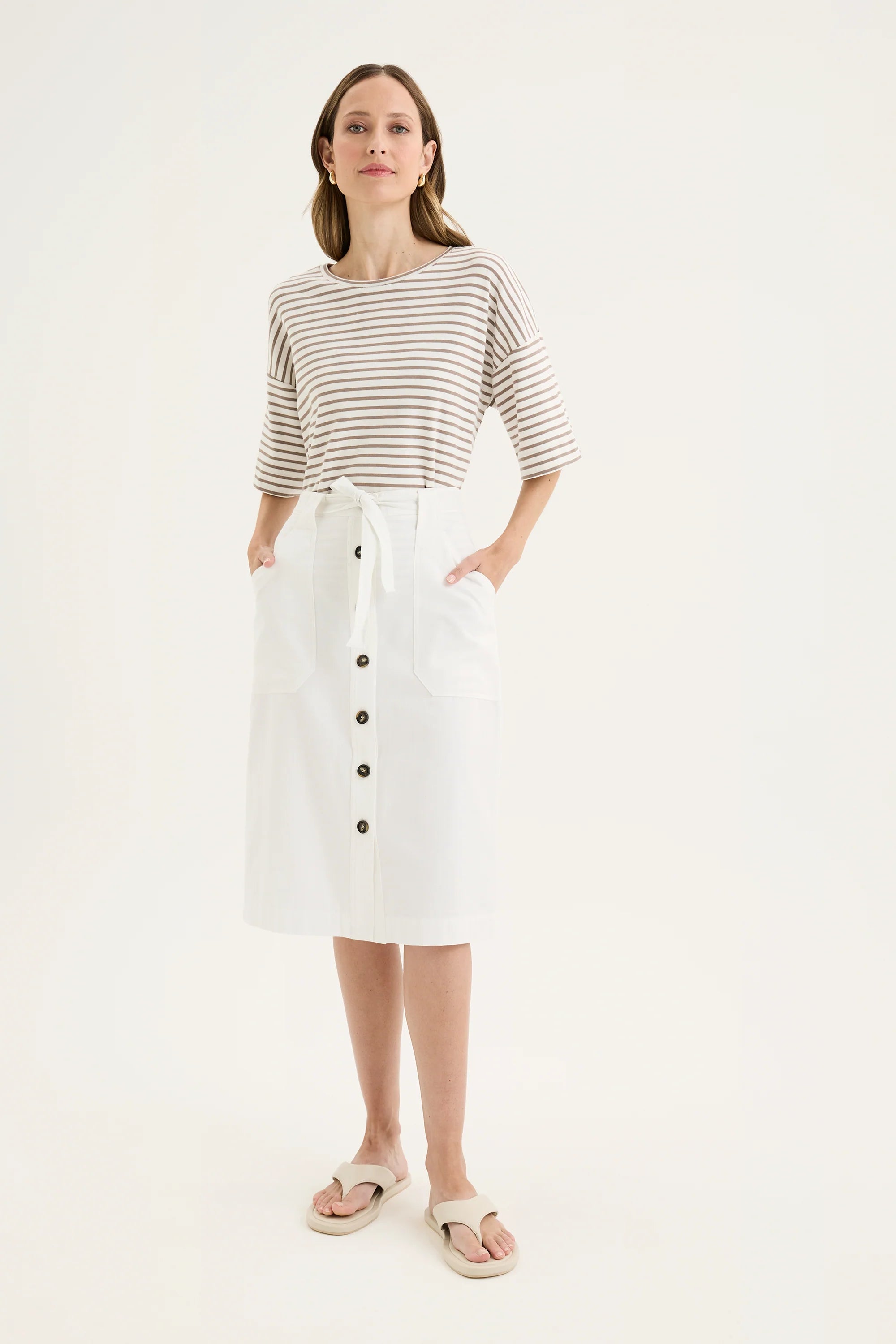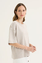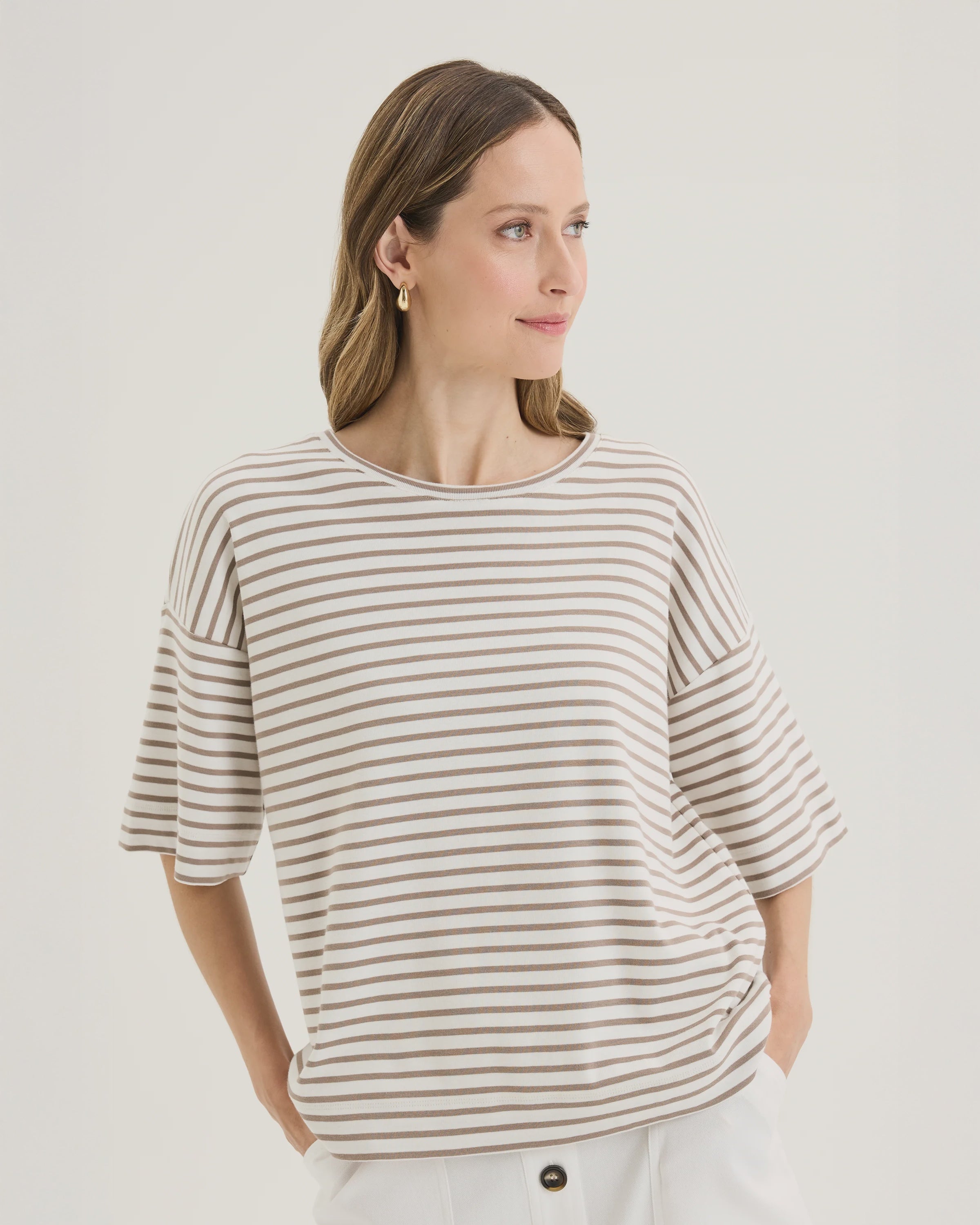The Banda Tee offers a fresh take on everyday dressing, blending classic Yarra Trail quality with a touch of striped character. Crafted from 100% cotton, it features clean yarn-dyed stripes and a relaxed, slightly boxy silhouette that nods to a more structured, tailored shape - balanced by the soft drape and refined detailing.