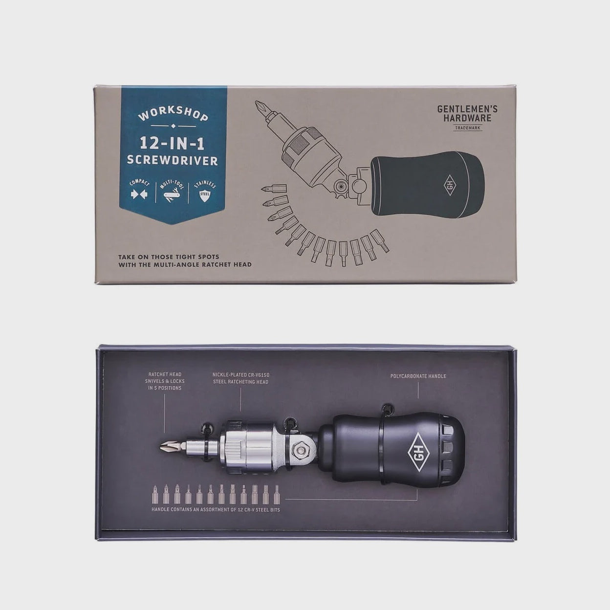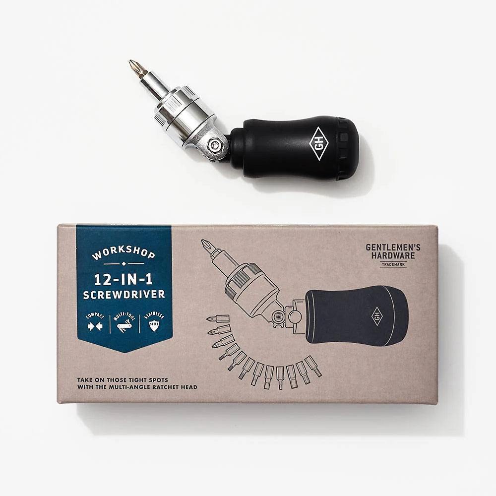 Versatile 12 in 1 Screwdriver, featuring a multi-angle ratchet head that effortlessly swivels and locks in five positions, making it the ideal tool for tightening or loosening tasks from any angle. Crafted for the handyman, it comes in a stylish ready-to-gift box, offering both functionality and aesthetic appeal for a seamless addition to your toolkit.