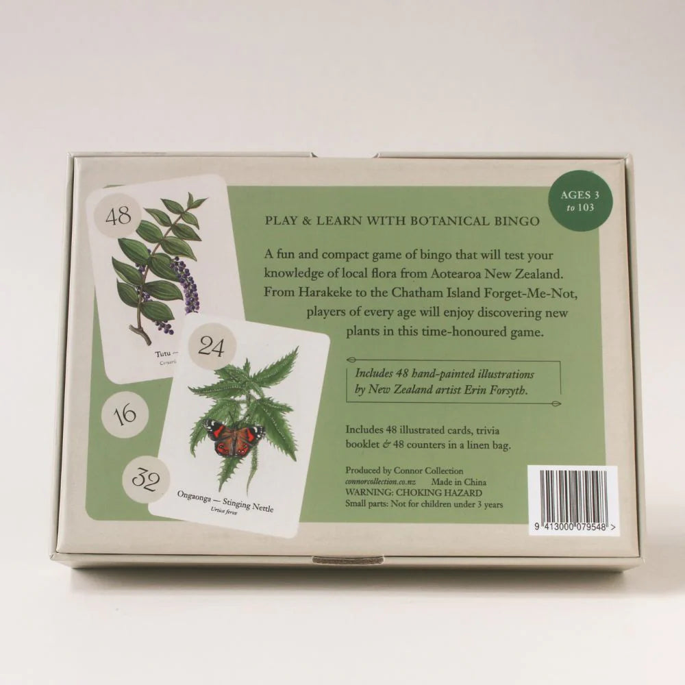 Botanical Bingo features 48 high quality cards, each displaying hand painted Aotearoa native flora. A trivia booklet provides information on all the 48 native plants. Playing counters are held in a cotton bag.