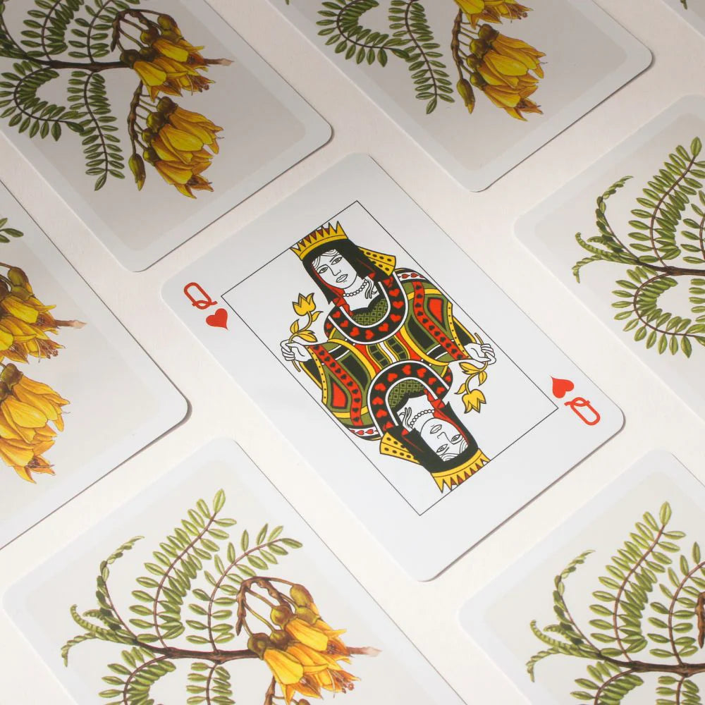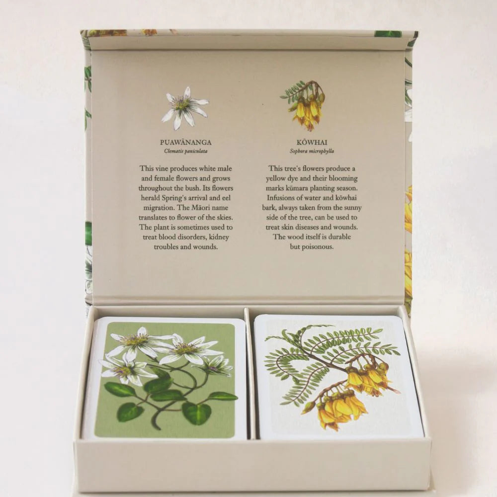The back of the cards display paintings of the Kowhai and Clematis flowers.