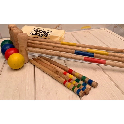 Engage in a fun and competitive battle with your loved ones and friends while playing with this Easy Days Wooden Junior Croquet Set. Designed to be played by four people, this playset includes four balls and four mallets. It is also made from a durable wooden material, so it can withstand daily wear and tear.