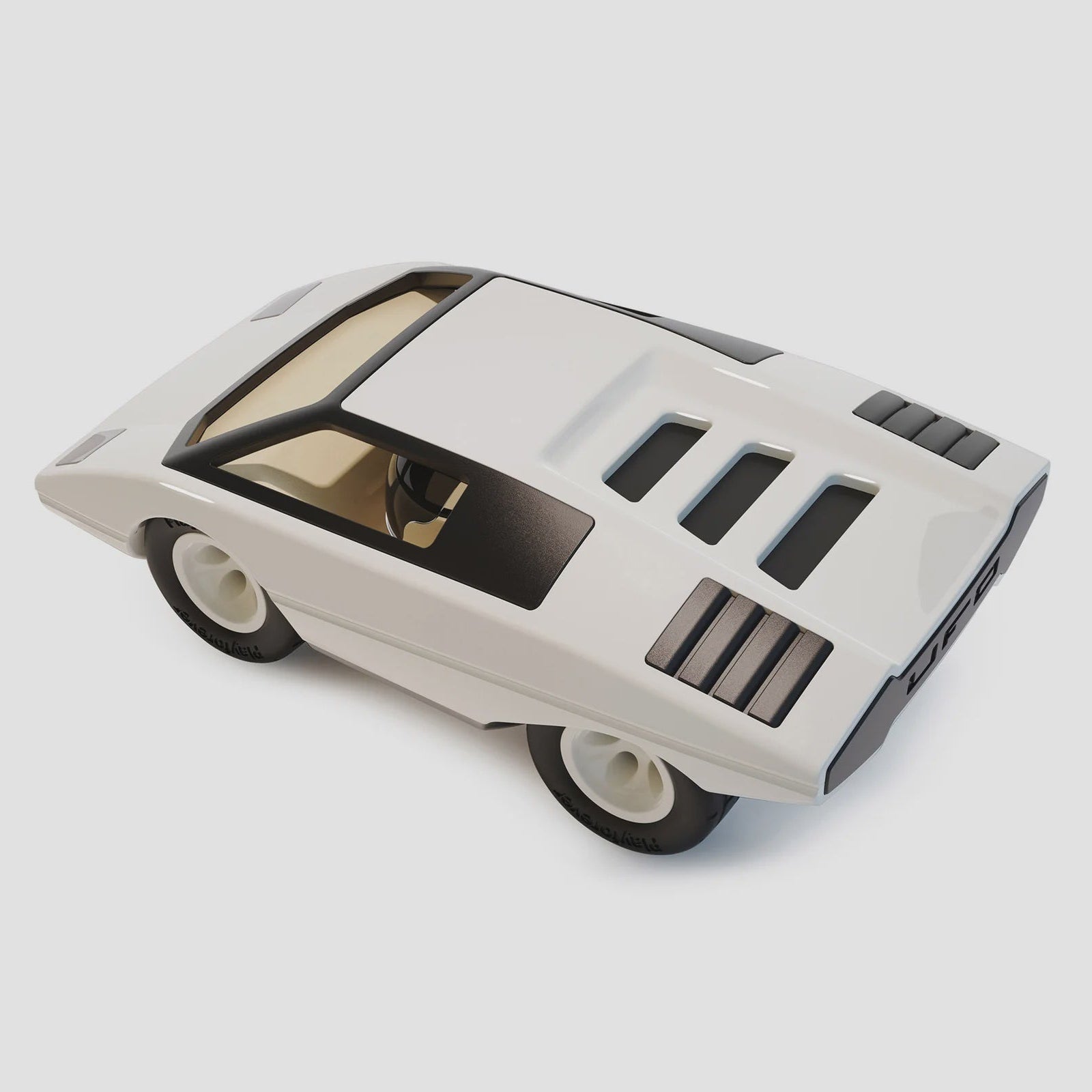 The UFO Toy Car pays homage to the radical 70s concept cars born from the futuristic visions of 60s Italian designers. These angular, wedge-shaped vehicles, with their low rooflines and roaring V12 engines, left a lasting impact on popular culture, influencing everything from Sci-Fi films to fighter jets. UFO celebrates bold dreams and transformative design.