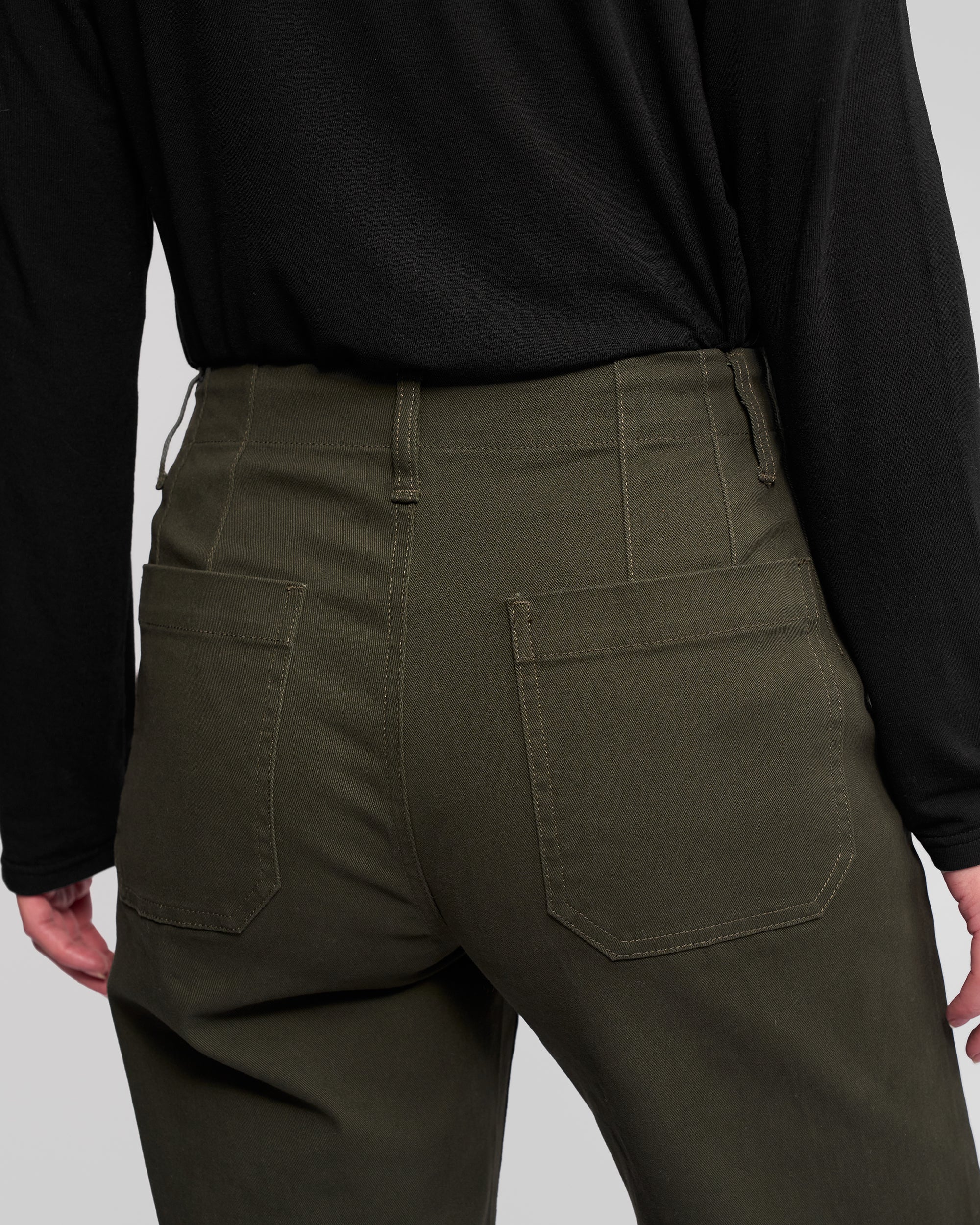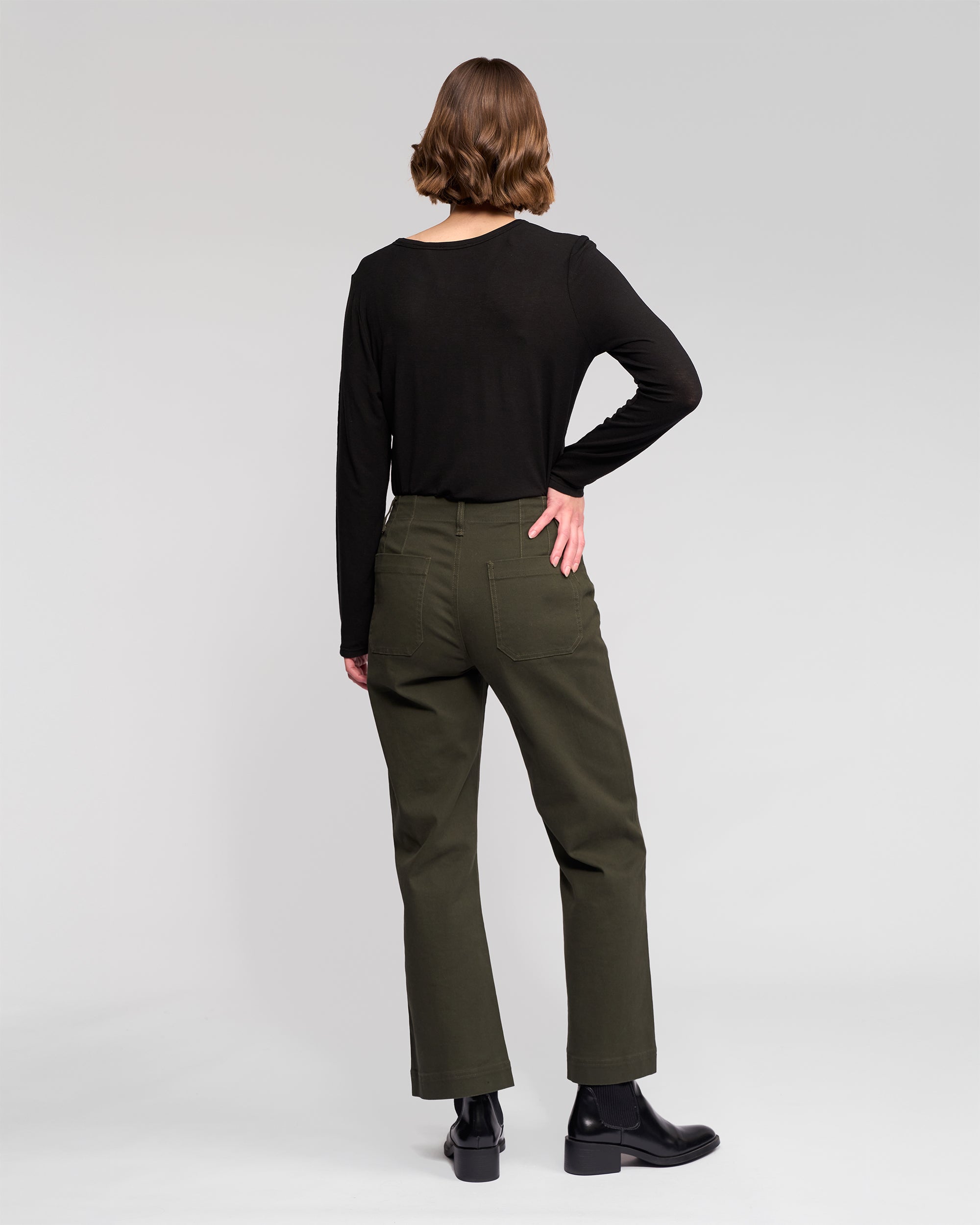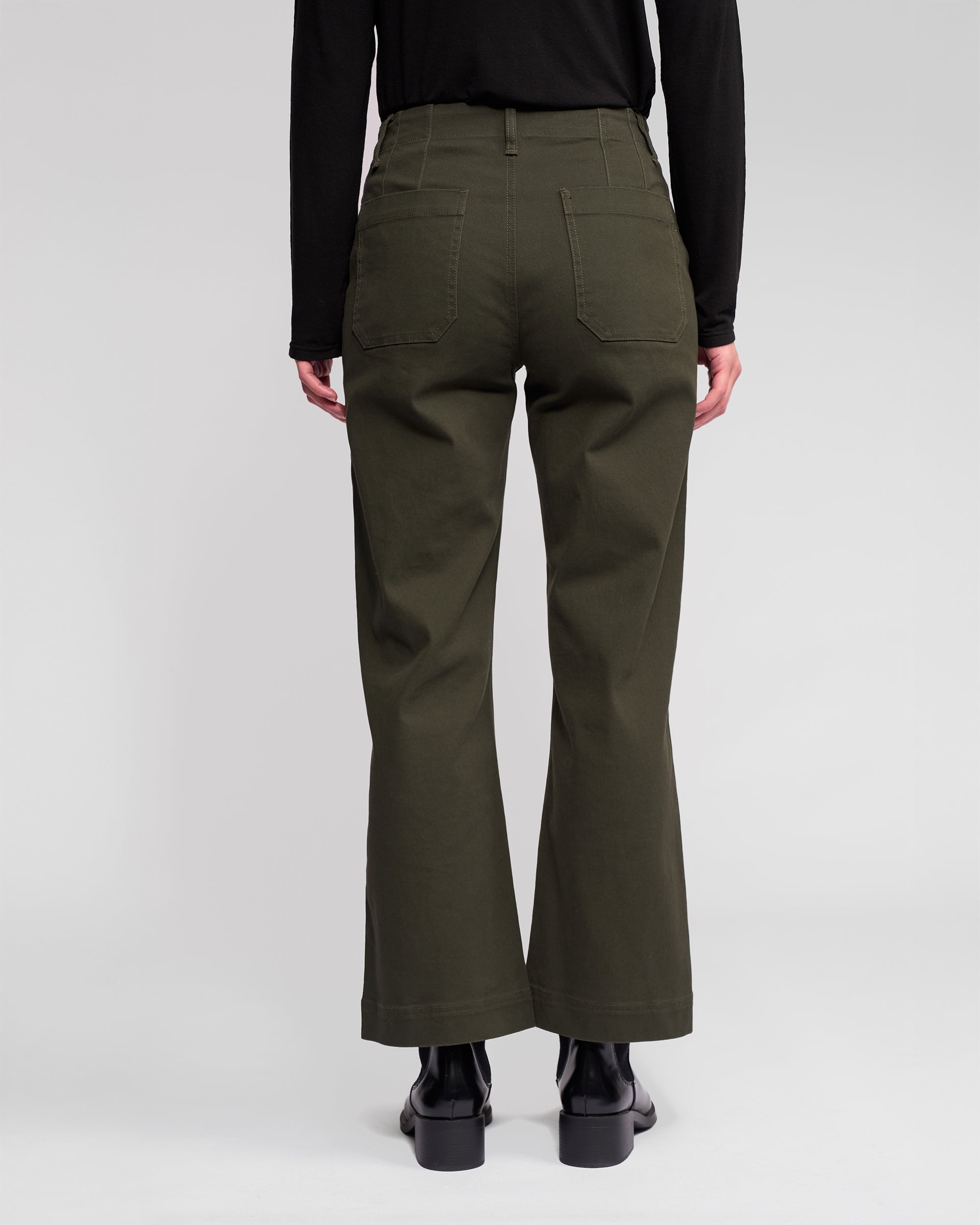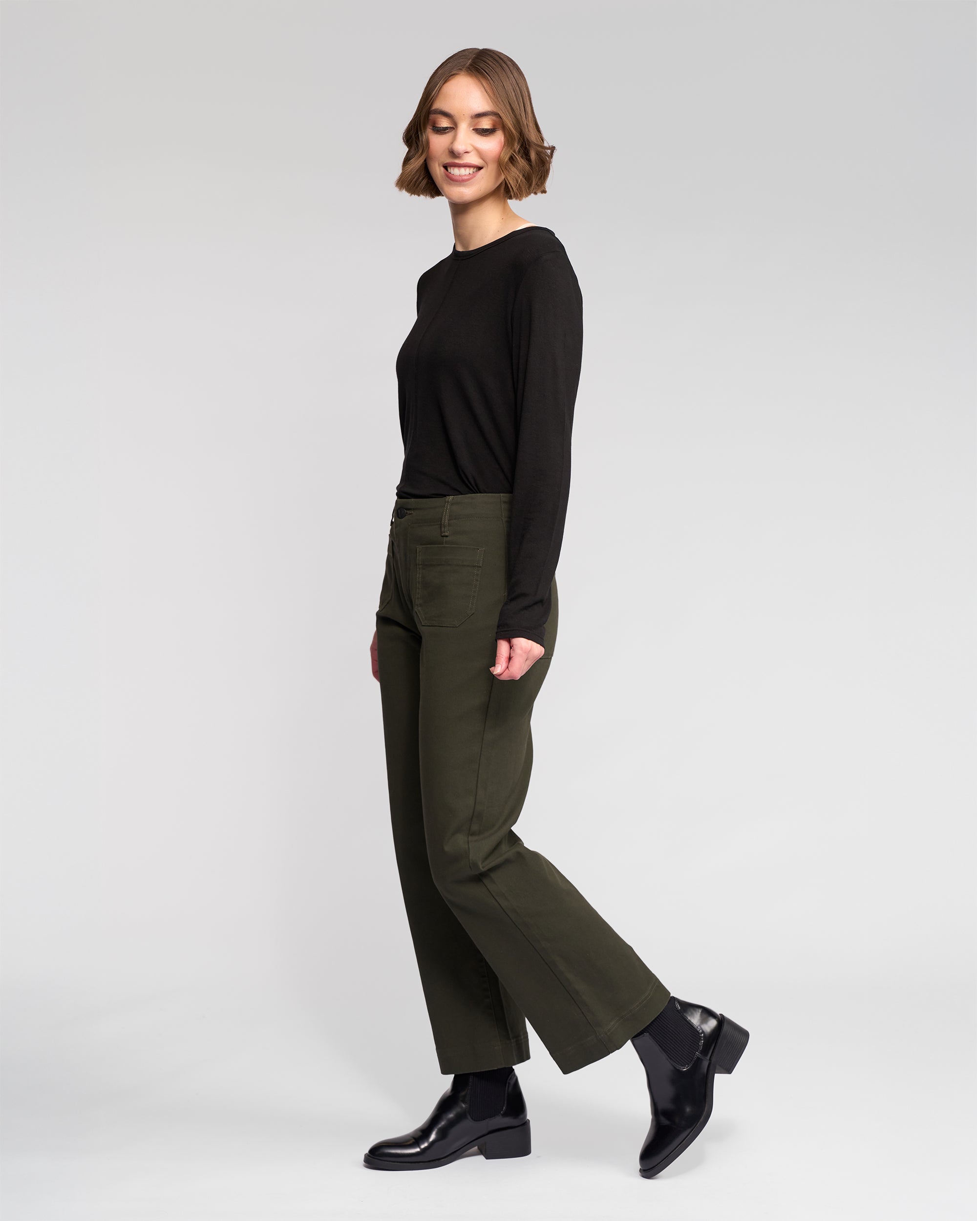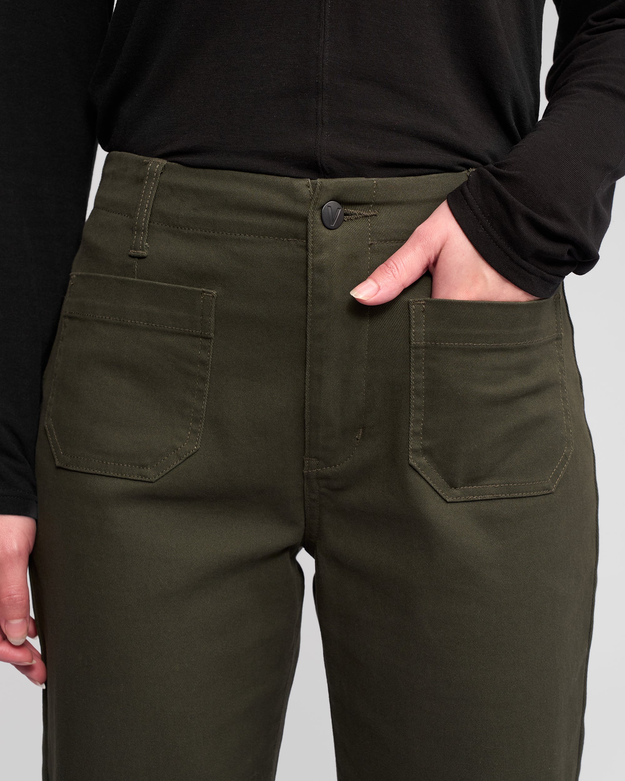 Wide-leg ankle-grazer pant in stretch denim, designed in our Hunter colour — a dark green. Featuring a zip fly and metal ‘V’ logo jean button, this style offers a comfortable, flattering fit with statement patch pocket detailing.