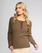 Casual long-sleeve top in our Chocolate/Oat colourway. Designed with a round neckline and partial button placket, this style is finished with delicate ruffle detailing at the placket and sleeve cuffs for a relaxed yet considered everyday piece.