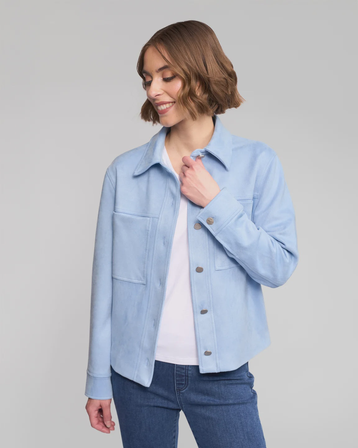 - Faux suede button-up jacket