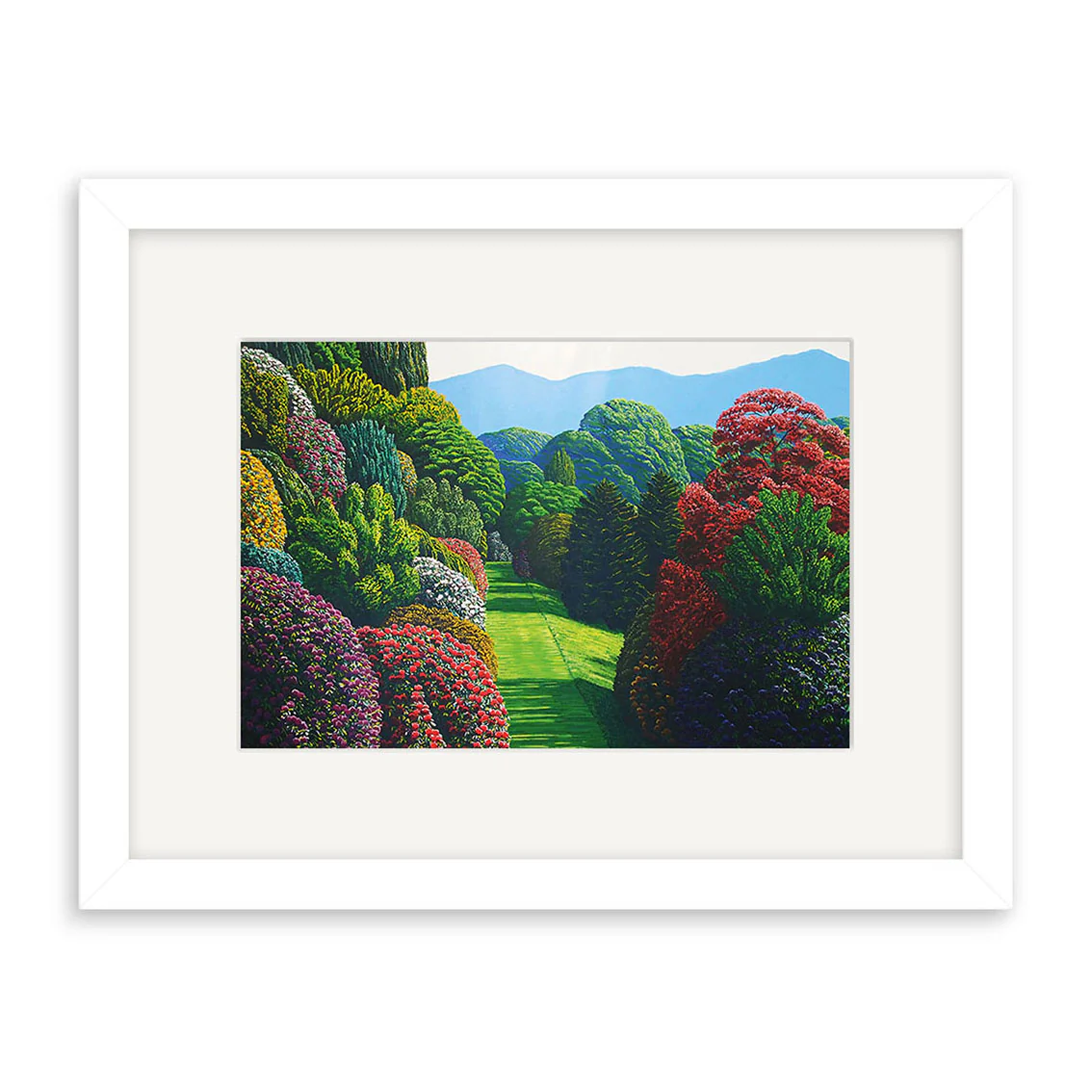 From the collection of prints by Karl Maughan, a New Zealand artist known for his oil paintings of gardens and floral scenery. This print comes beautifully framed in a quality white frame.