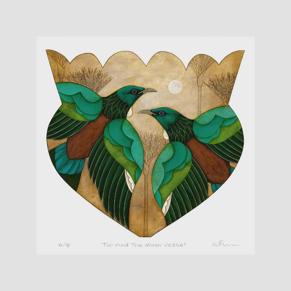 Balancing symbolism and serenity, Tui and the Moon Vessel by Kathryn Furniss draws inspiration from Aotearoa’s native birdlife and celestial rhythms. The tui, perched in quiet contemplation, is framed by delicate patterns and a luminous moon, offering a sense of stillness, wonder, and connection. Printed with archival inks on 100% cotton textured paper, this loose print adds a thoughtful, nature-inspired presence to your space.