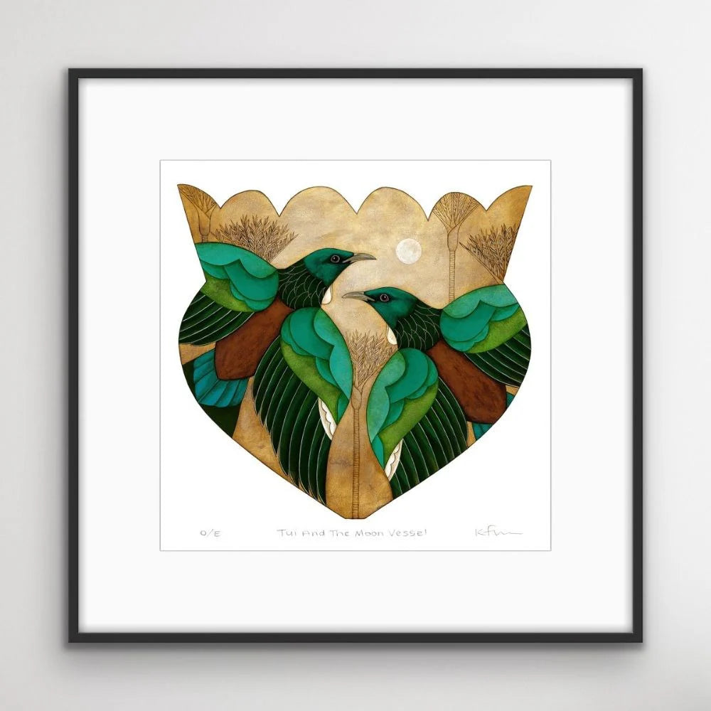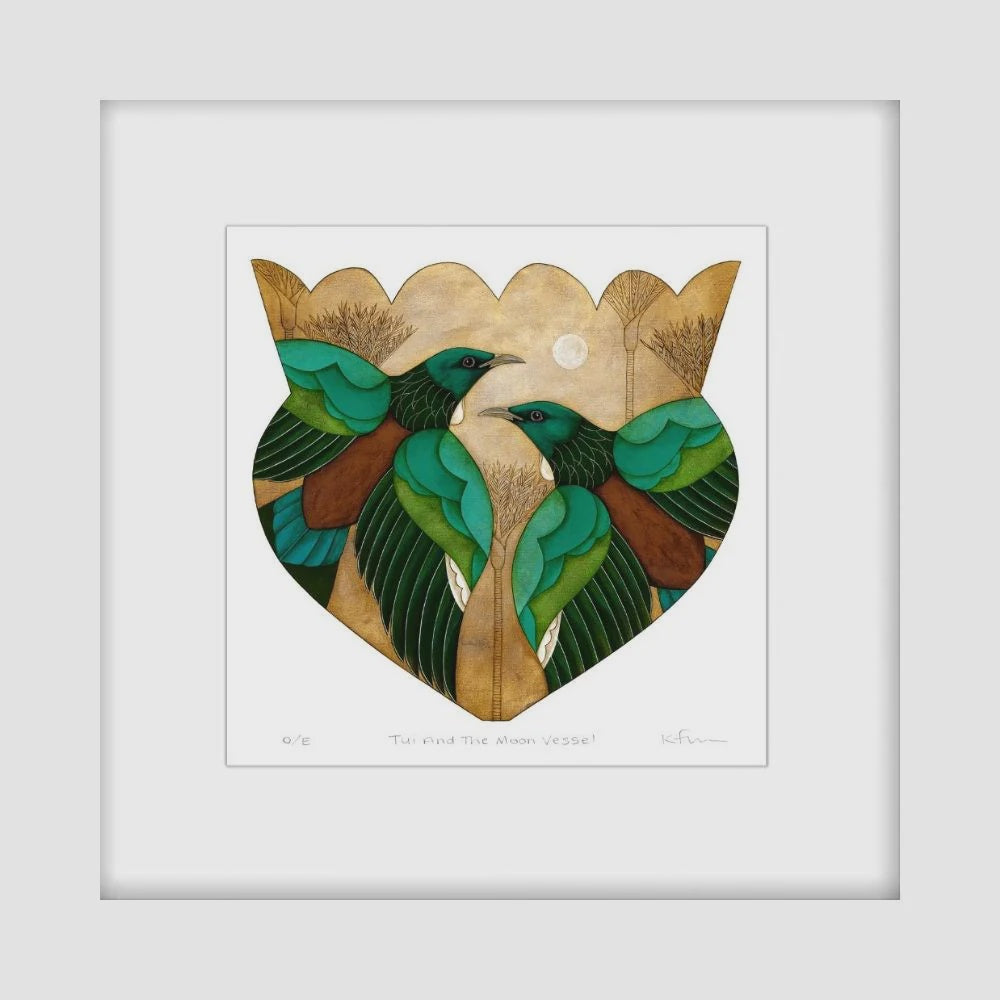Balancing symbolism and serenity, Tui and the Moon Vessel by Kathryn Furniss draws inspiration from Aotearoa’s native birdlife and celestial rhythms. The tui, perched in quiet contemplation, is framed by delicate patterns and a luminous moon, offering a sense of stillness, wonder, and connection. Printed with archival inks on 100% cotton textured paper, this matted mini print adds a thoughtful, nature-inspired presence to your space.