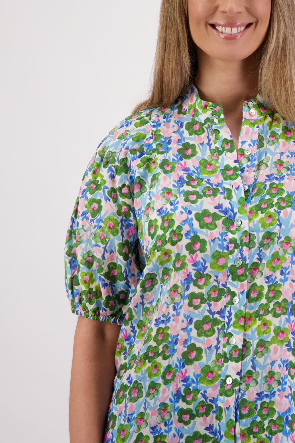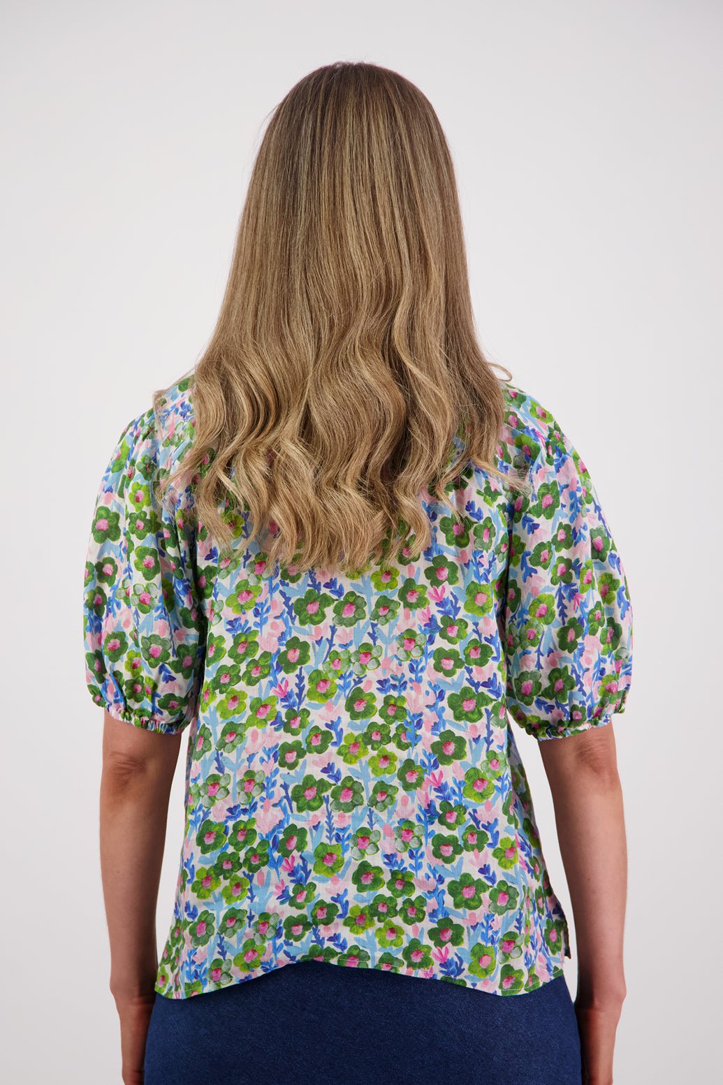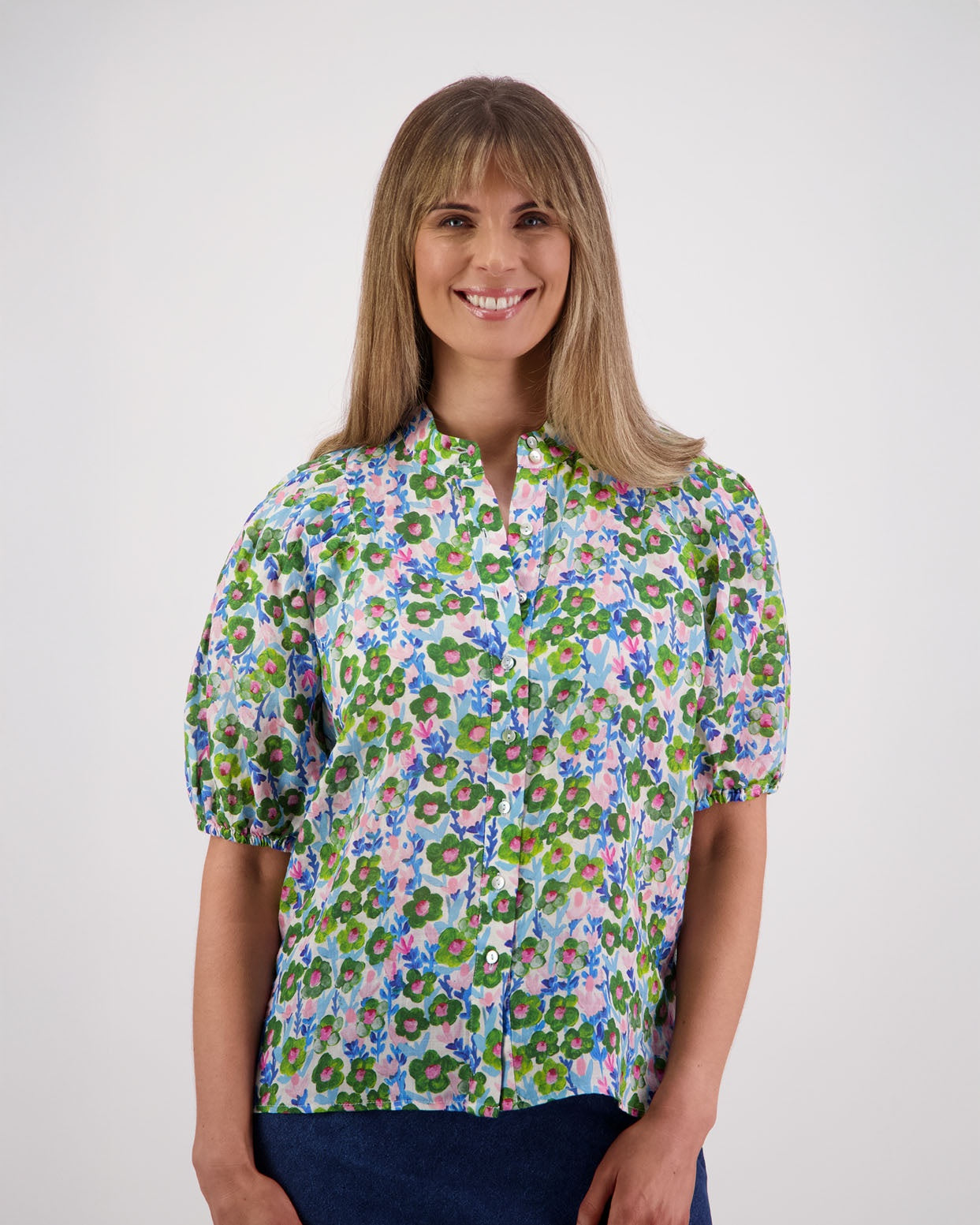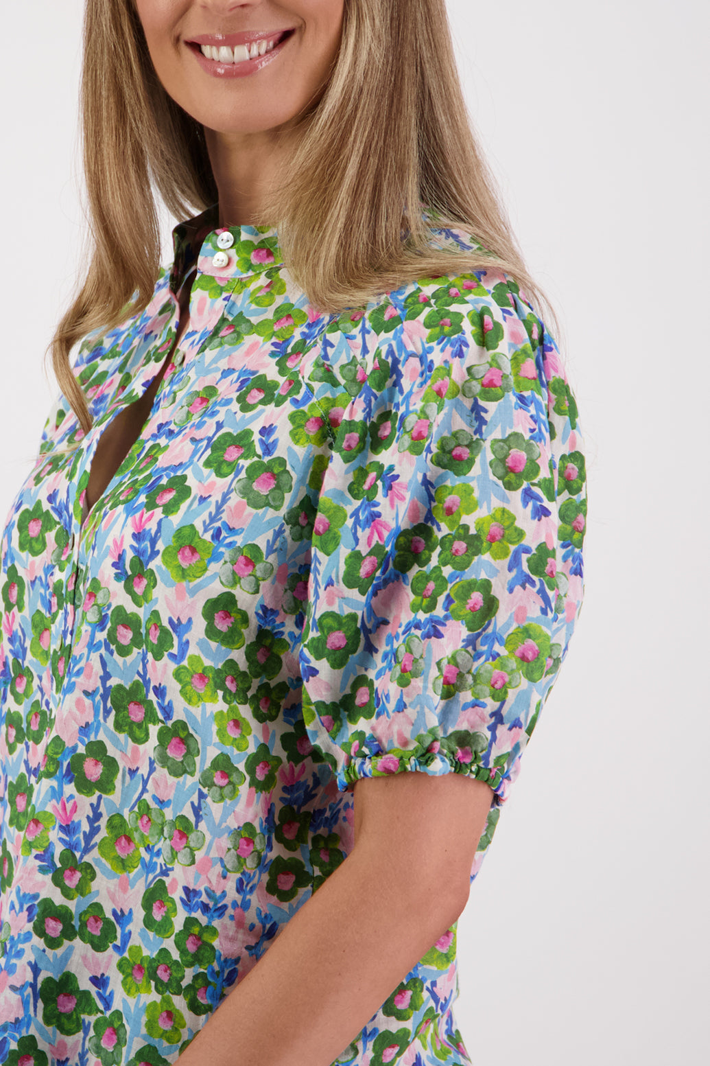 A flattering Ramie top with pleats across the shoulders forming soft gathered puff elbow length sleeves. The grandpa collar level ups this shirt, creating versatility for all occasions.