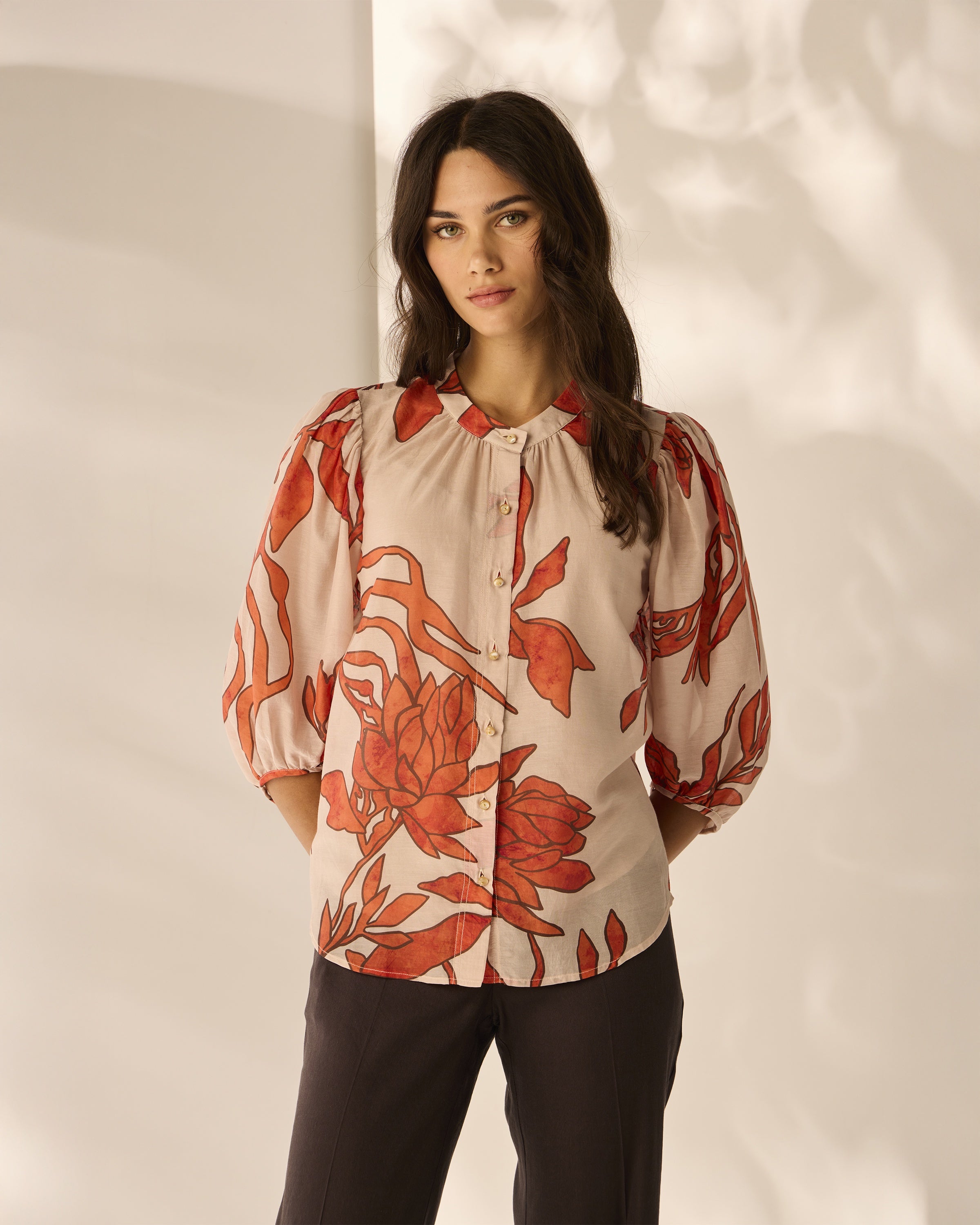 Embrace timeless elegance with the Chino Shirt, a button-through silk/cotton blend adorned with the Chino Print. Soft gathers at the neckline and 3/4 sleeves gathered into a narrow cuff create a captivating look. This shirt is a must-have for those who appreciate contemporary design with a touch of grace.