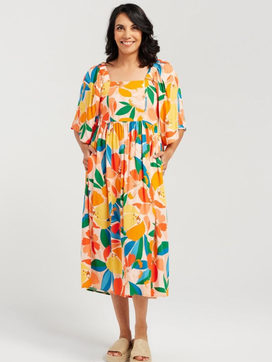 The striking colours of Blackstone's Square Neck Print Dress is sure to turn heads this summer. Made from 100% rayon, this dress promises breathability and a soft feel, making it ideal for any summer occasion. The soft rayon drapes beautifully while the shirred back panel promises ultimate comfort. The distinctive square neckline and flowing sleeves, teamed with the bright print makes this a fun and youthful dress for the coming season.