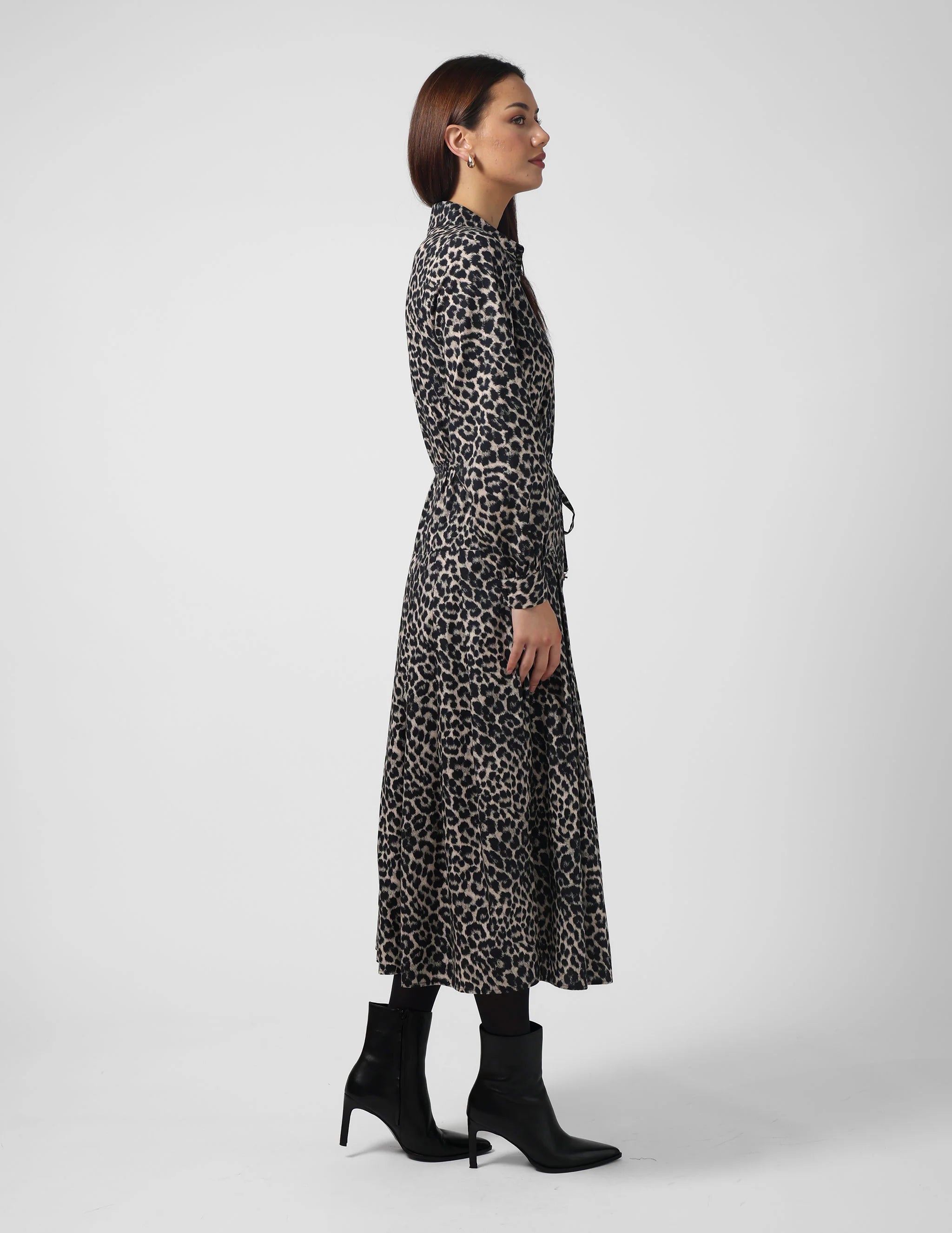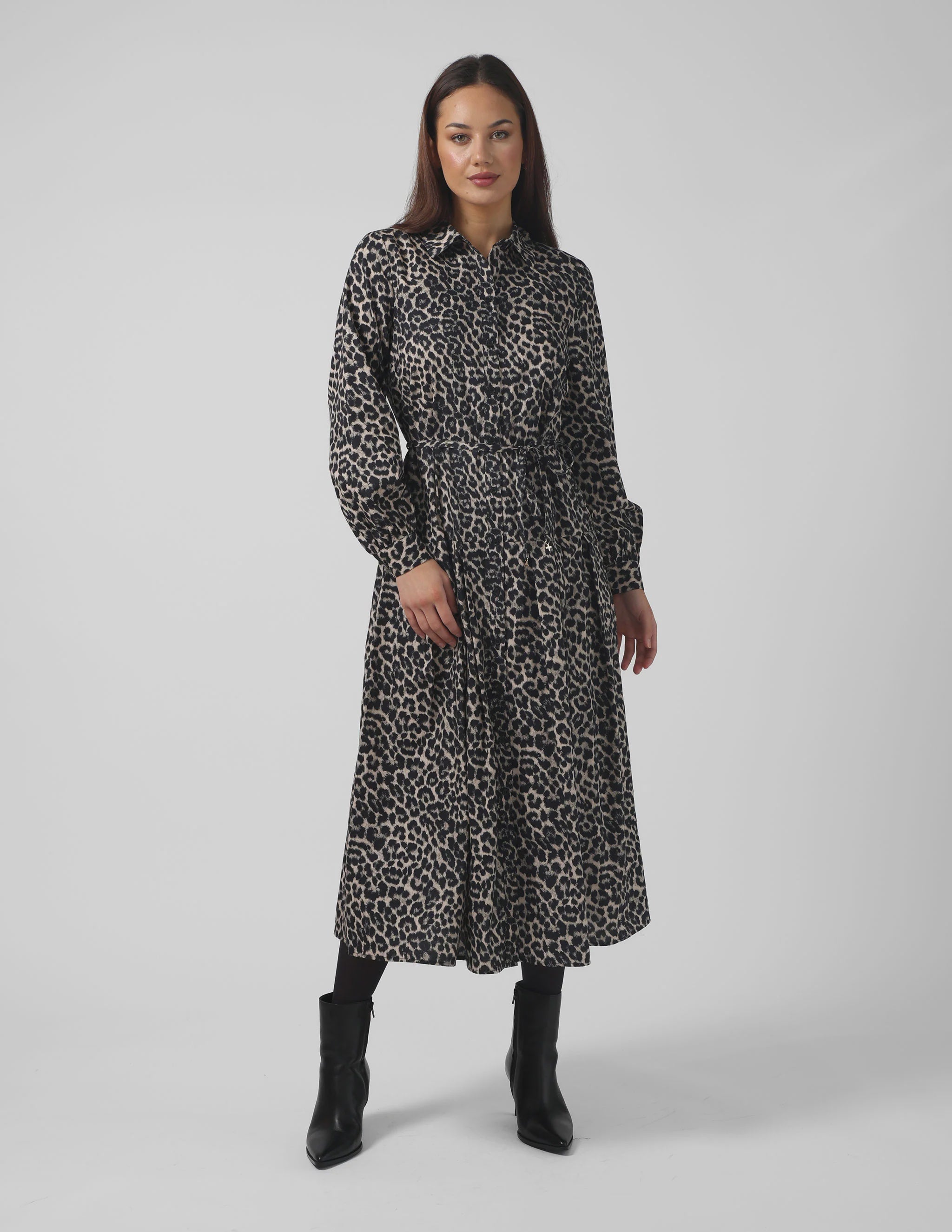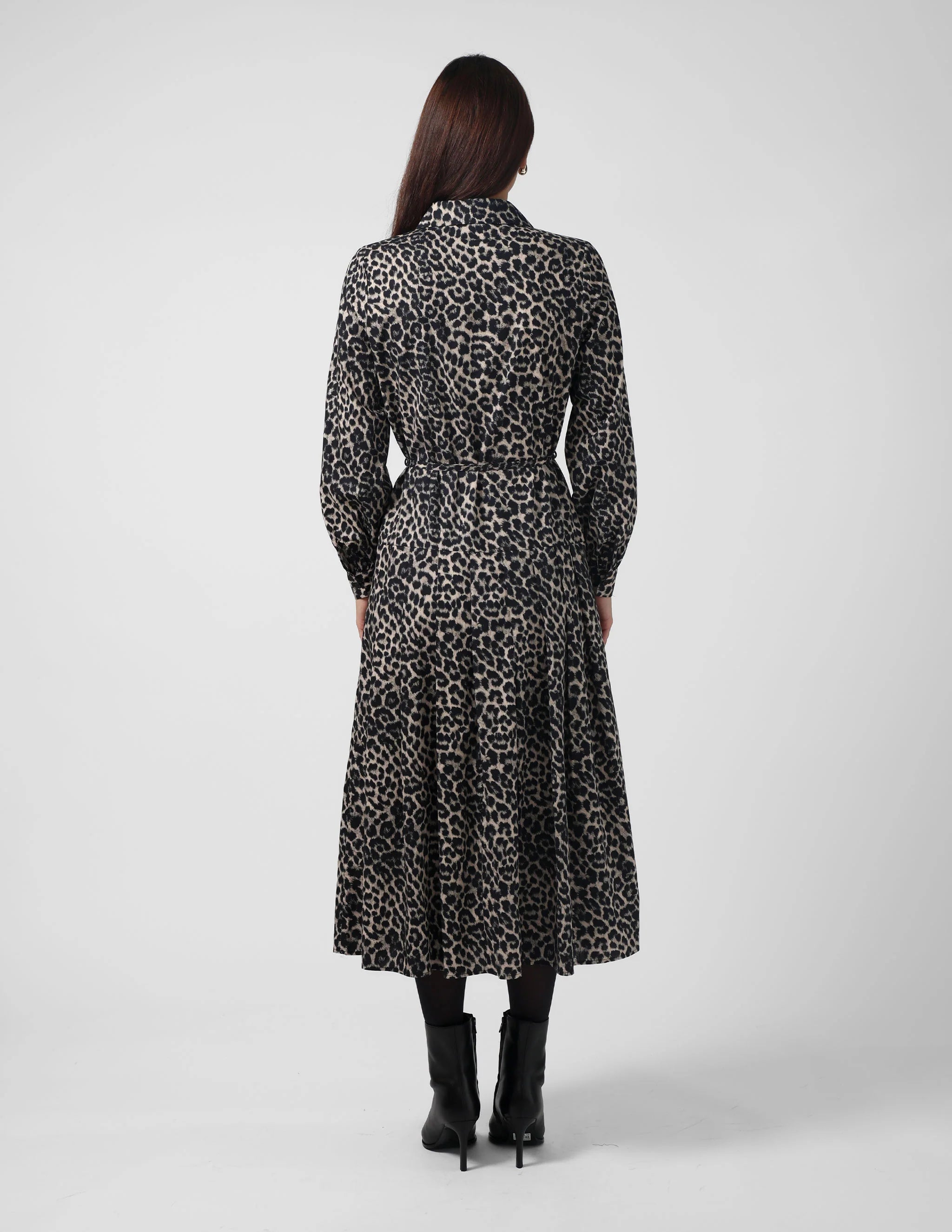 Buttonfront midi dress with collar and dropped waistline. Box pleats from low waist seam and self fabric waist tie with gold logo pendants.