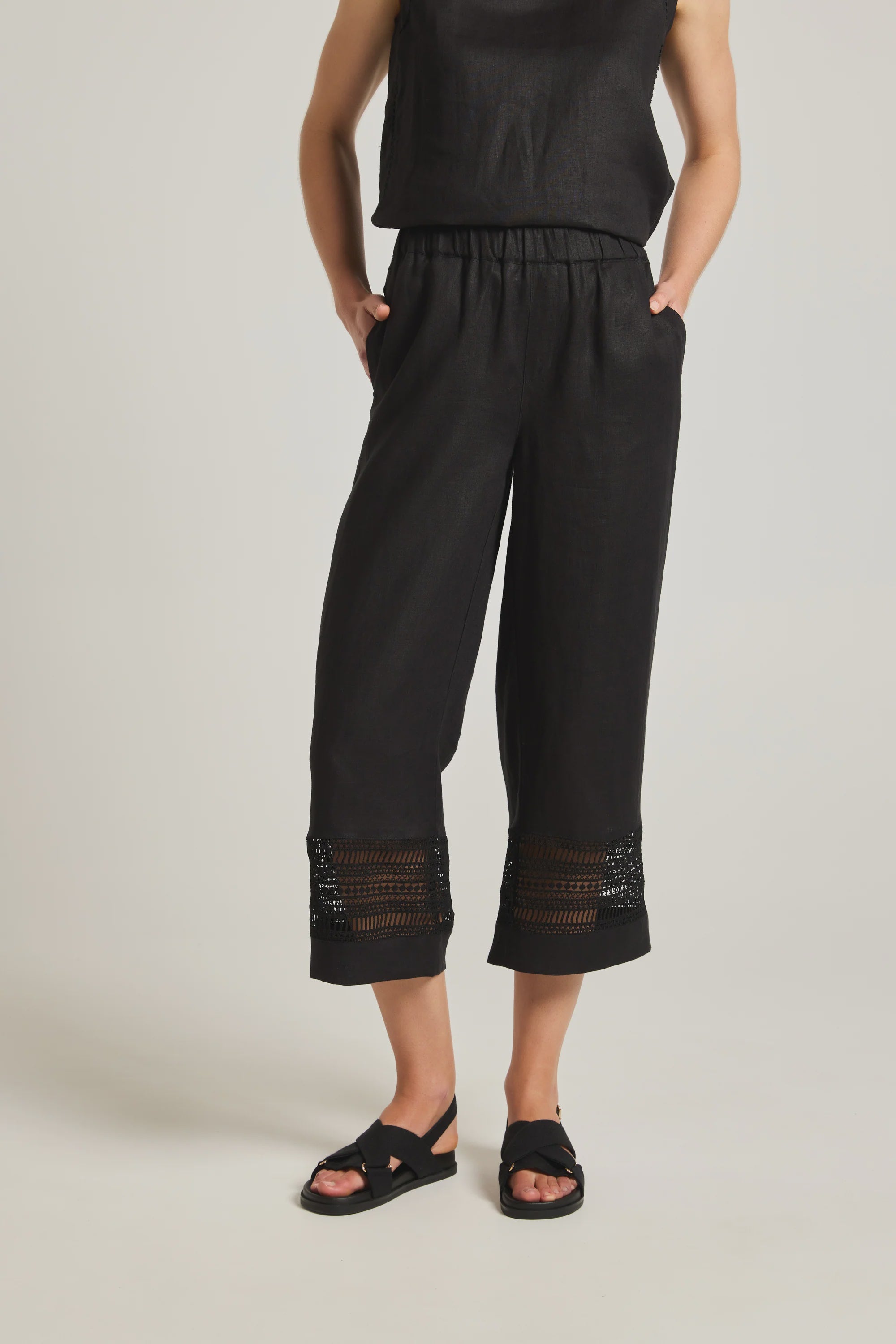 Lotus Pants in 100% linen combine comfort and chic style. The cropped wide-leg design features ladder lace trims for a feminine touch. With an elasticated waistband and side pockets, these versatile pants effortlessly pair with any top, making them a go-to for everyday elegance.