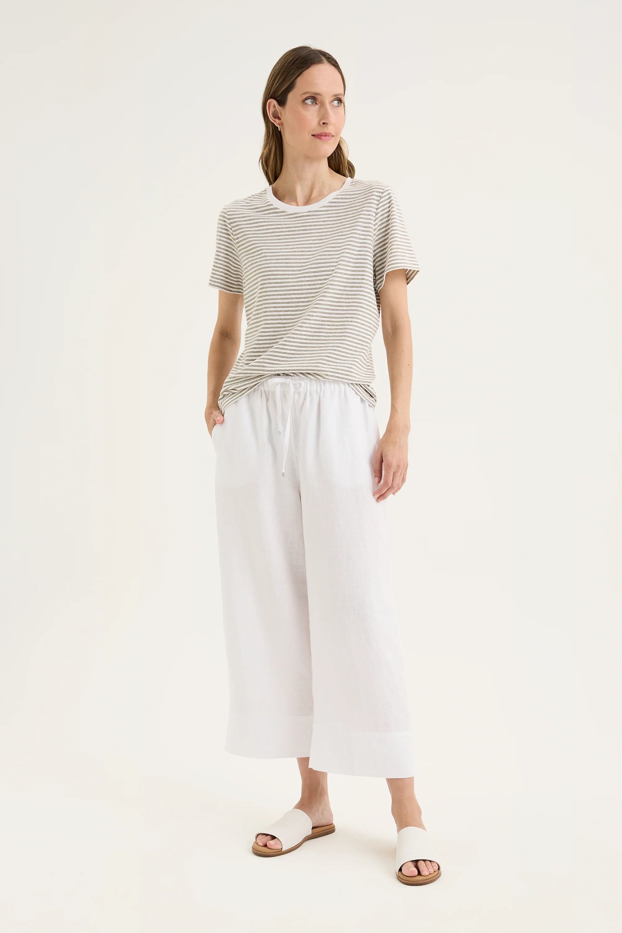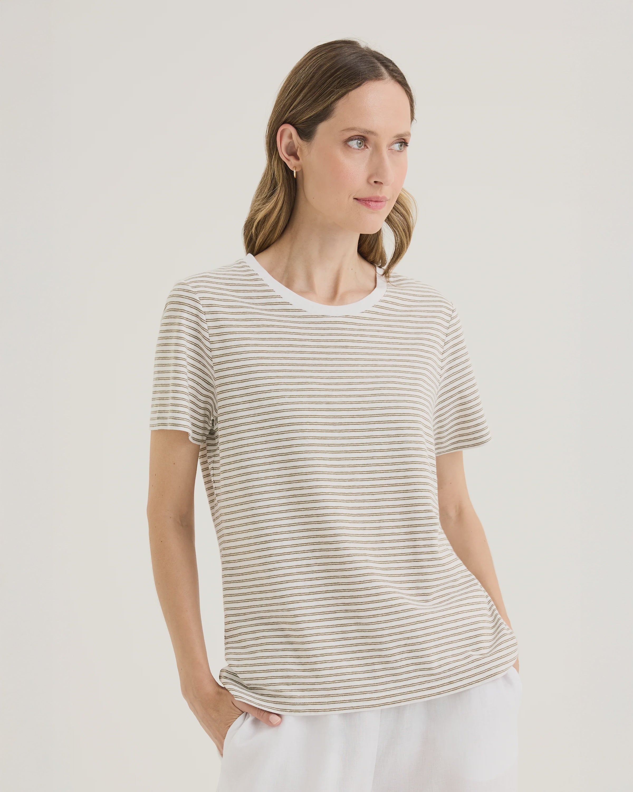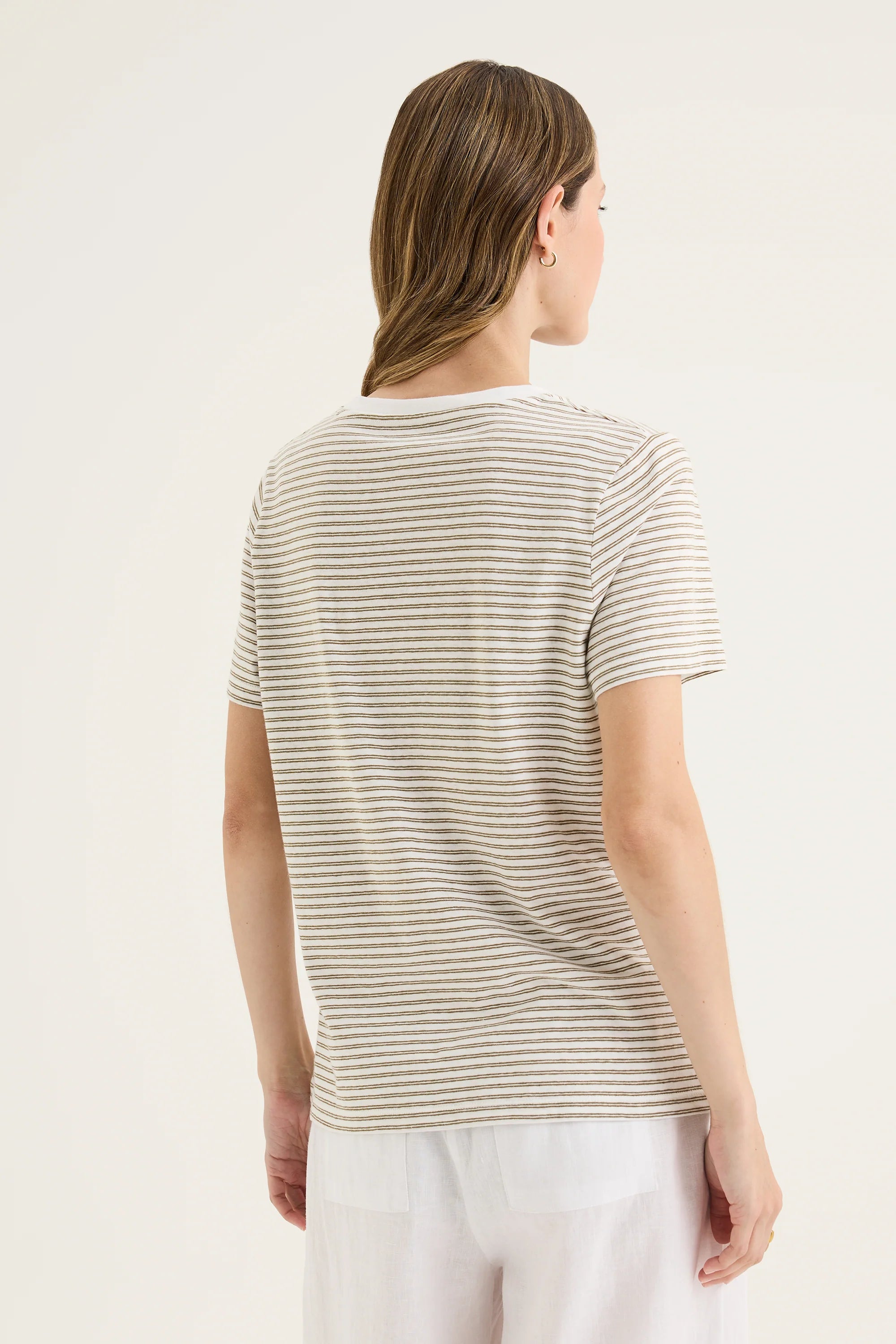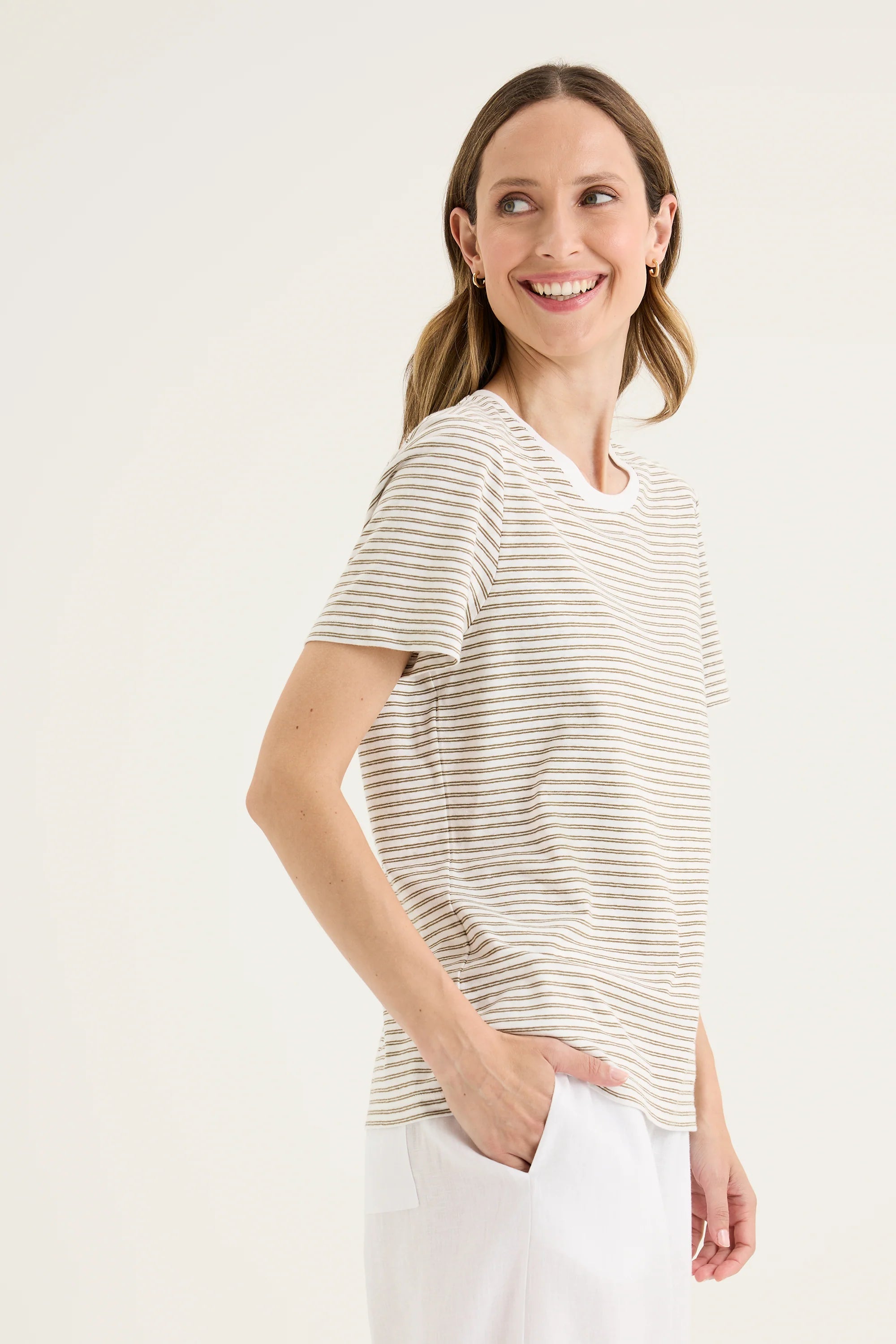 The Ridge Tee is a refined wardrobe staple, bringing quiet character to a classic silhouette. Crafted from a breathable linen-cotton blend with a supple hand feel, it features fine yarn-dyed stripes that read almost as a solid colour from a distance - offering subtle texture without overwhelming the look.