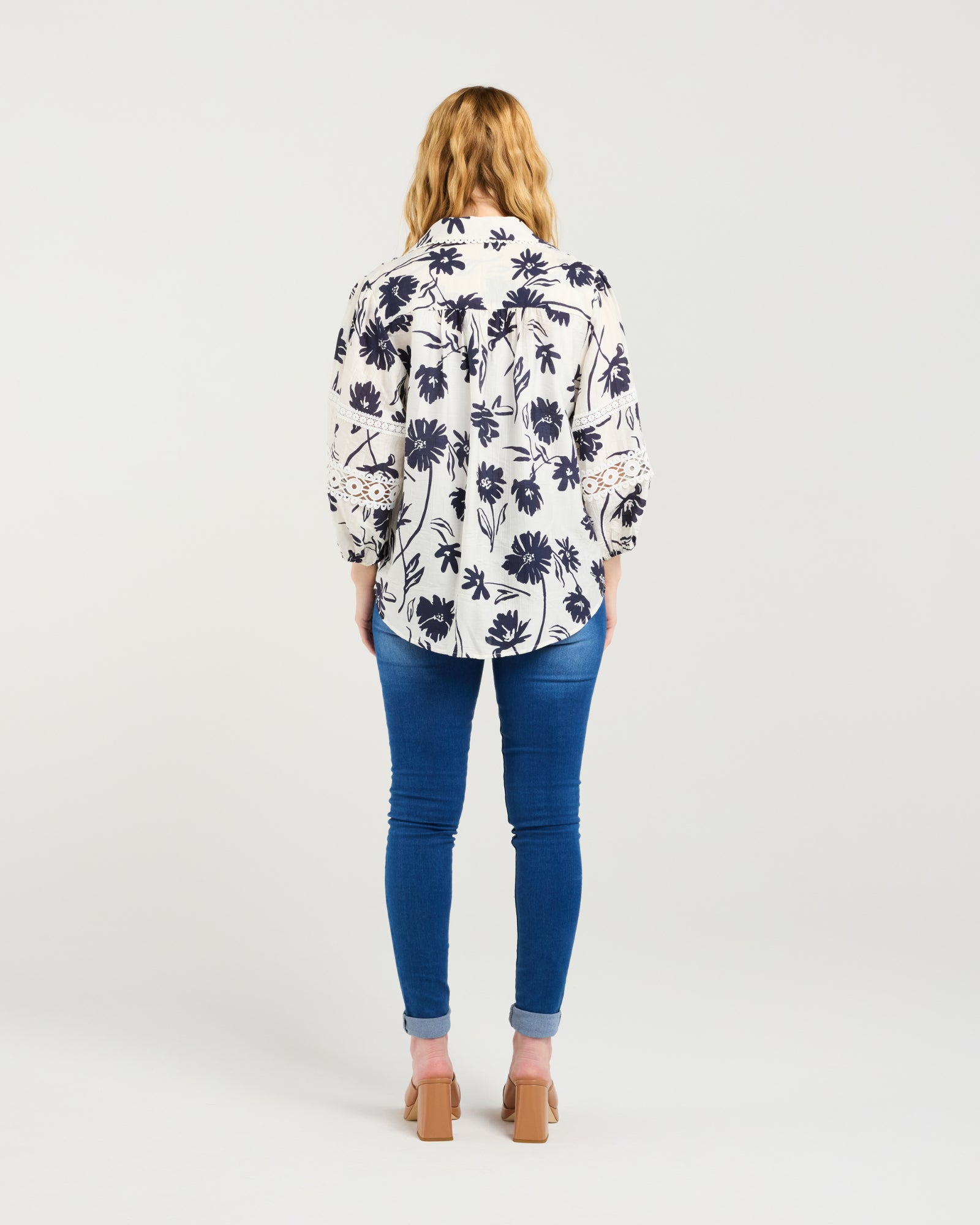 This elegant button-down shirt features a classic collar neckline and puffed 3/4 sleeves with elasticated cuffs, adorned with delicate lace inserts. The small scalloped trim around the collar and button stand adds a refined touch to this timeless, feminine piece.