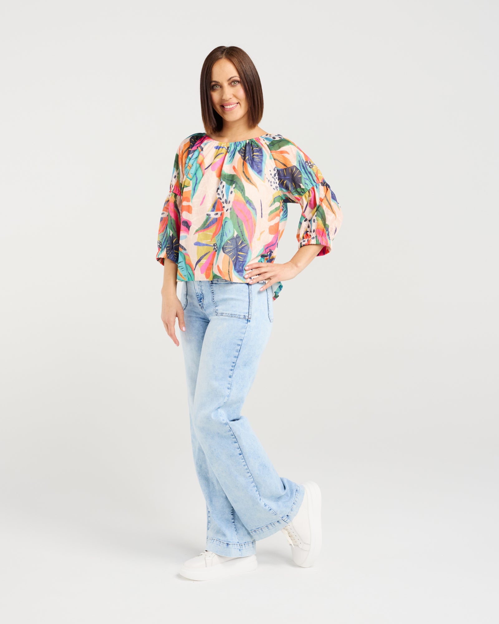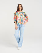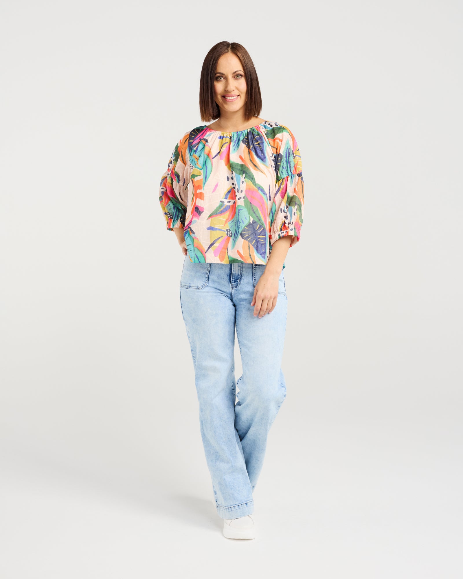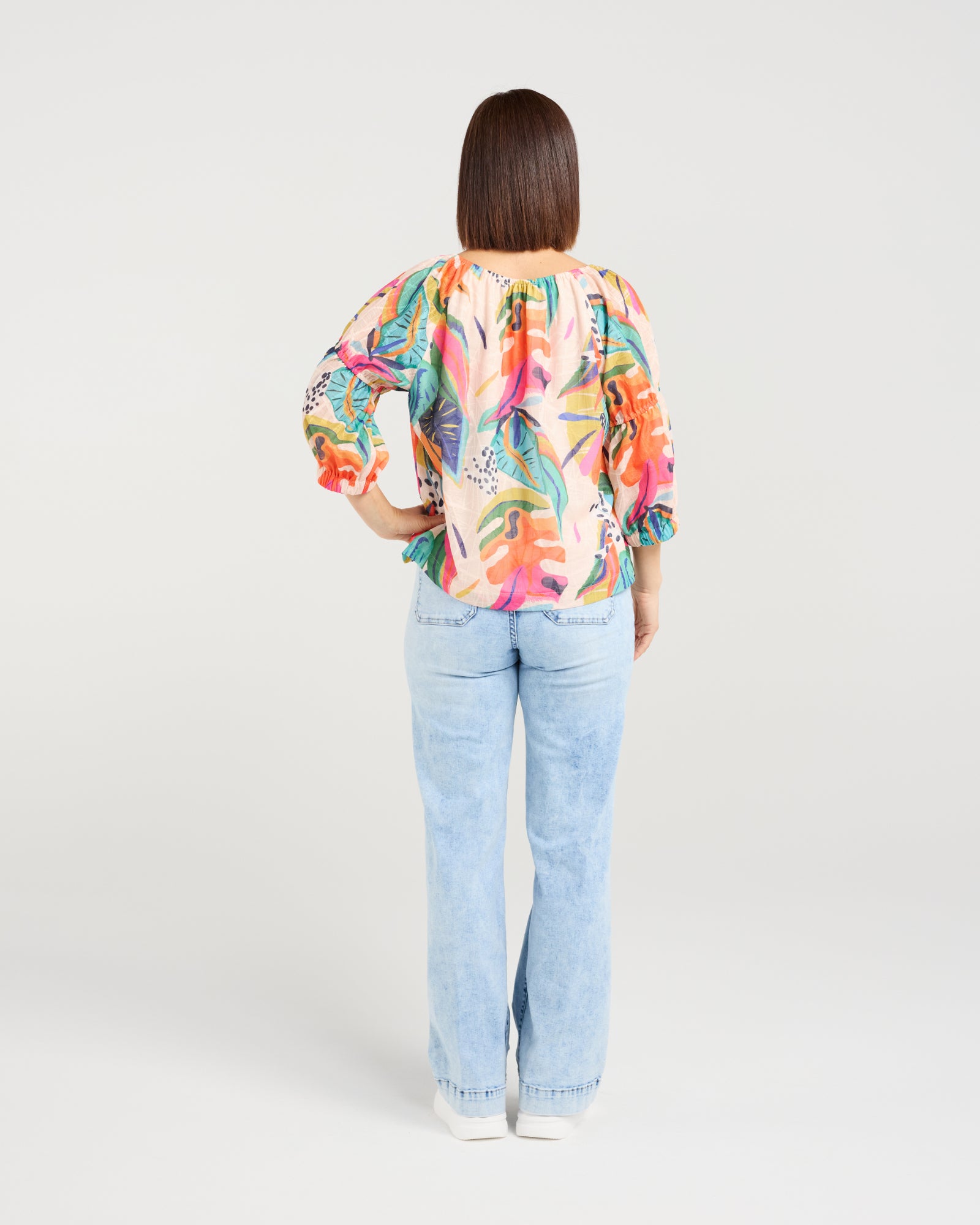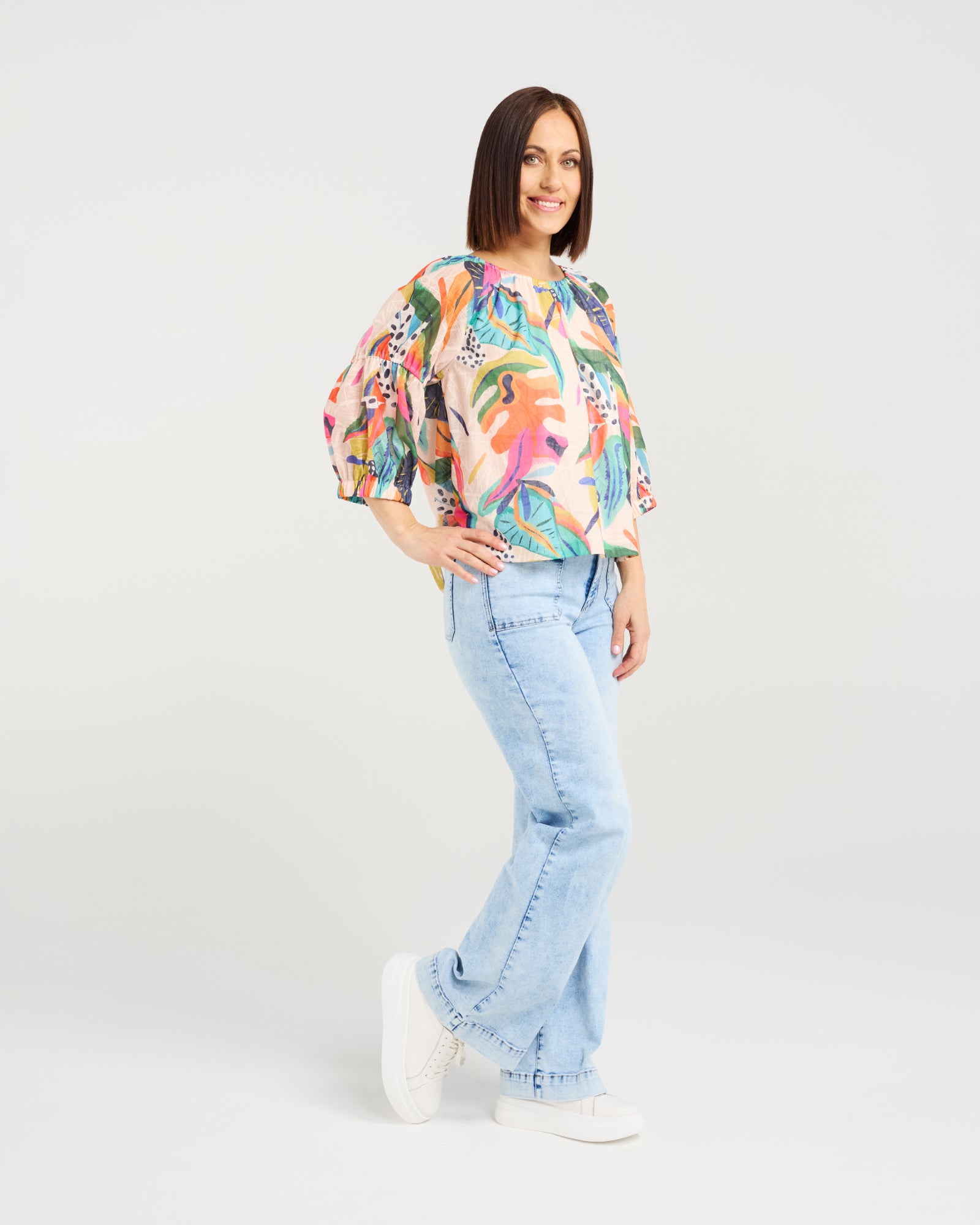 This top features elasticated three-quarter sleeves and hemline, with a fully ruched design all around, offering a stylish and flattering fit.